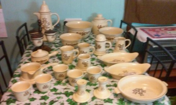 It's made by PFALTZGRAFF. There a Tea cattle, 3 mixing bowls, a sauce serving set with 8 cup. Theres also 3 candle holders, 2 coffee mugs , onions soups bowl with lid, soup bowl, 3 serving dishes, a salt shaker, creamer, and a cookie jar.
