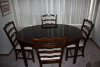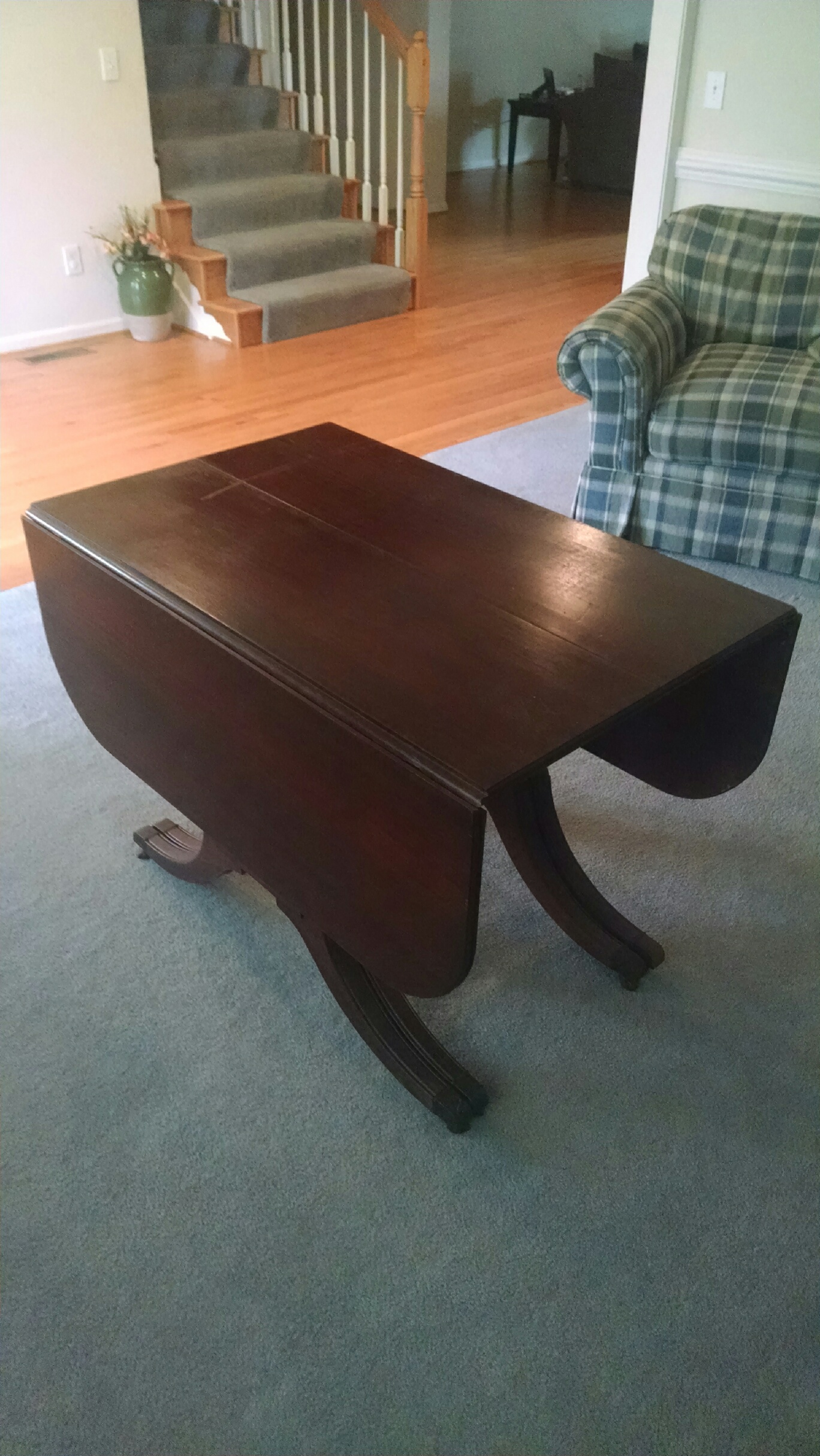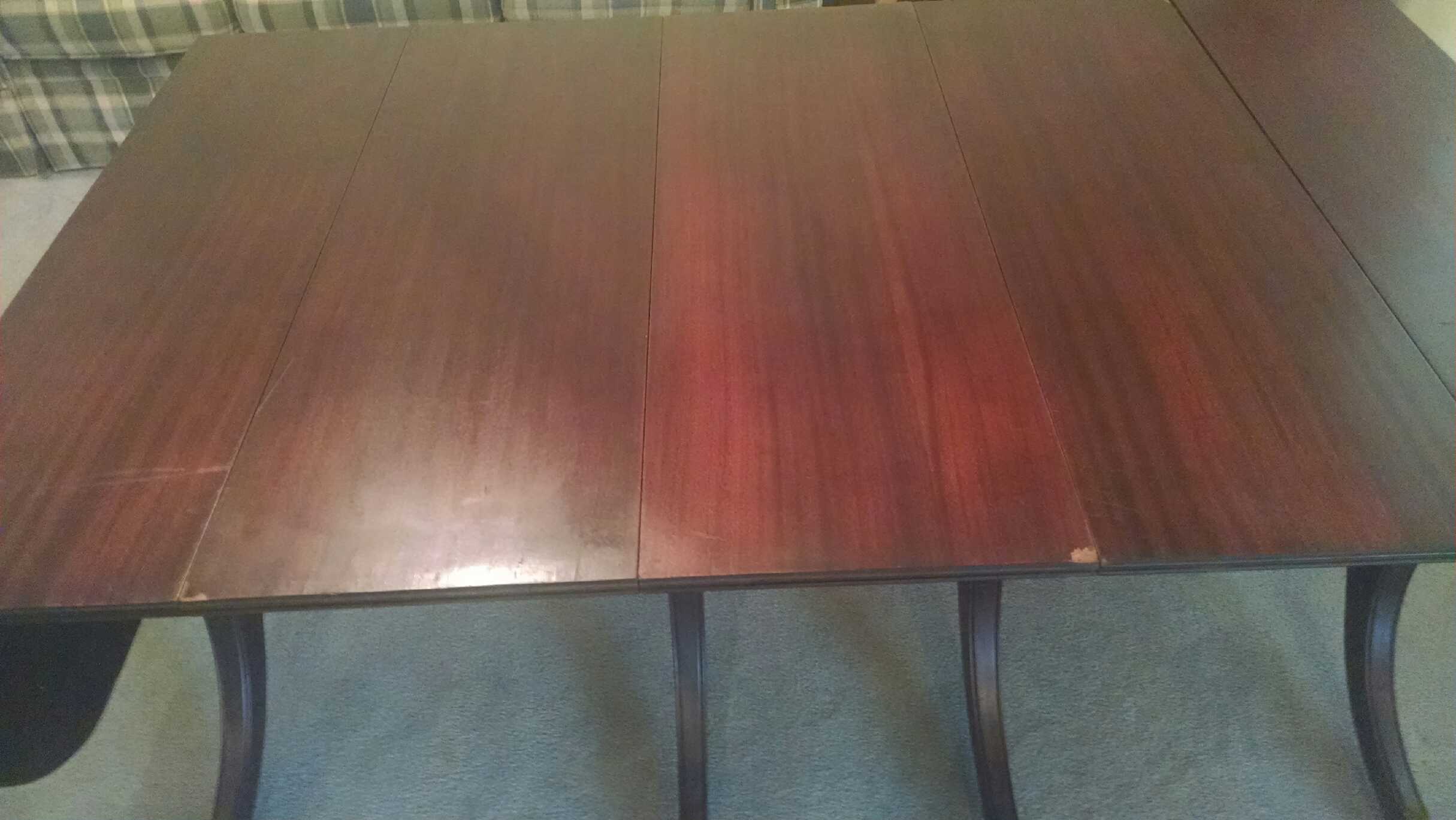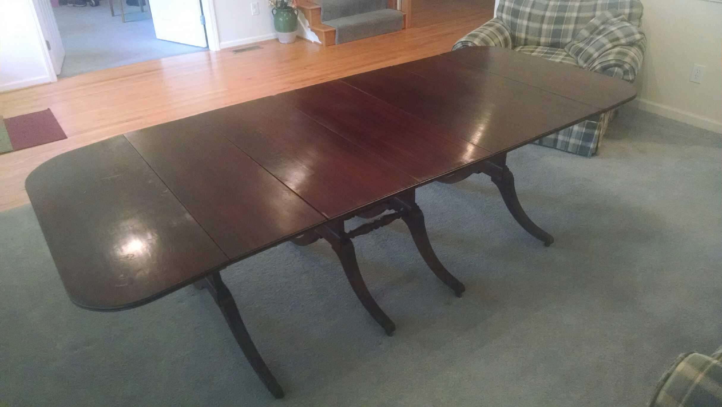 This antique table has castor wheels, three leaves and drop leaves on each end. The full length of the table with the leaves is 8feet 1 inch and 40 inches wide.