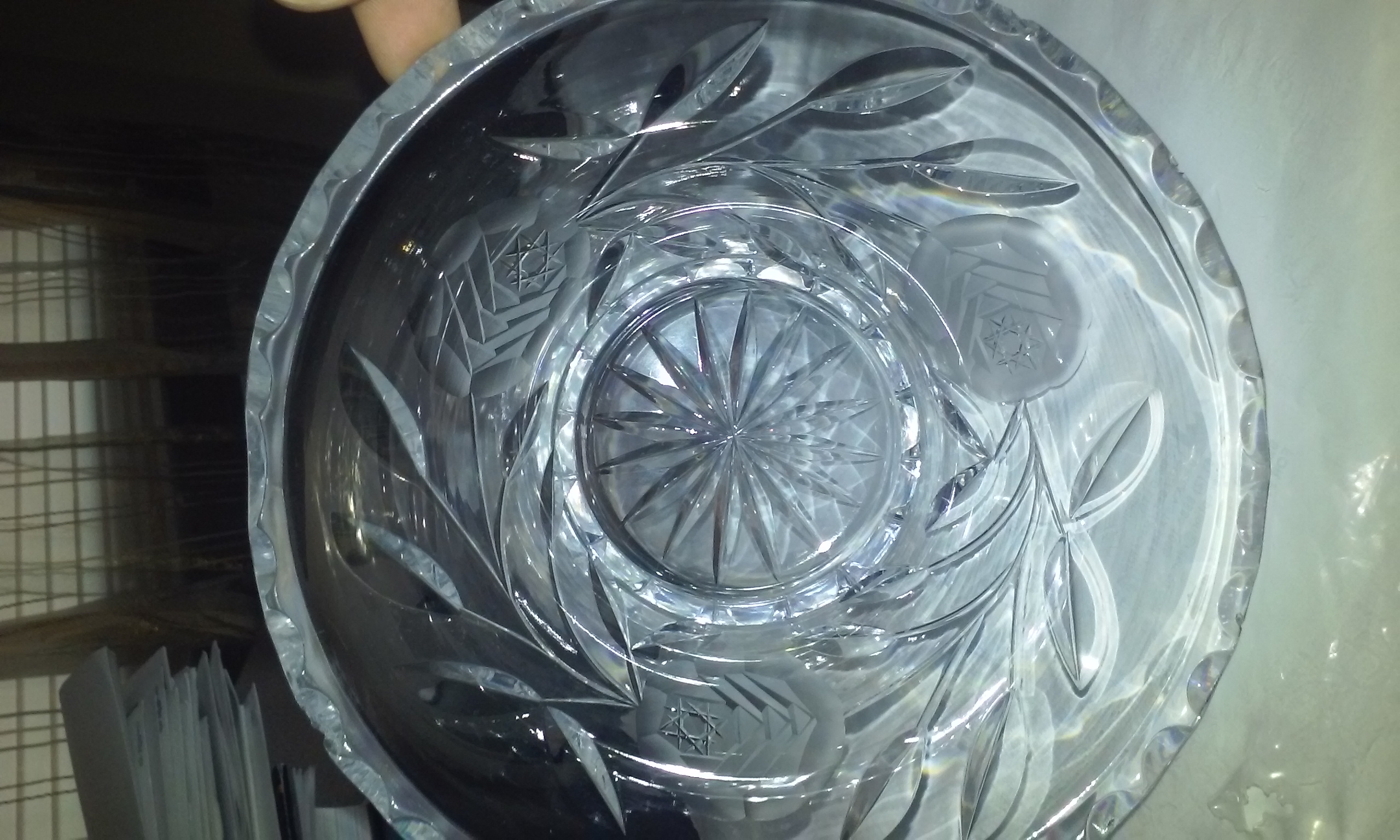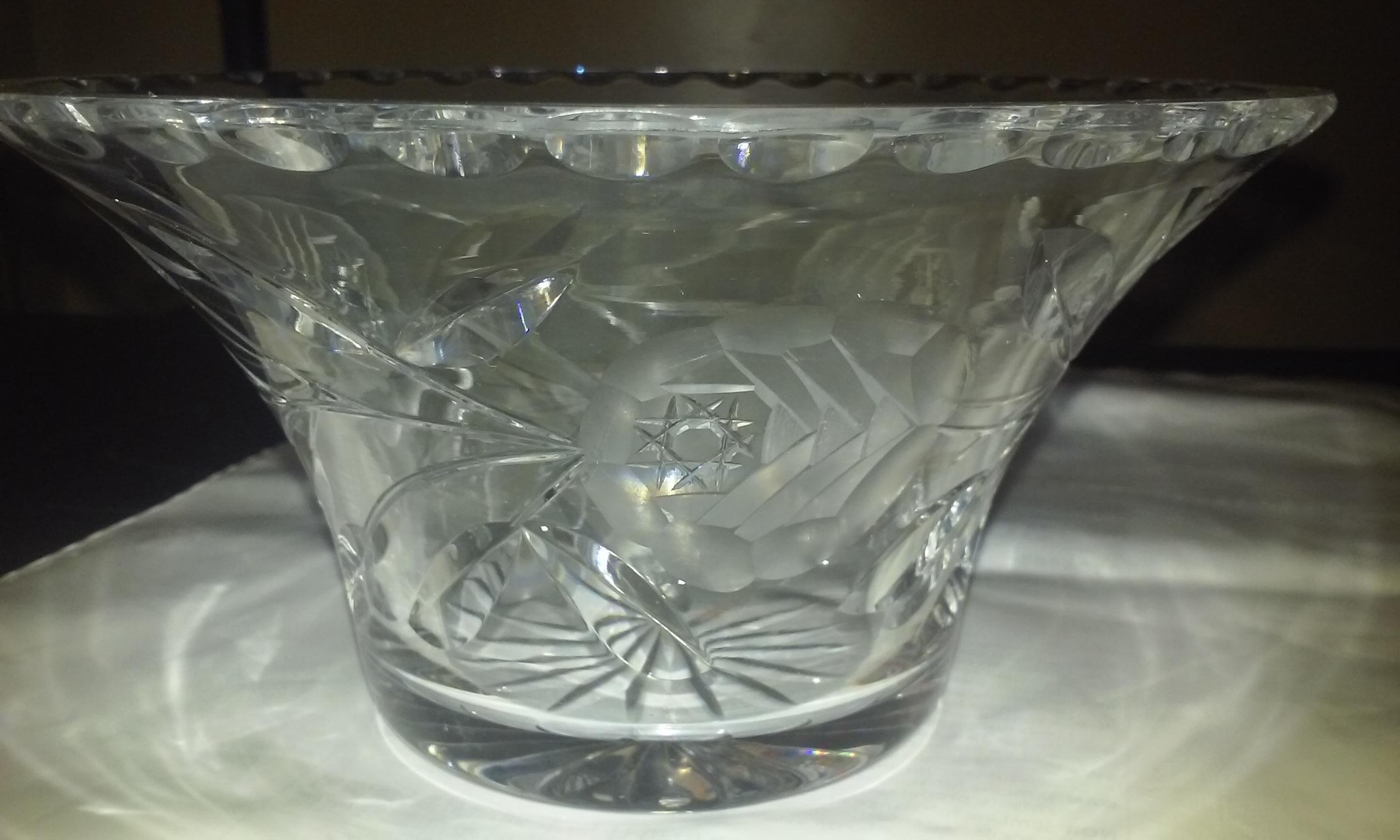 Its has three rose etchings and has a 8 pointed star in the middle of them.It is the size of a candy dish .
