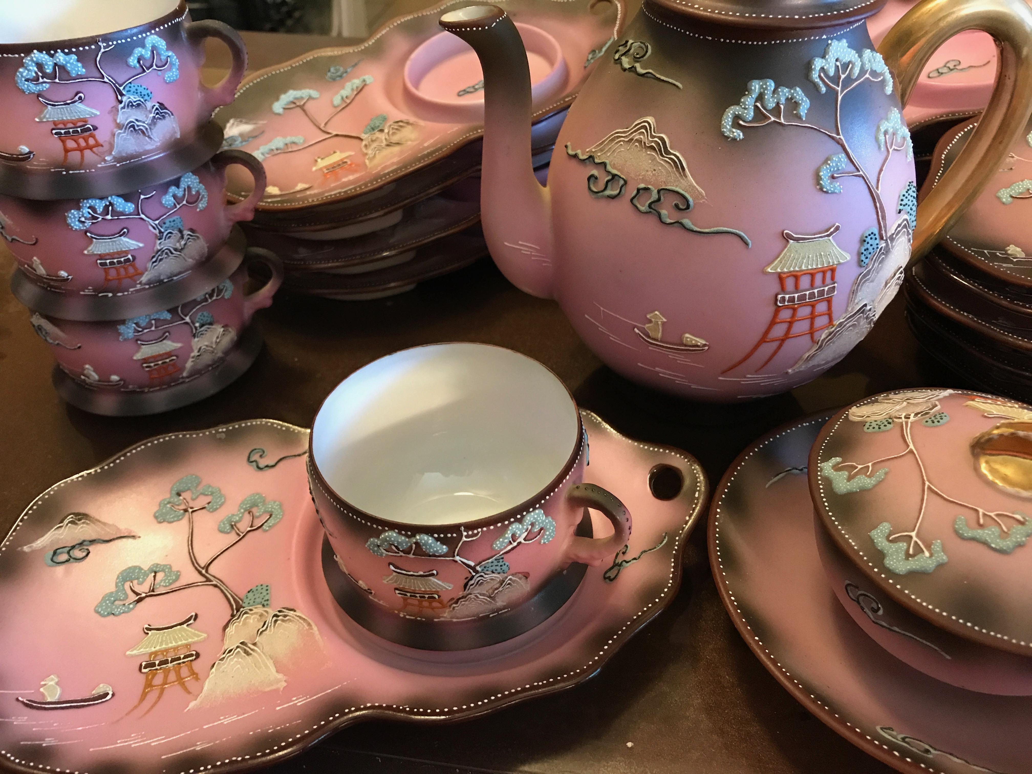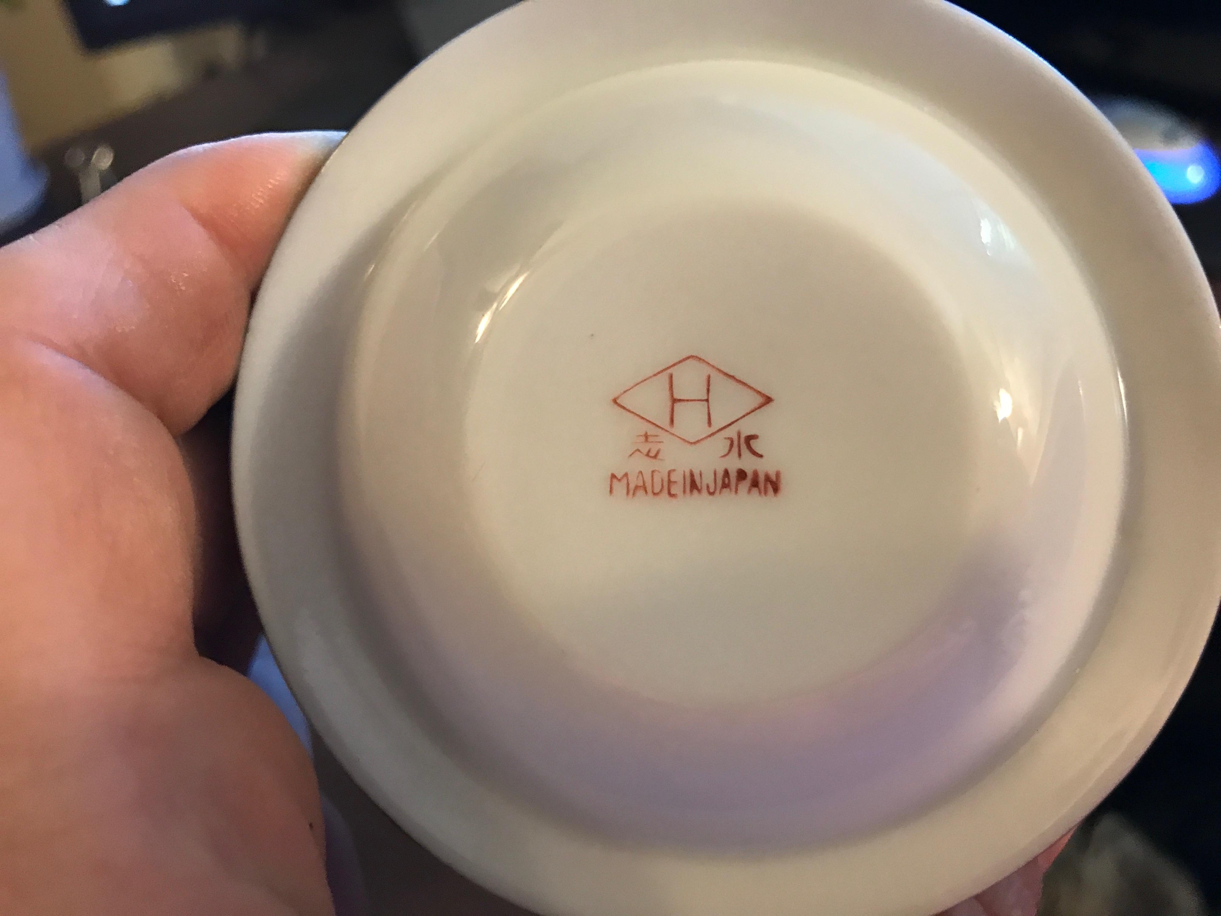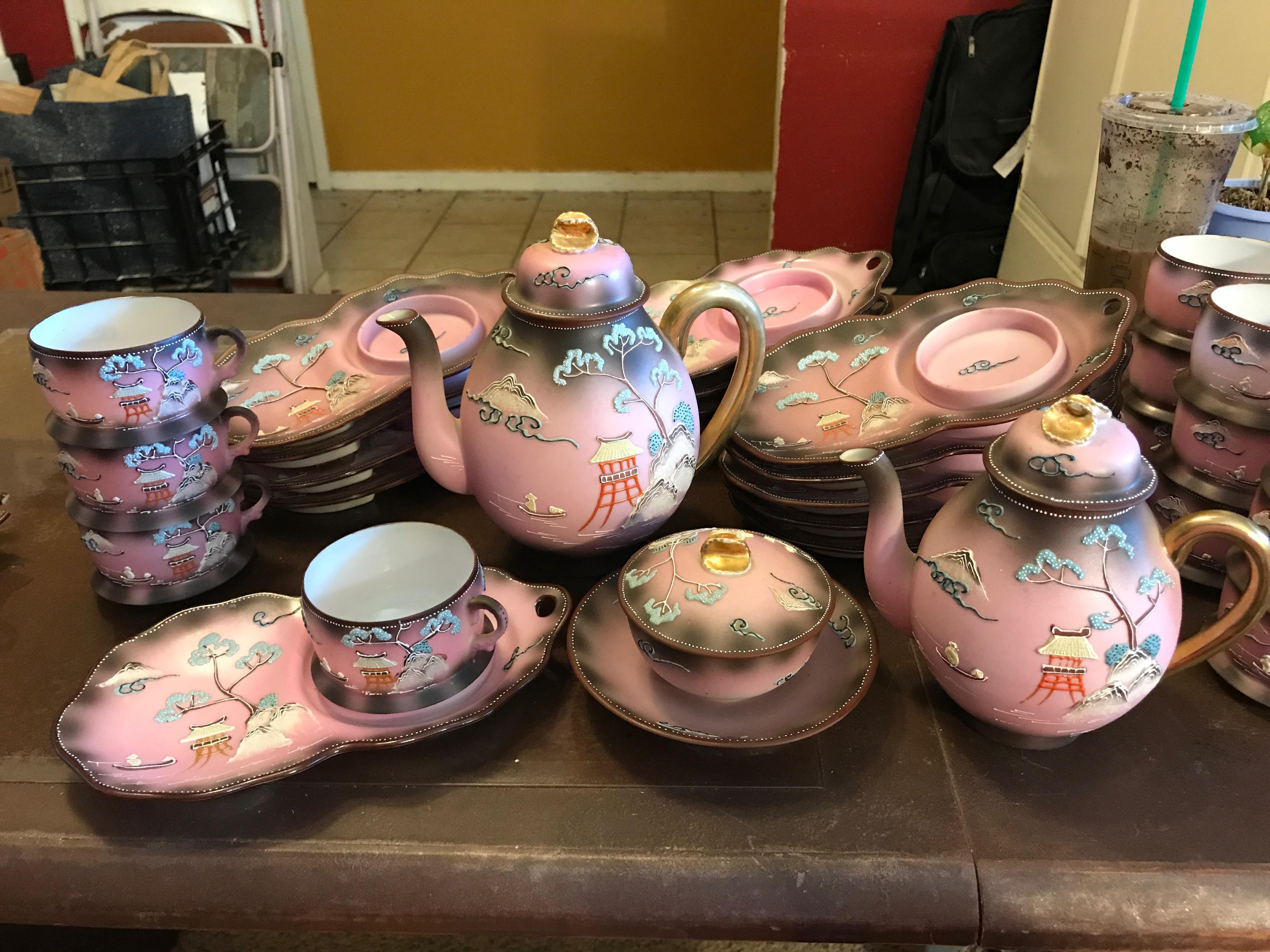 We found some interesting dishes in my grandmothers things and believe she bought them in Belize but are not certain since they traveled frequently. I have searched the internet and cannot find anything like it. Hopefully you can help. They may not be worth anything but I would still like to find out more about it since it has peaked my curiosity. There is a set of 12 cups and saucers (originally 14 but 2 are cracked) the cup fits into an indention to one side of the plate. There is also a tea pot, and what looks to be creamer and sugar. Some of the cups say "Made in Japan" and some have Asian writing so I asked a friend of mine from Japan what it said and she said told me it says "Made in China" We got a good laugh out of that.