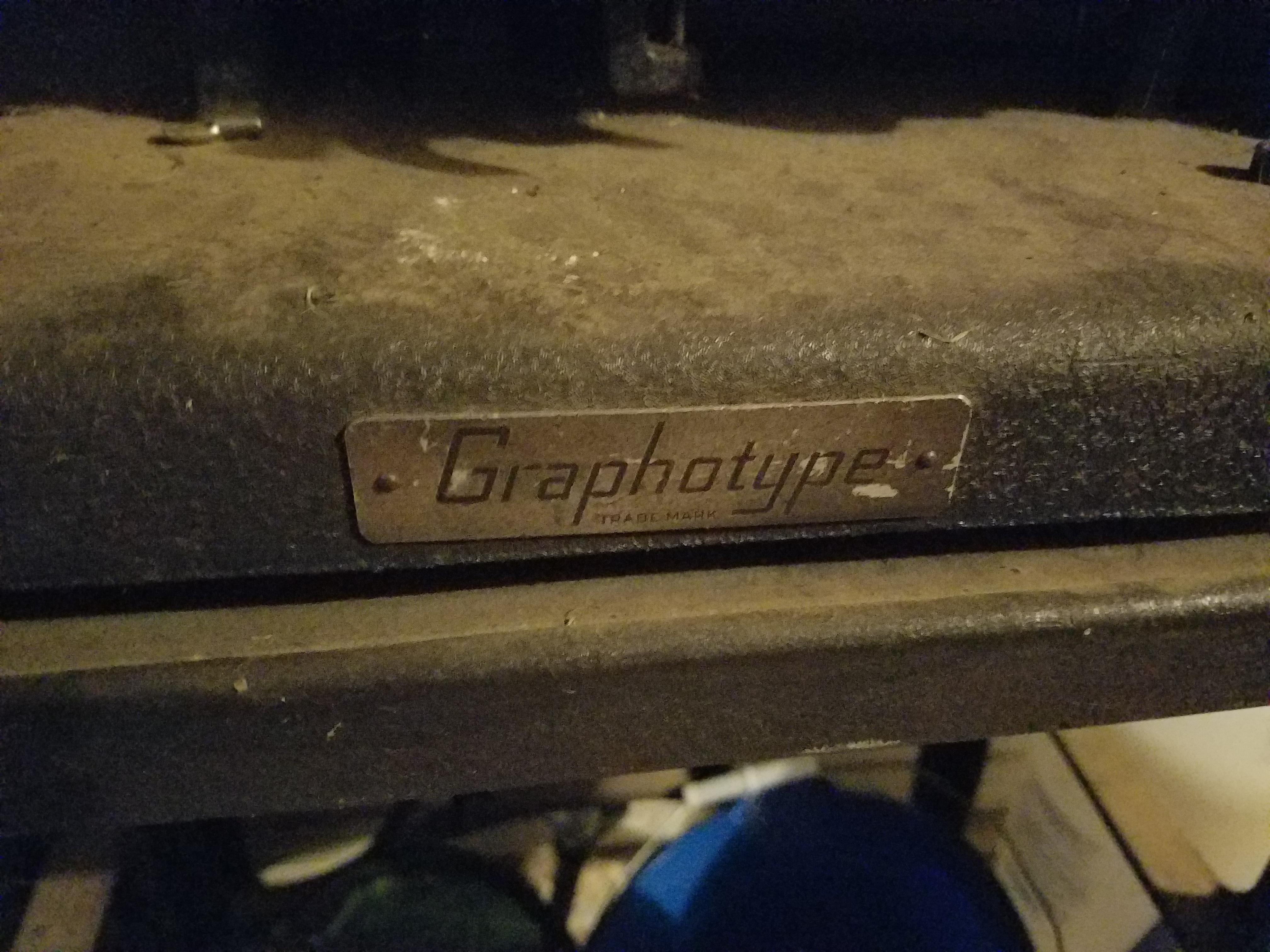I have this old dog tag maker we got from a post office in arkansas. It was basically left with no info about it. There is no brand name or markings of any kind except a single plate that says graphotype. This is a older one I'm told by the use of the turn wheel instead of a typewriter style. I have not been able to find someone not charging a arm and a leg to either date it or appraise a value for me. It is bolted to the stand it is on so it is quite heavy. It also came with a box full of the original metal plates for the dog tags.