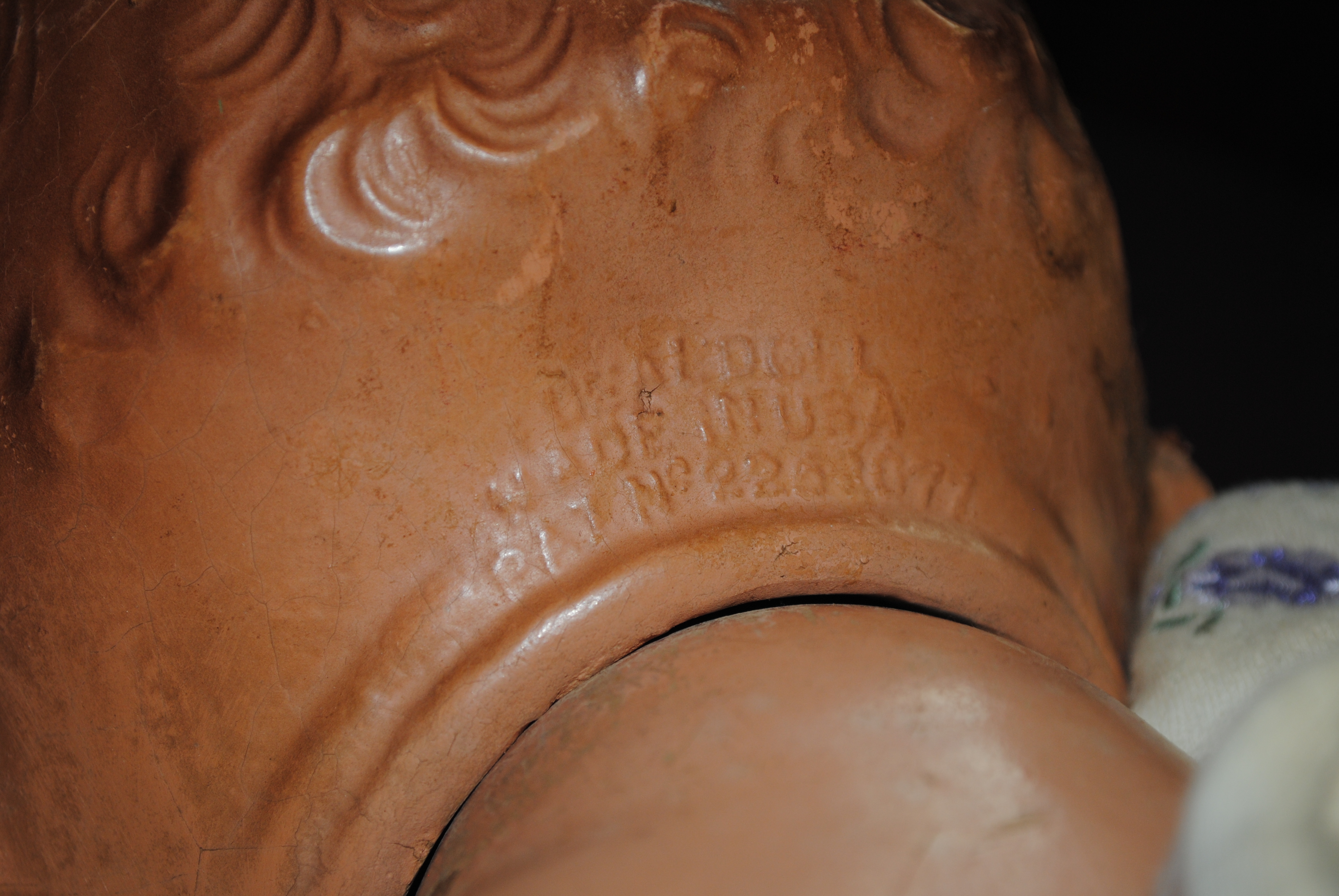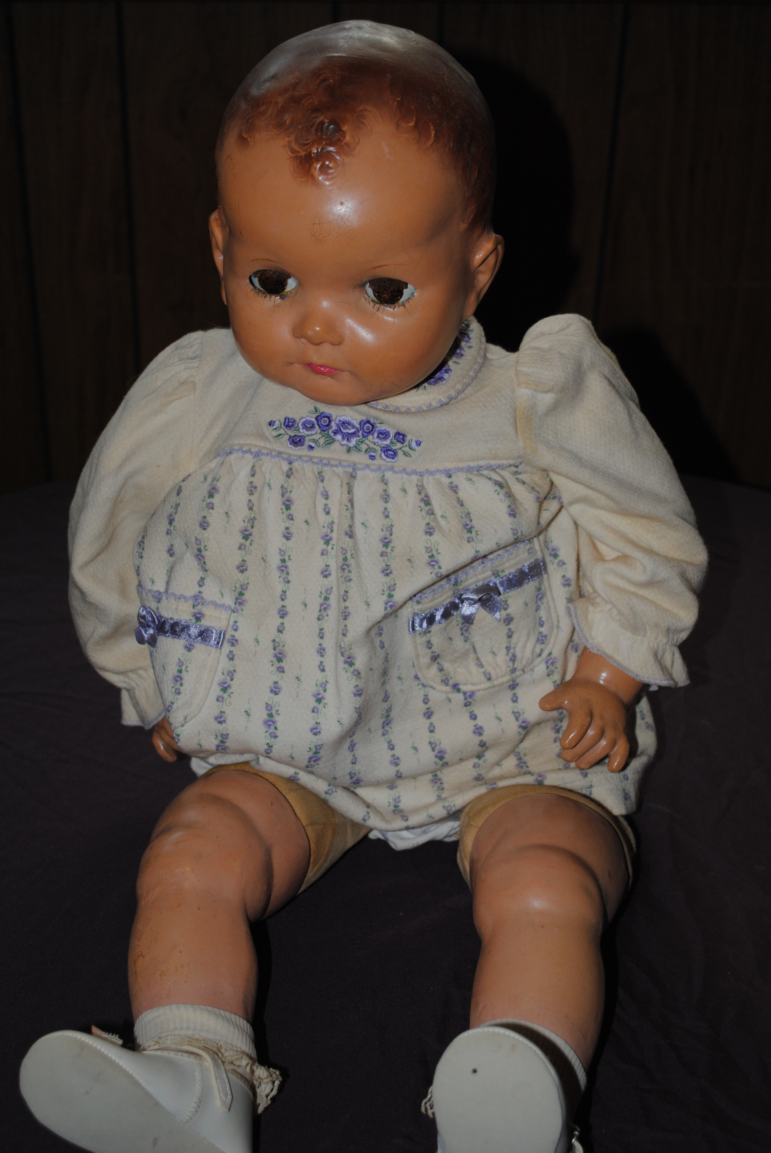 Your doll was made by the Ideal Novelty and Toy Company. The material used to make the head, arms and legs is called composition. It dates to the 1930's and looks very much like a doll called Baby Beautiful. although a slightly larger version. From what I can see in your photos it is in very good condition. If there are no large cracks or broken toes or fingers, my 20 years of experience would price him to be around $200.00. Keep him in a controled environment with even temperatures to prevent further deterioration. Water is not his friend. Hope this helps with the family heirloom.