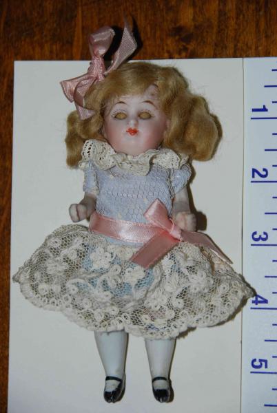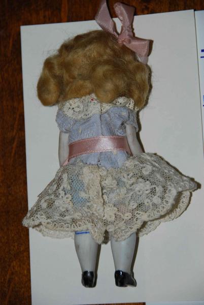 The doll is 51/2 inches high, has brown eyes that open and close. Ceramic head, arms, legs and original clothing. The doll is possibly British in origin as it belonged to an elderly lady who came to America at the age of 5 with her family. The family settled in San Diego and remained in California from then on. Other than that there is no information with regard to the doll except that it is in good repair, however the maker of the doll is unknown.