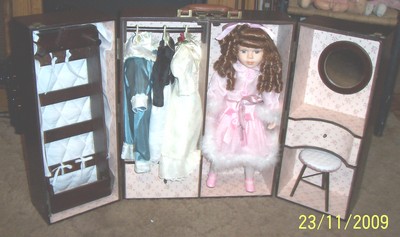 The doll has a cloth body with Bisque, Head , hands and feet , from the knee's down, Blue Glass eyes and a great wig. come with really great outfits , part of the cabinet comes down like a trundle bed and sticks out of the case for her to lay down on ..and the other side is a vanity with set .