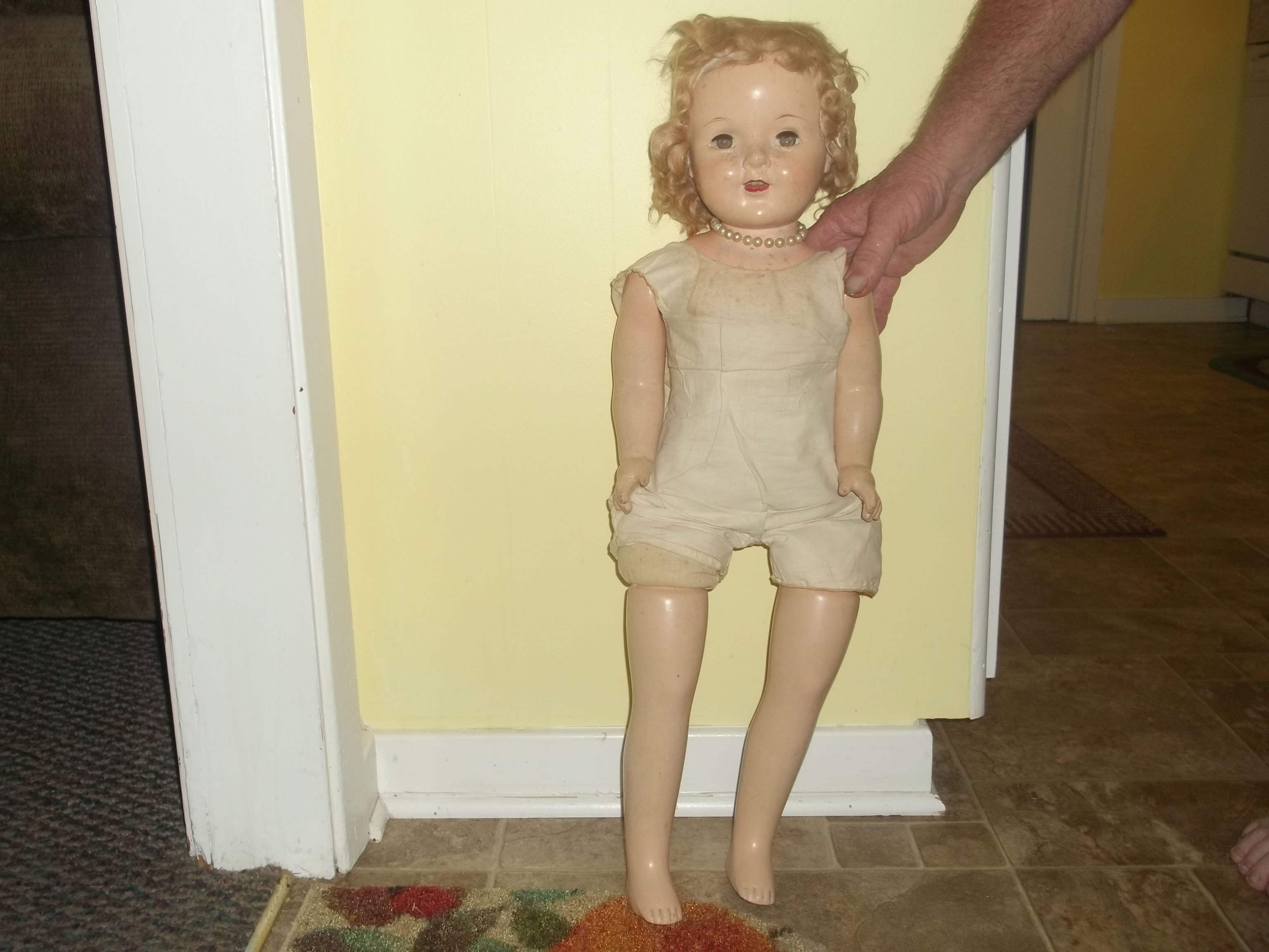 This doll stands approximately 29 inches in height. I have not been able to locate any visible marks as to the maker of the doll. She has composite arms and legs. Her eyes move from side to side and up and down. She has teeth that move when you push in on them. She has lipstick and a bow in her curly blonde hair. She , also, wears a set of beads. If anyone knows any kind of information as to the maker, her name, production date, value, etc. , I would greatly appreciate it.
