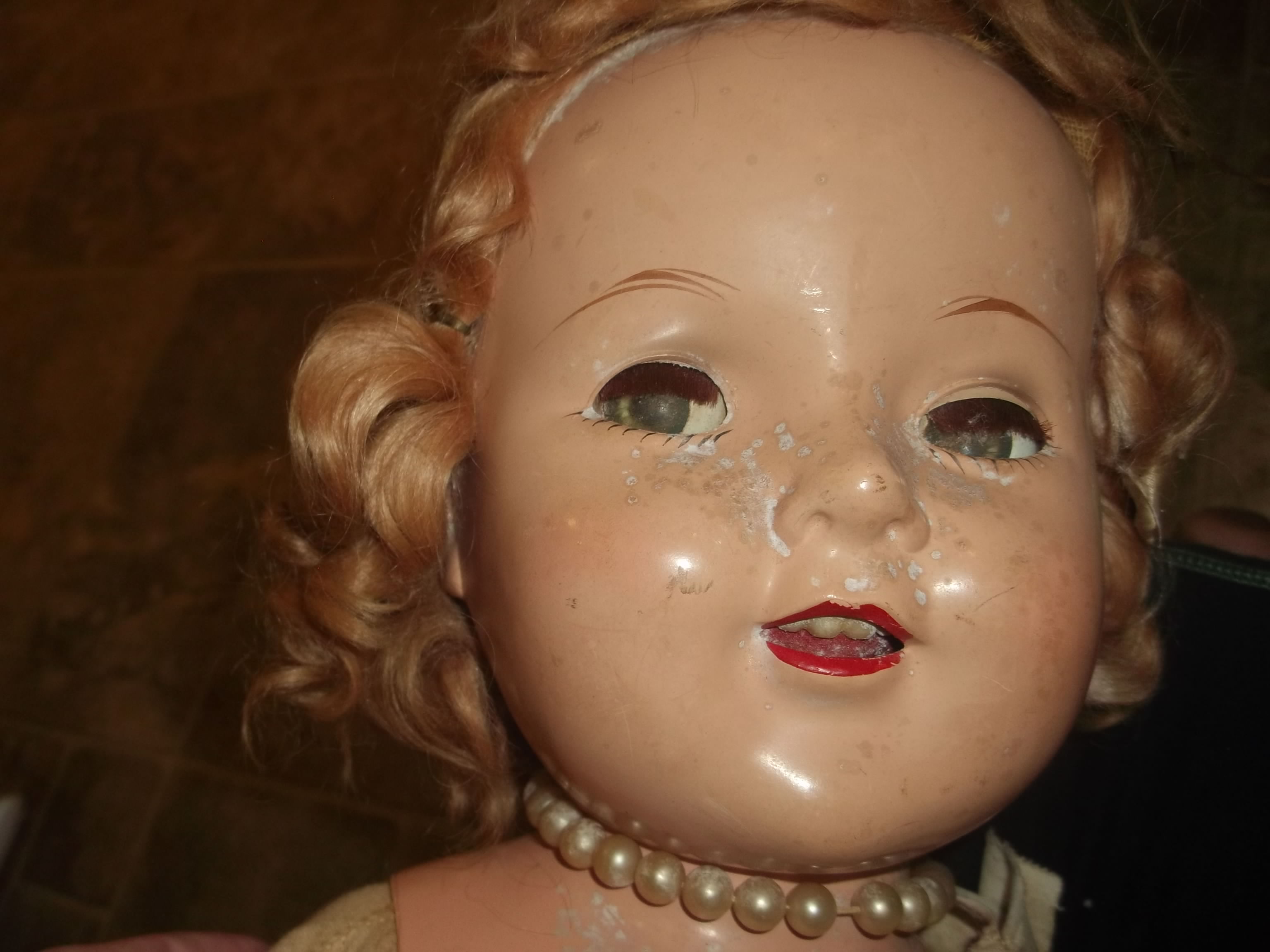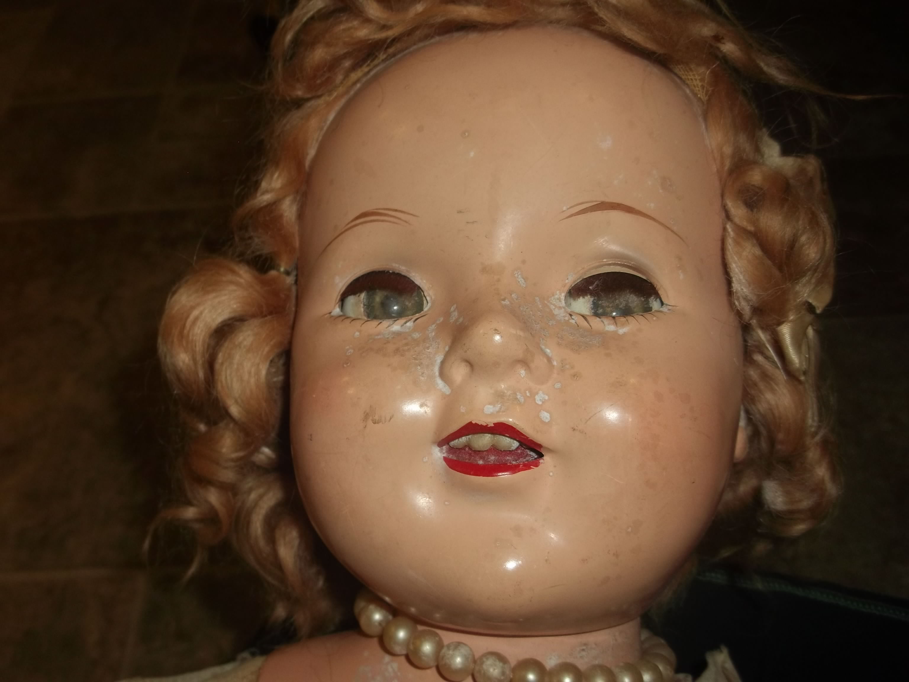 Your doll is a Shirley Temple look a like from the 1930's. She appears to be in very good condition although her value would greatly increase if you had her face professionally restored at a doll hospital. Her eyes are called flirty and were intentionally designed to move back and forth. Her size is not very common either. In her current condition I would price her around $125.00 after professional restoration her value would double. Keep her in a controled environment to prevent further deterioration, water is not a friend to composition dolls, and don't push on her teeth anymore let a doll hospital take a look inside to see what's going on with them.