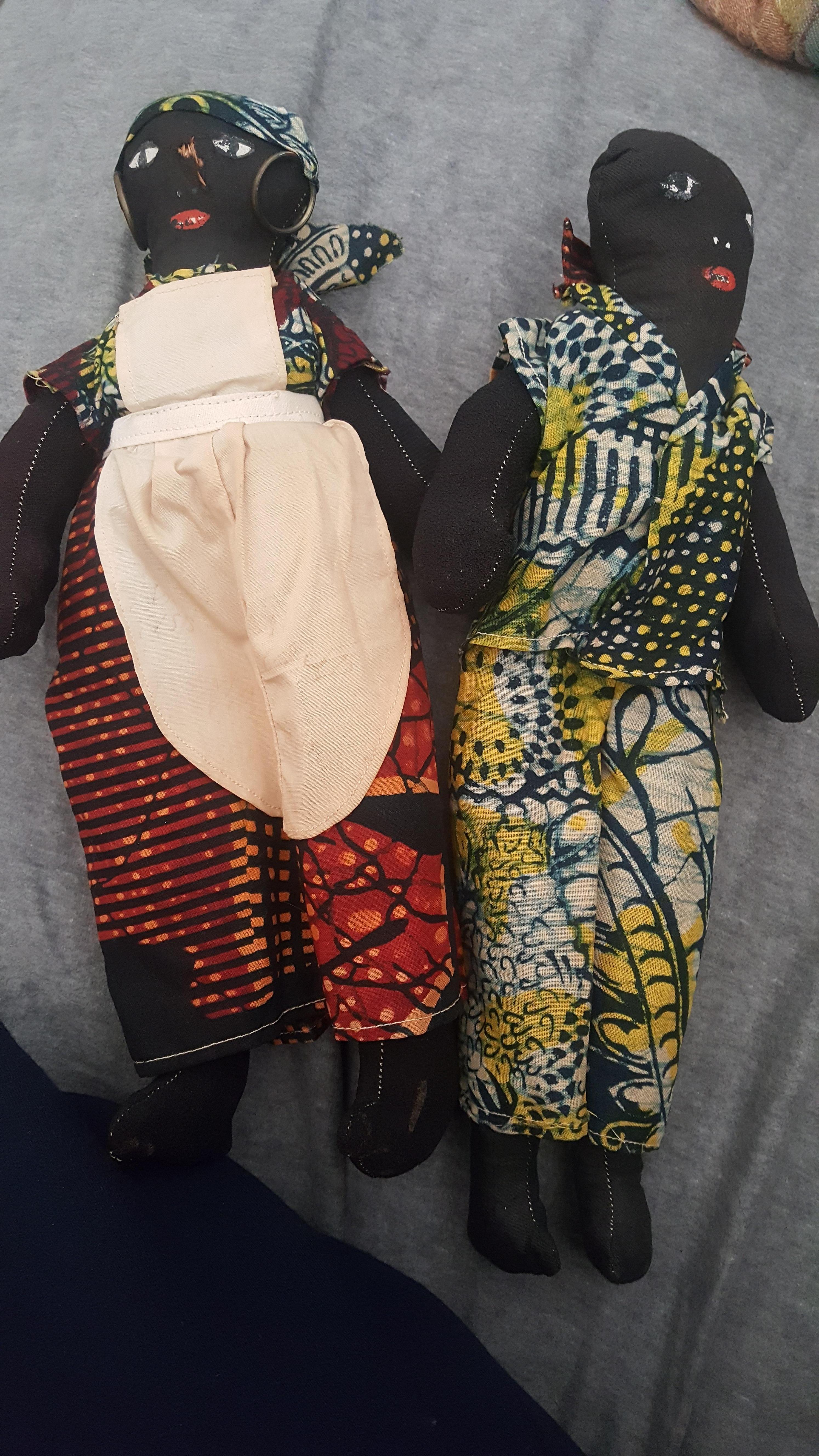 the male 10-25$ . females listed as aunt jemima have been bringing 15-35 . i have trouble selling these . i don't know these well just approximating the completed auctions that sold , from what i saw on ebay. these may take a long time to sell when u decide to sell them. the nice painted faces and brigh colored clohes look nice on these. if yu listed them on ebay the set might sell for 30-50 on ebay .