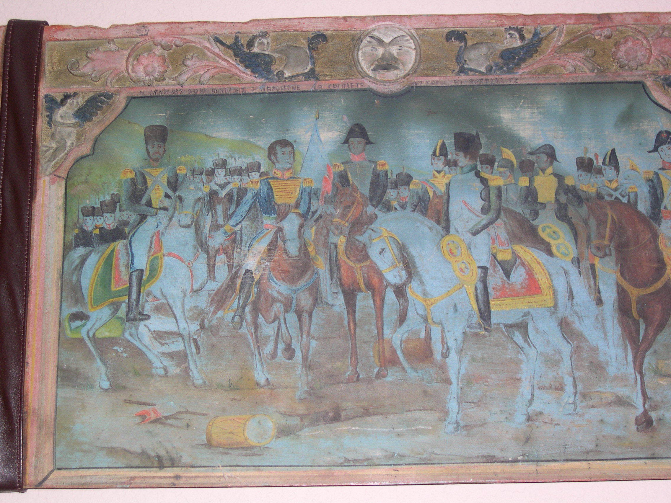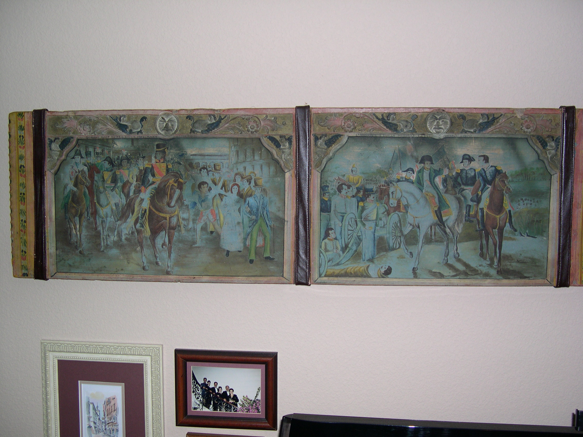 My wife, Gale inherited two antique donkey cart sides with scenes depicting Napoleon’s entrance into Firenze after crossing the Alps. I do not know the date of the cart sides but my wife’s brother befriended the wife of the American Ambassador to France in the 1940's and we were told that when he retired, the French Embassy gave him the cart sides as a gift. My wife’s brother inherited them in the early 1960’s and he passed away in 2003 leaving them to us. We are concerned that they may be very valuable and if so, I need to have some sort of price for insurance. They have been displayed on a wall in the house for years and we are worried about preservation of the panels. Would you also have any access to an appraiser? We are curious as to their worth.