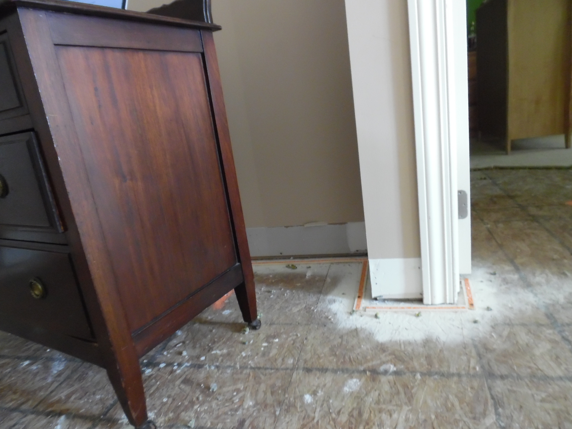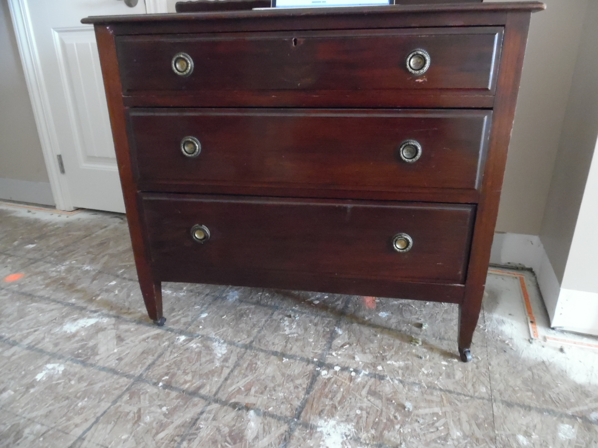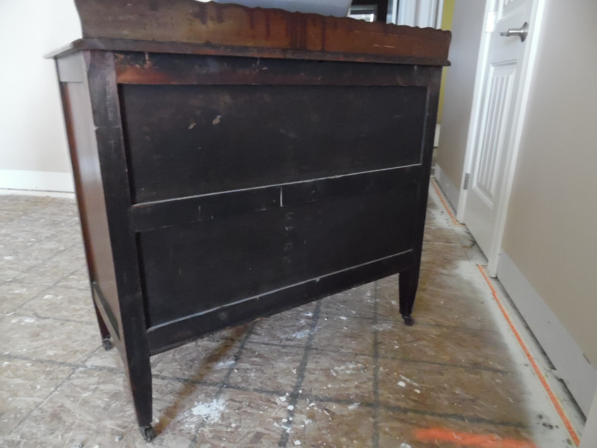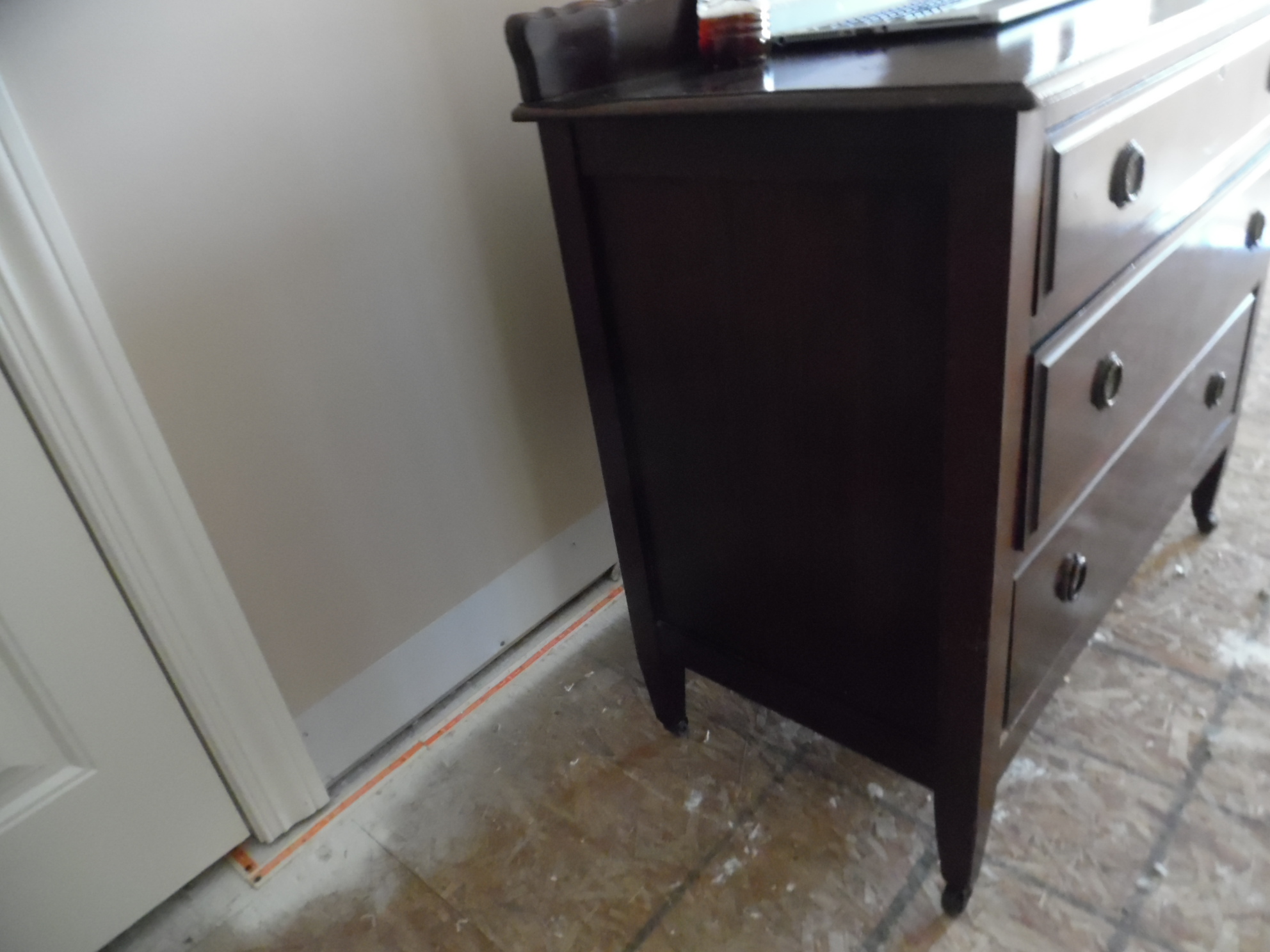 Antinue dresser with some water damage to legs and slight swelling due to water damage.