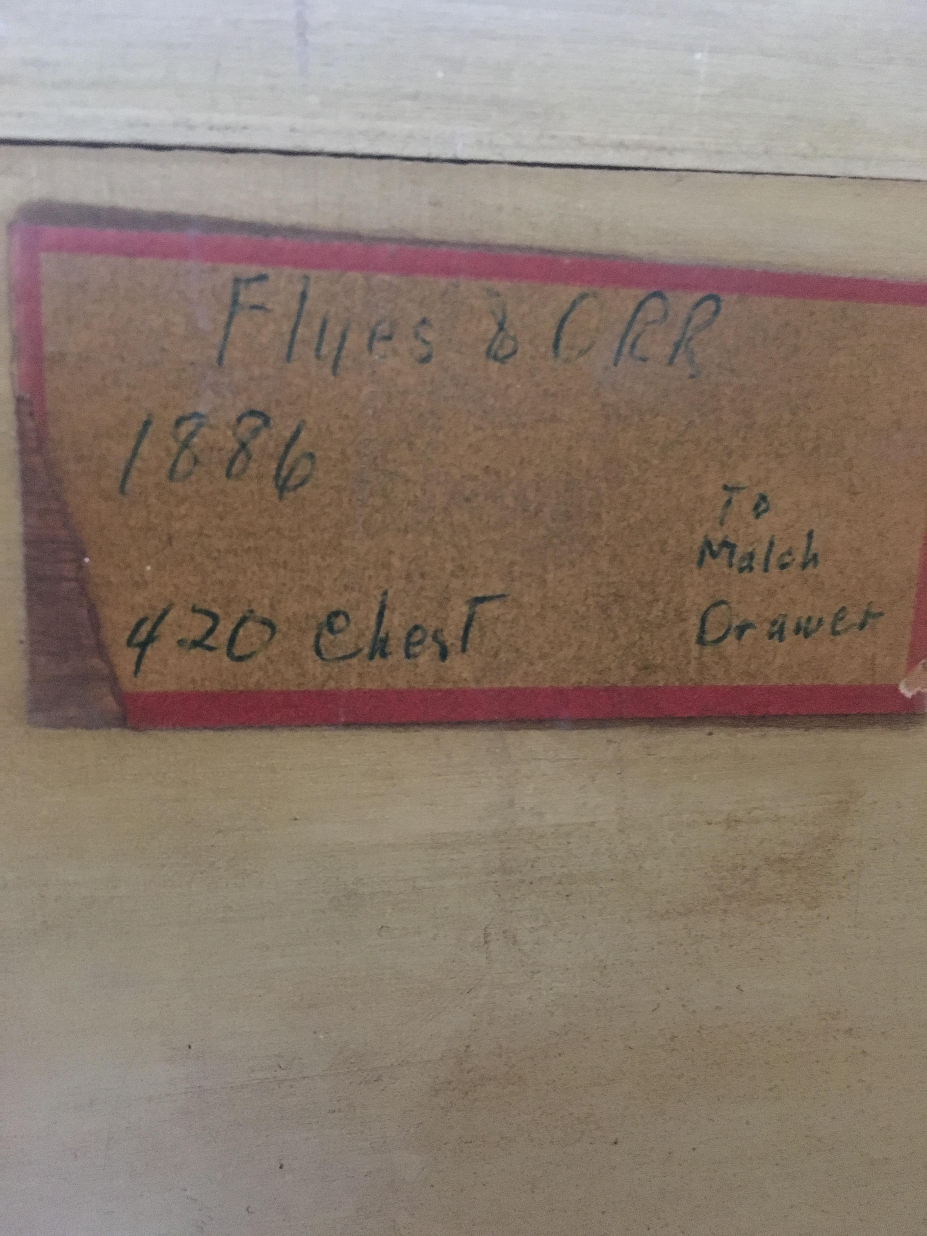 Distinguishing marks Handwritten marking on back appears to say “Flues & Orr 1886 420 chest To March Drawer”