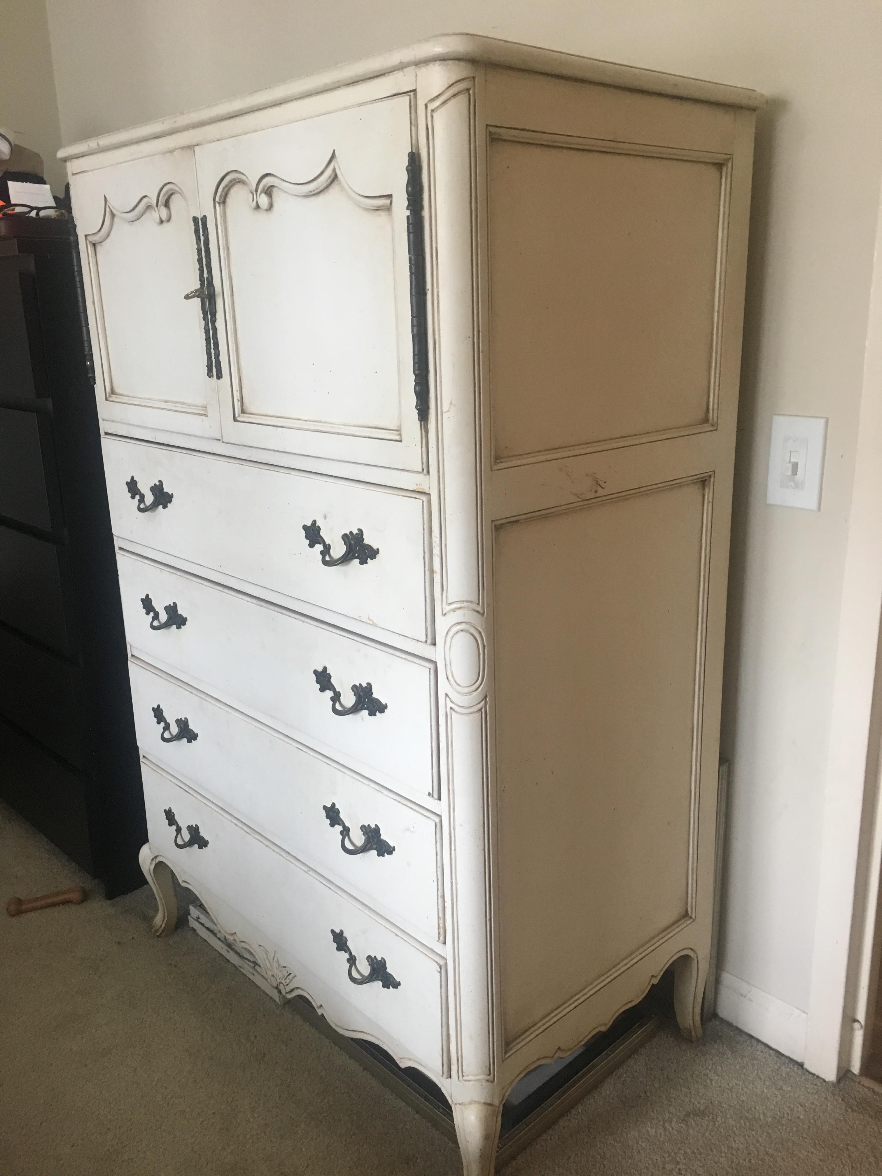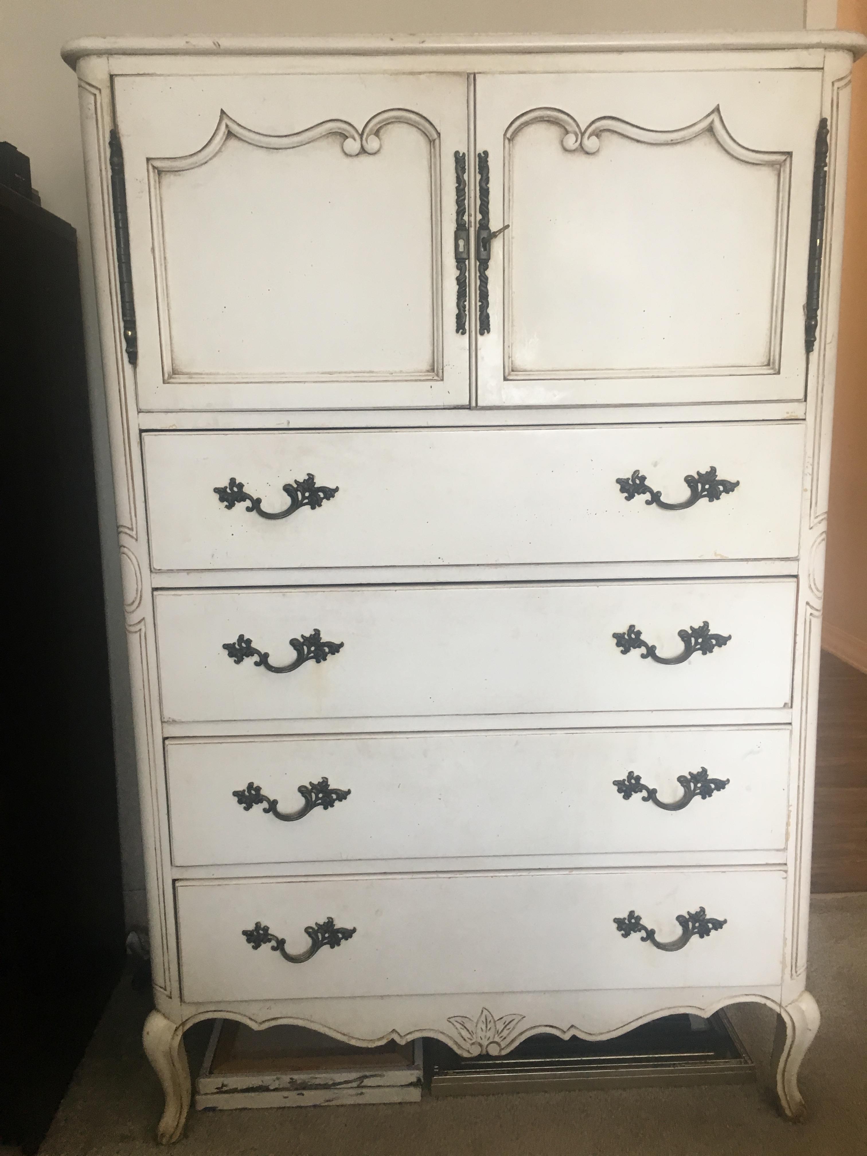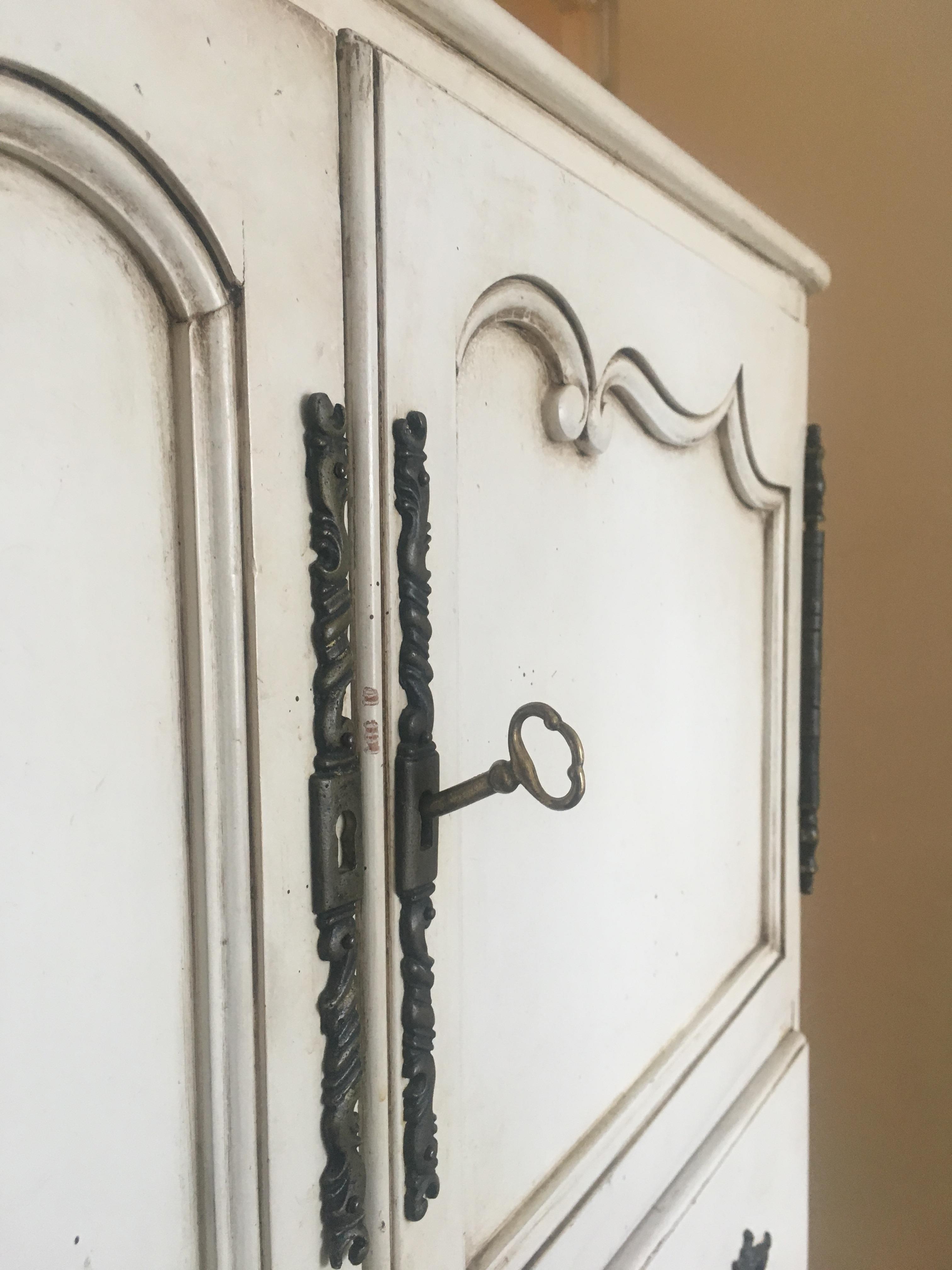 Tall white dresser with four large drawers (lower) and three small drawers (upper). Ornate carvings and decorative key. Dovetail joints.