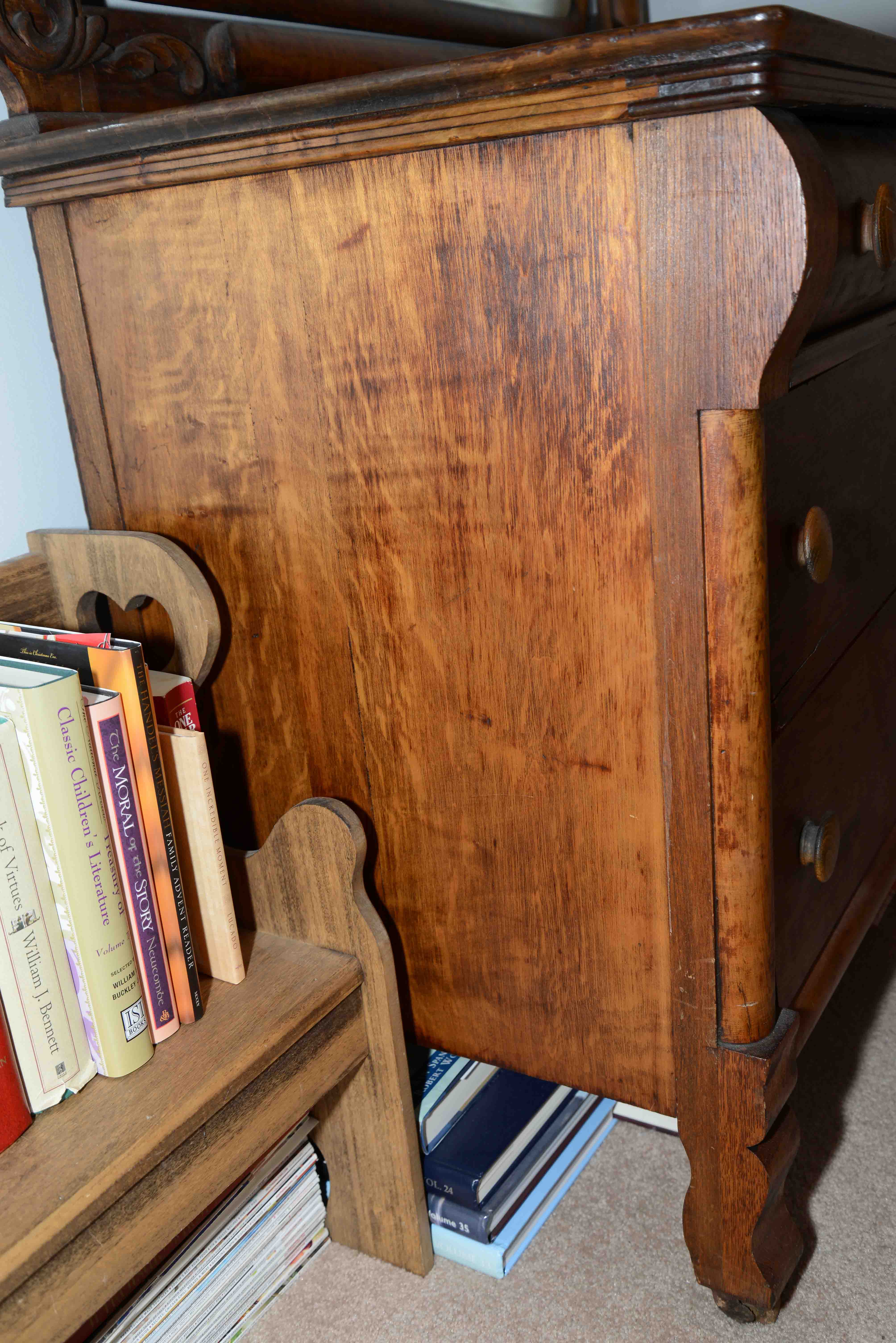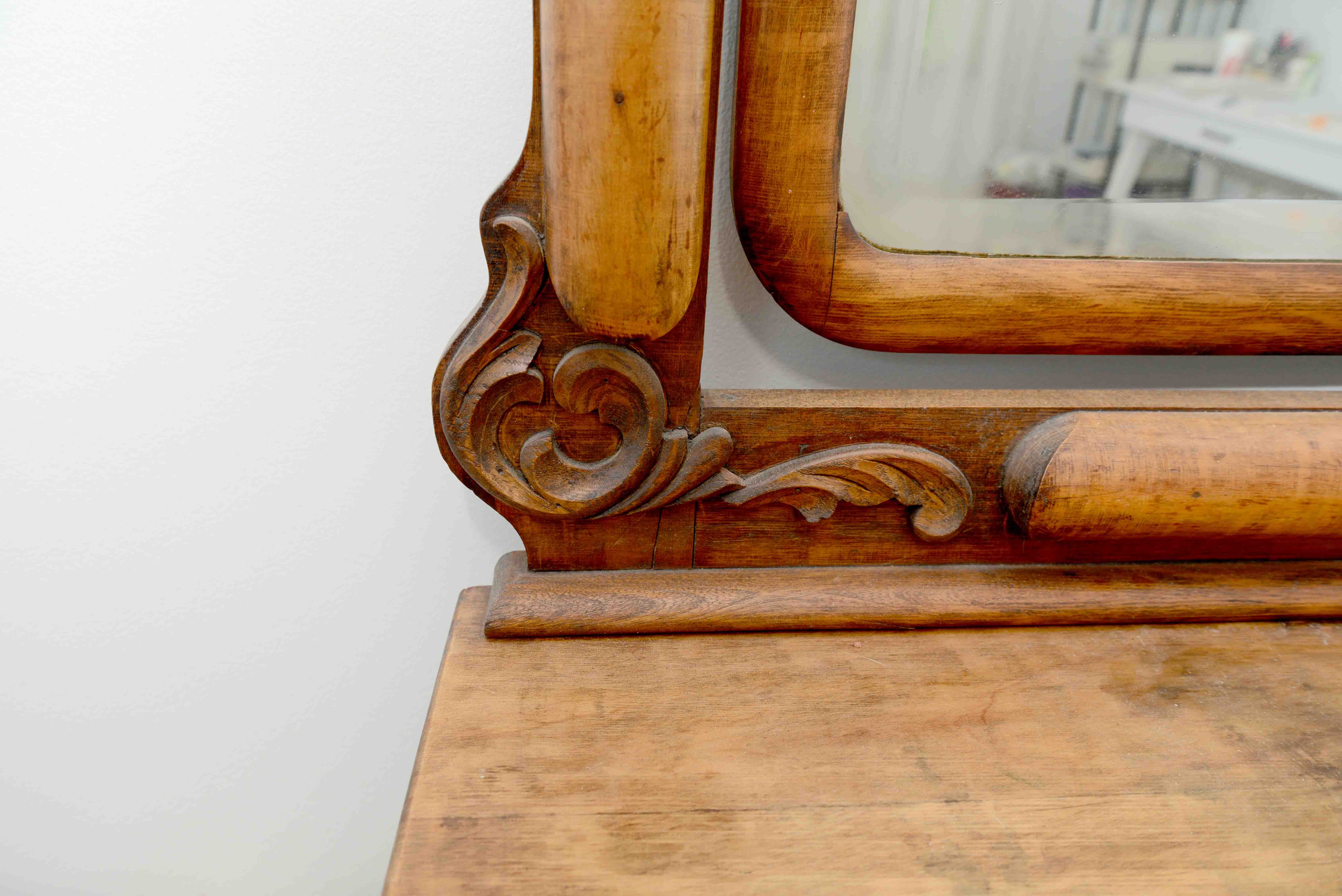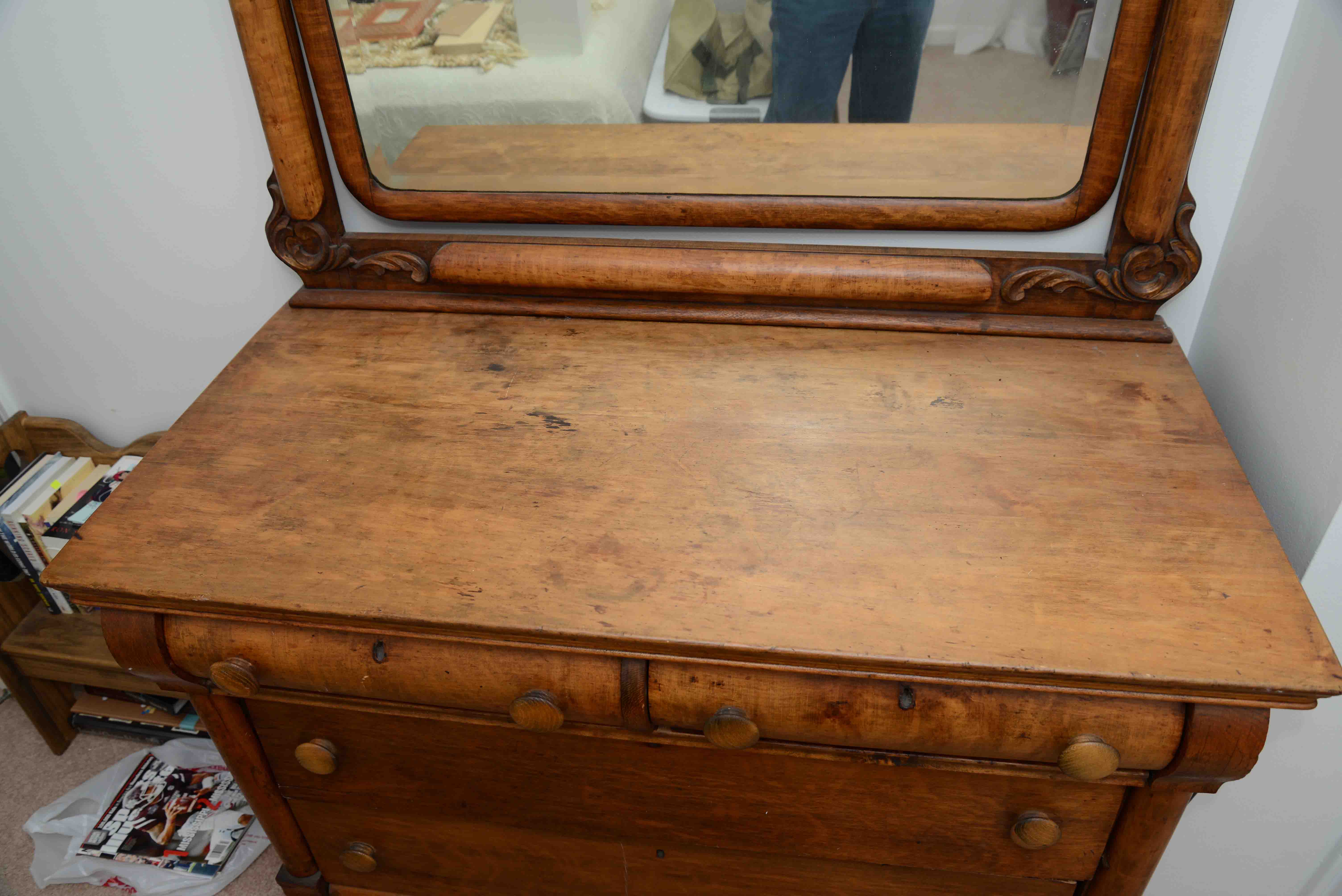 Oak? dresser with beveled mirror. Drawers have dovetail joint construction. Top drawers have locking mechanism. Round fronts on top drawers. Original casters and hardware.