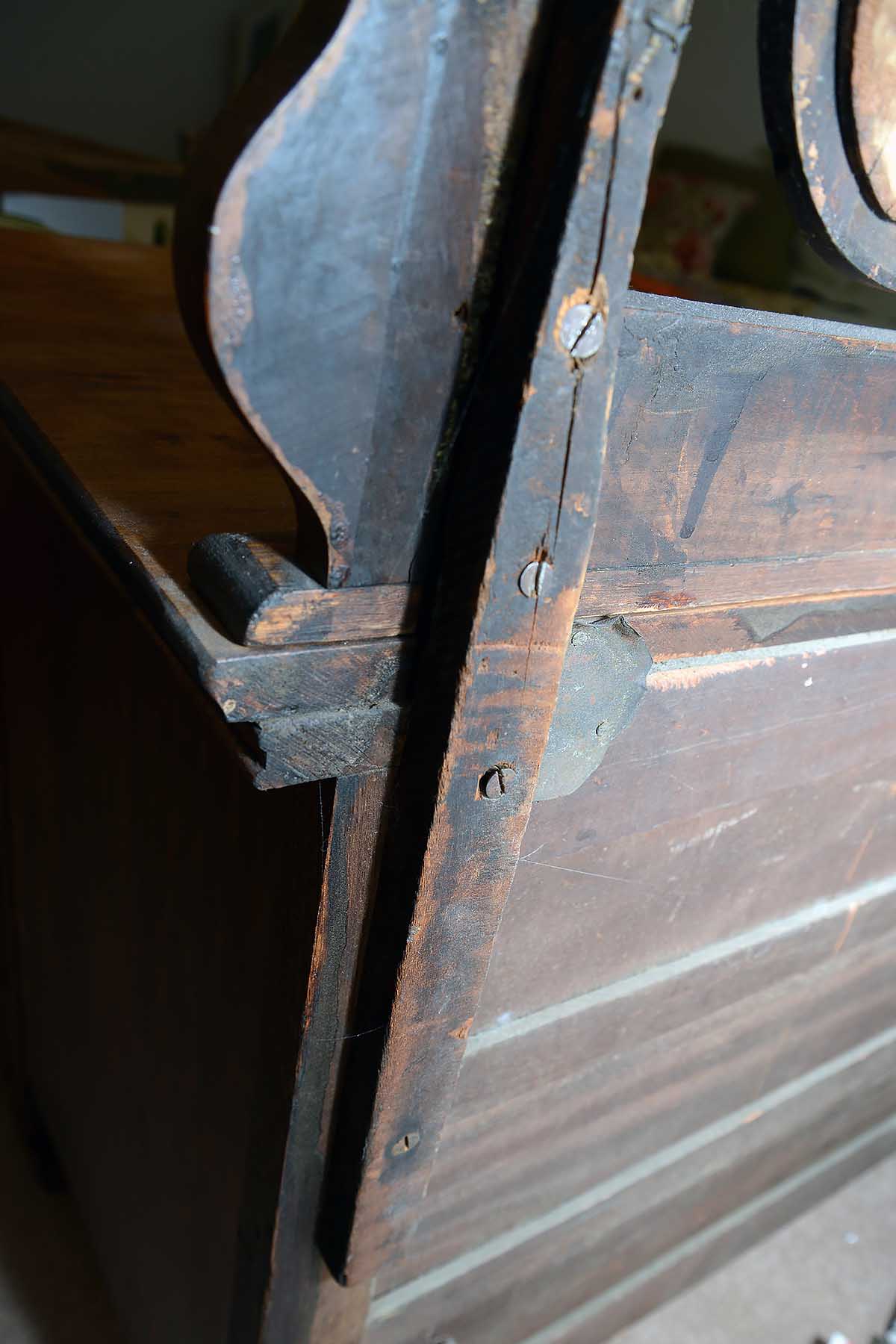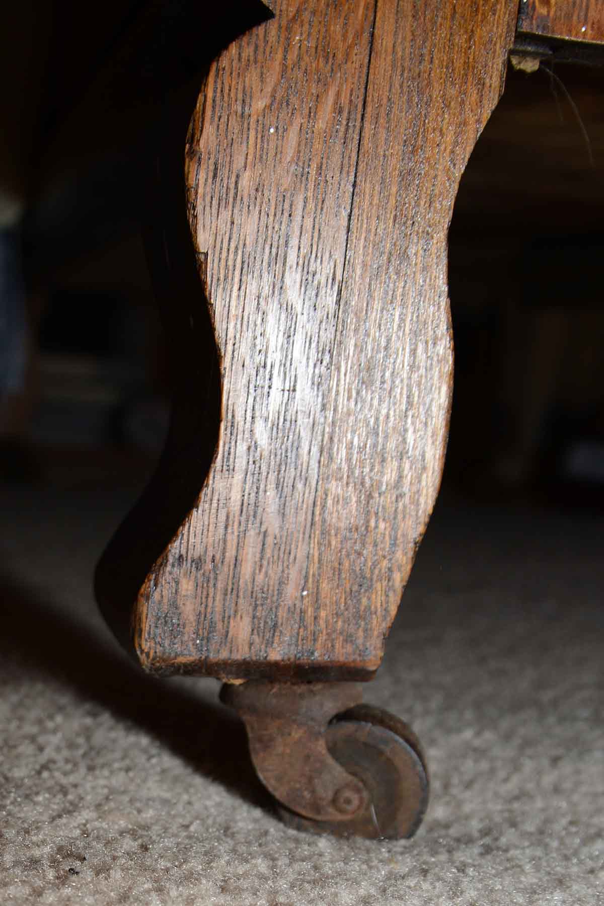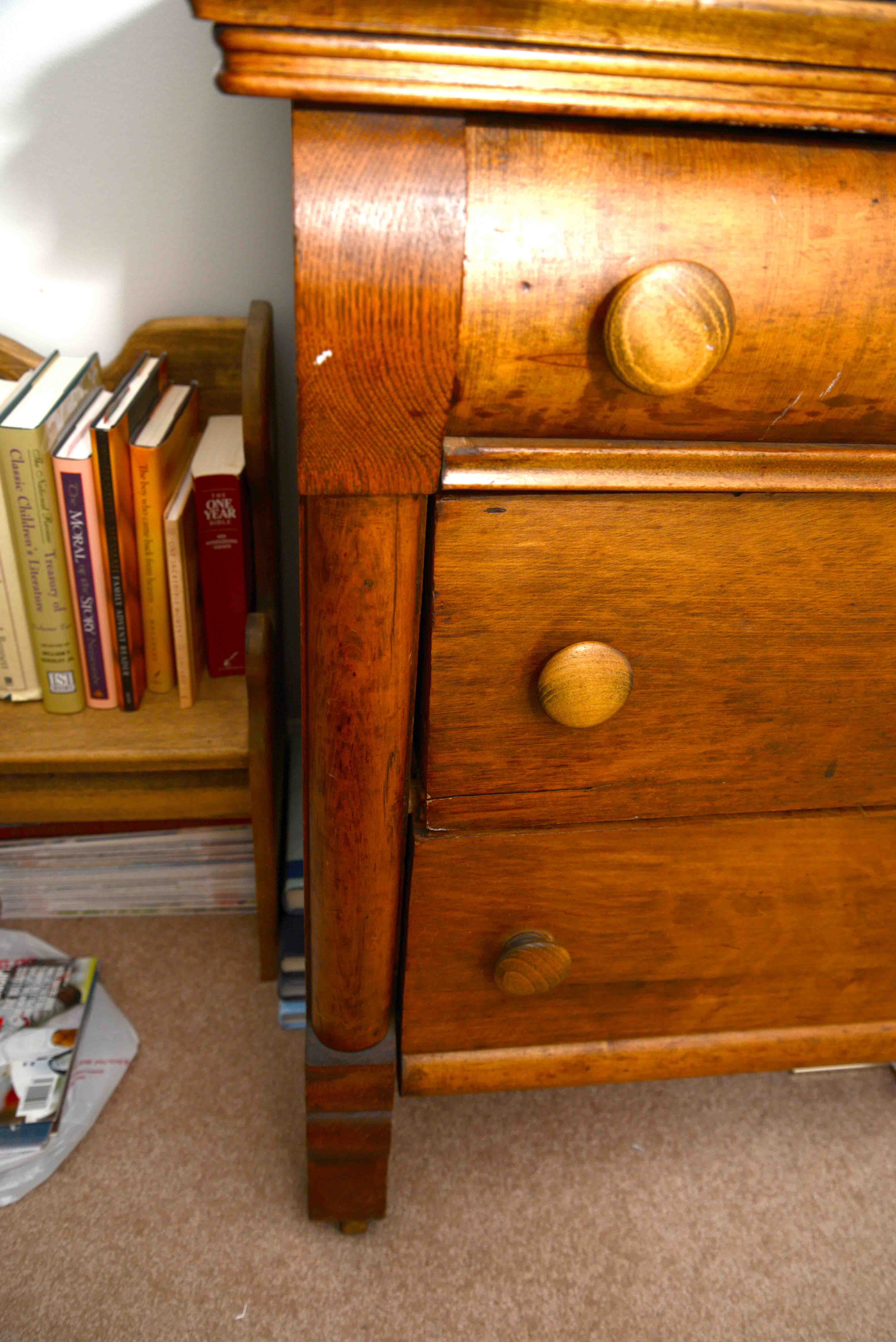 Oak? dresser with beveled mirror. Drawers have dovetail joint construction. Top drawers have locking mechanism. Round fronts on top drawers. Original casters and hardware.