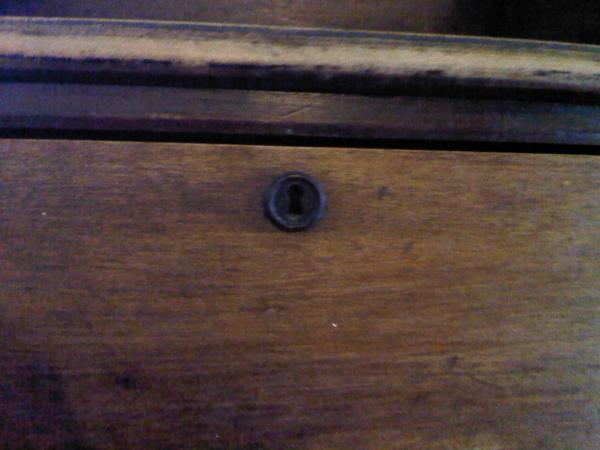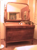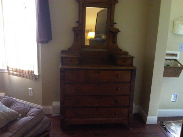 This is a dresser that I just purchased from an estate sale. I have been told it was brought over on the boat, and I have also been told that it was made in America so I don't know which is correct. The cubby drawers on the top of the dresser are attached, and the mirror framing is attached to the dresser by some kind of joint in the wood. The legs have wooden casters, although one of the little wooden wheels has gone missing. I do not have the keys for the locks, but the casings all appear to be intact. The mirror can tilt up or down and the wooden knobs on the dresser appear to be original. It does not look to have been refinished - it definitely appears to be the original finish. I would love to have any information that can be provided, as well as an estimate of value. I am quite curious about the origin of this piece. Thank you. I may consider selling it although I would have to think about it. It is a lovely piece and I have become a little attached. The only condition issue is that there are some joints that might need to be glued again as they have gotten a little loose over the years. Thanks again for helping me find the history of this item.