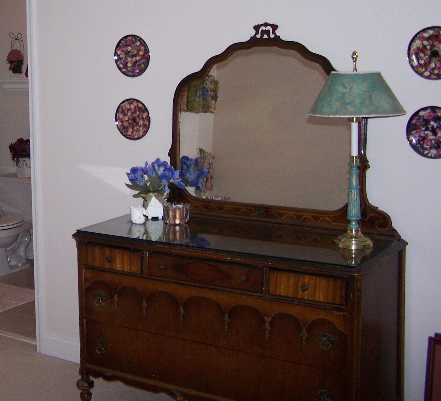 Vintage dresser and mirror, very good condition with decorative veneers. From Globe-Bosse-World Furniture, Evansville IN ca 1920. Glass top.