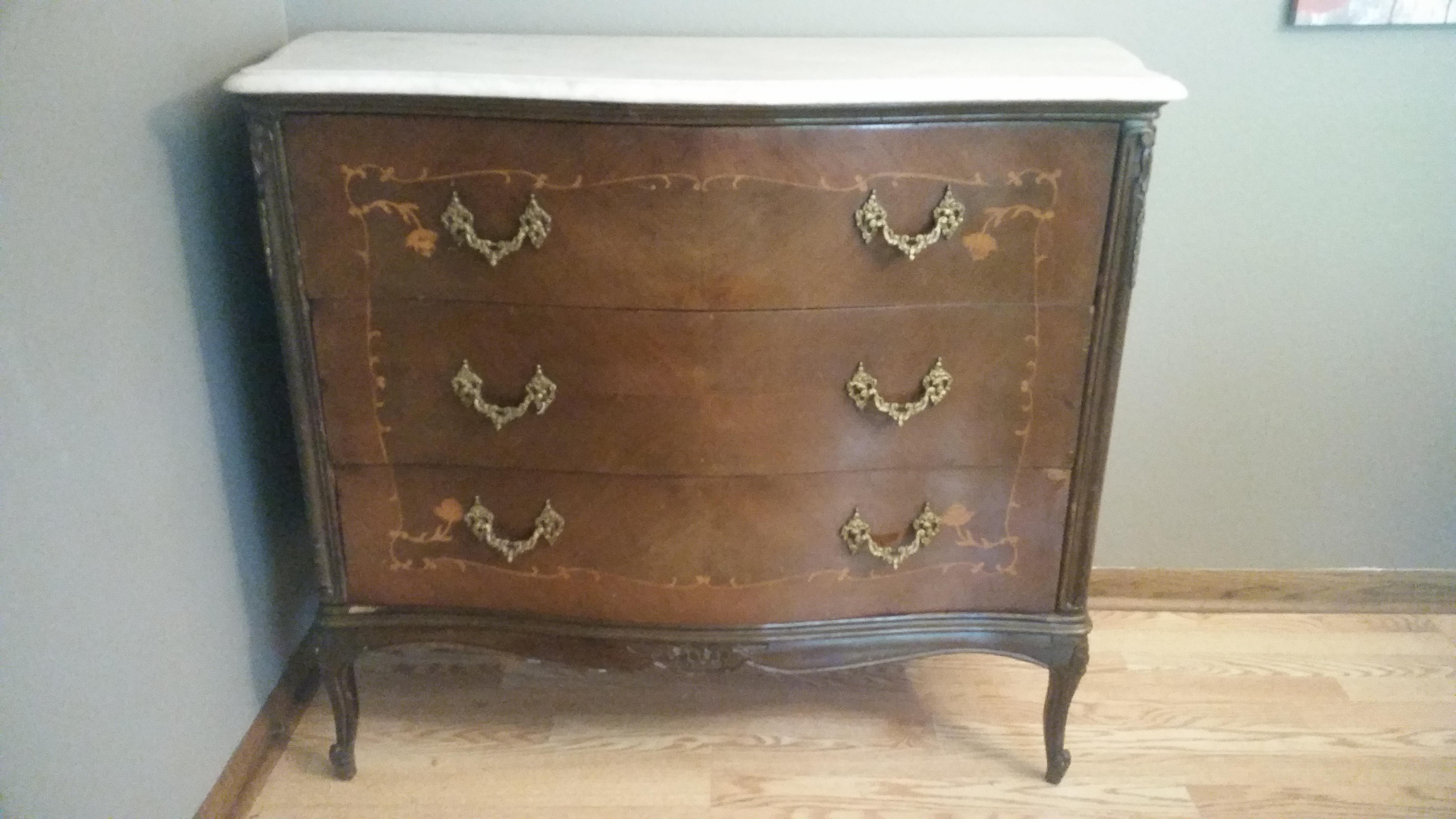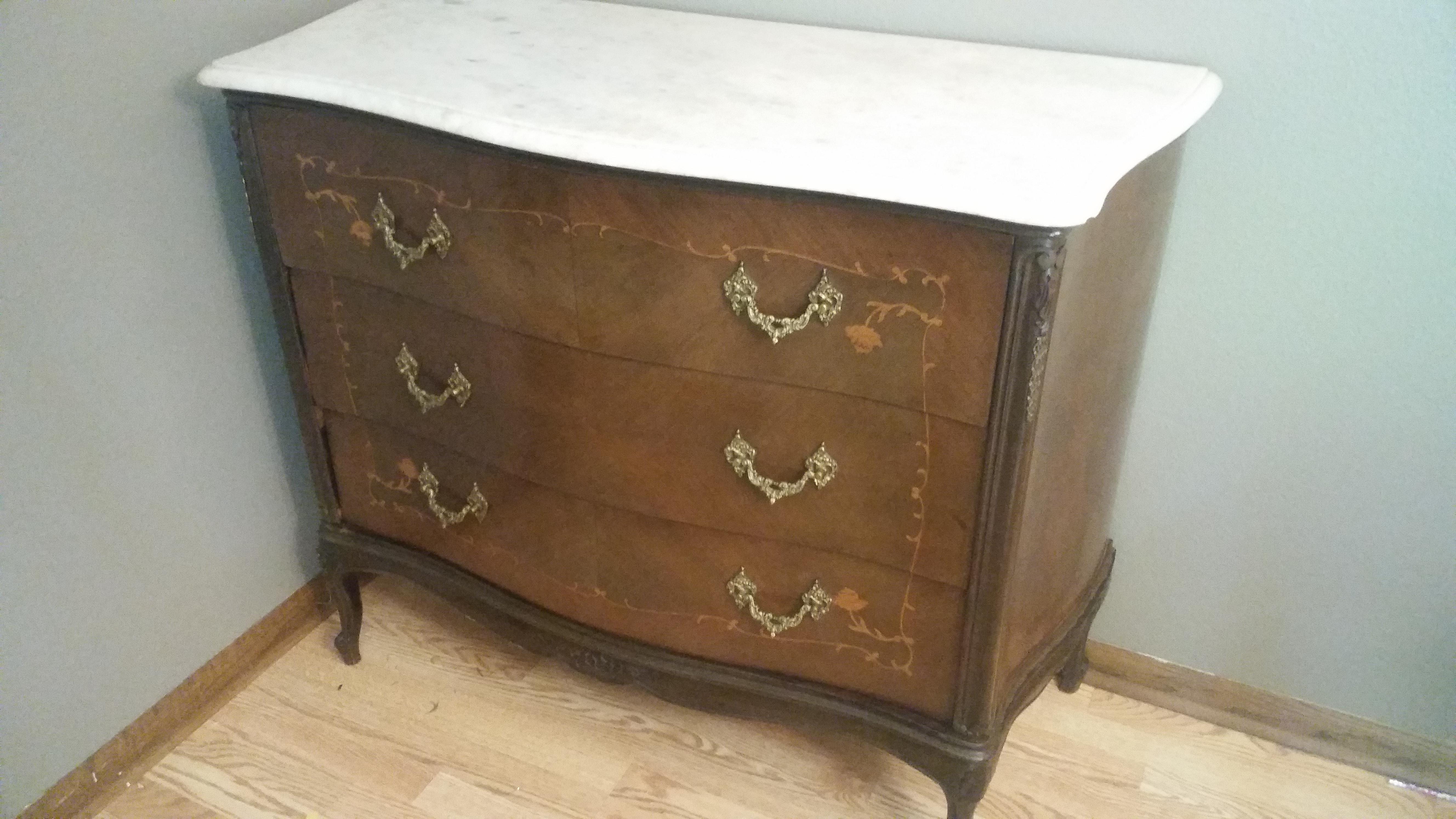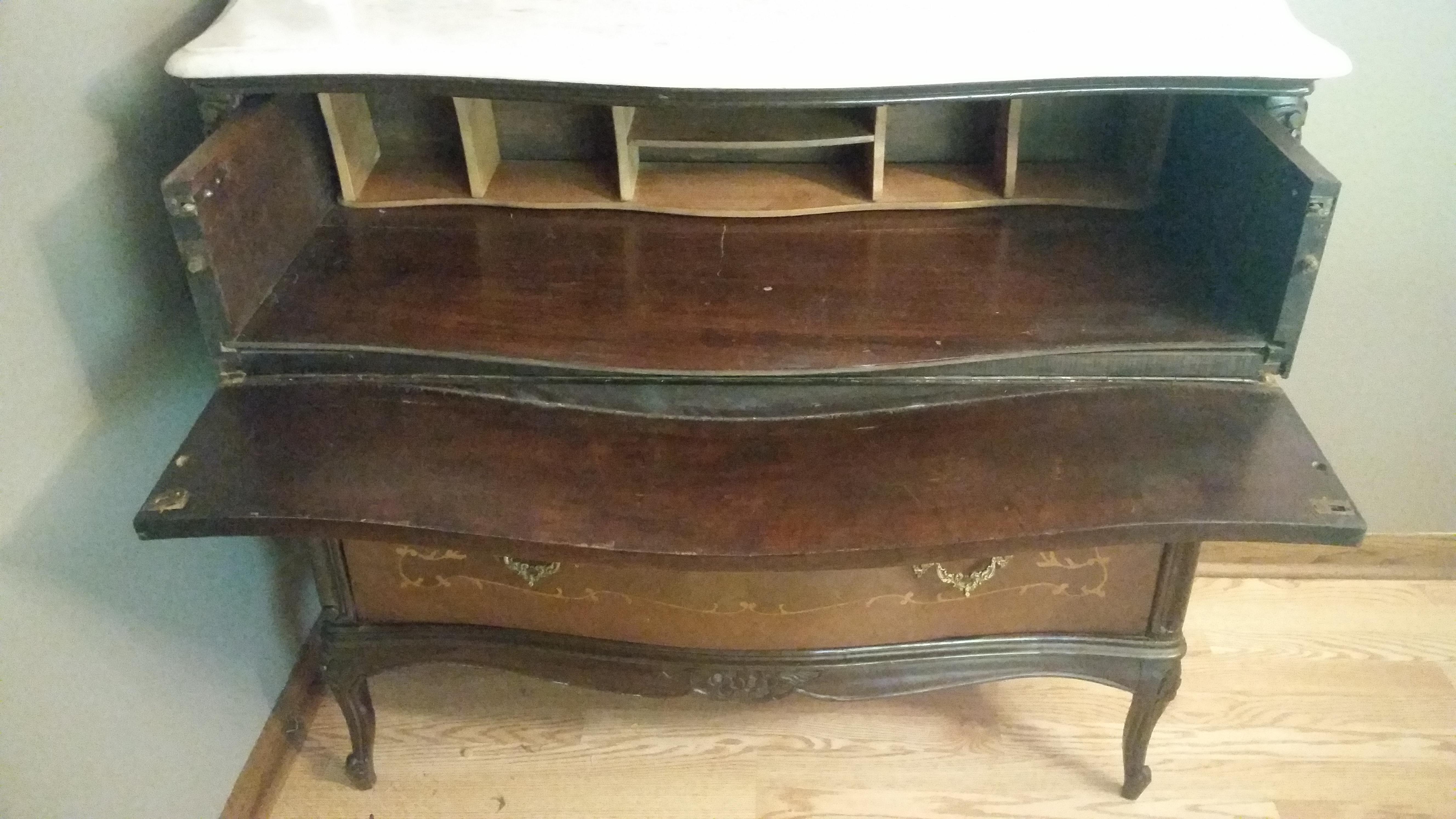 Got this dresser at a garage sale. It has a marble top, serpentine drawers and sides, inlaid artwork and (I think) brass hardware. The top drawer flips down revealing a desk, but the curve of the drawer would make it difficult to use as a desk. I don't think the insert is original.