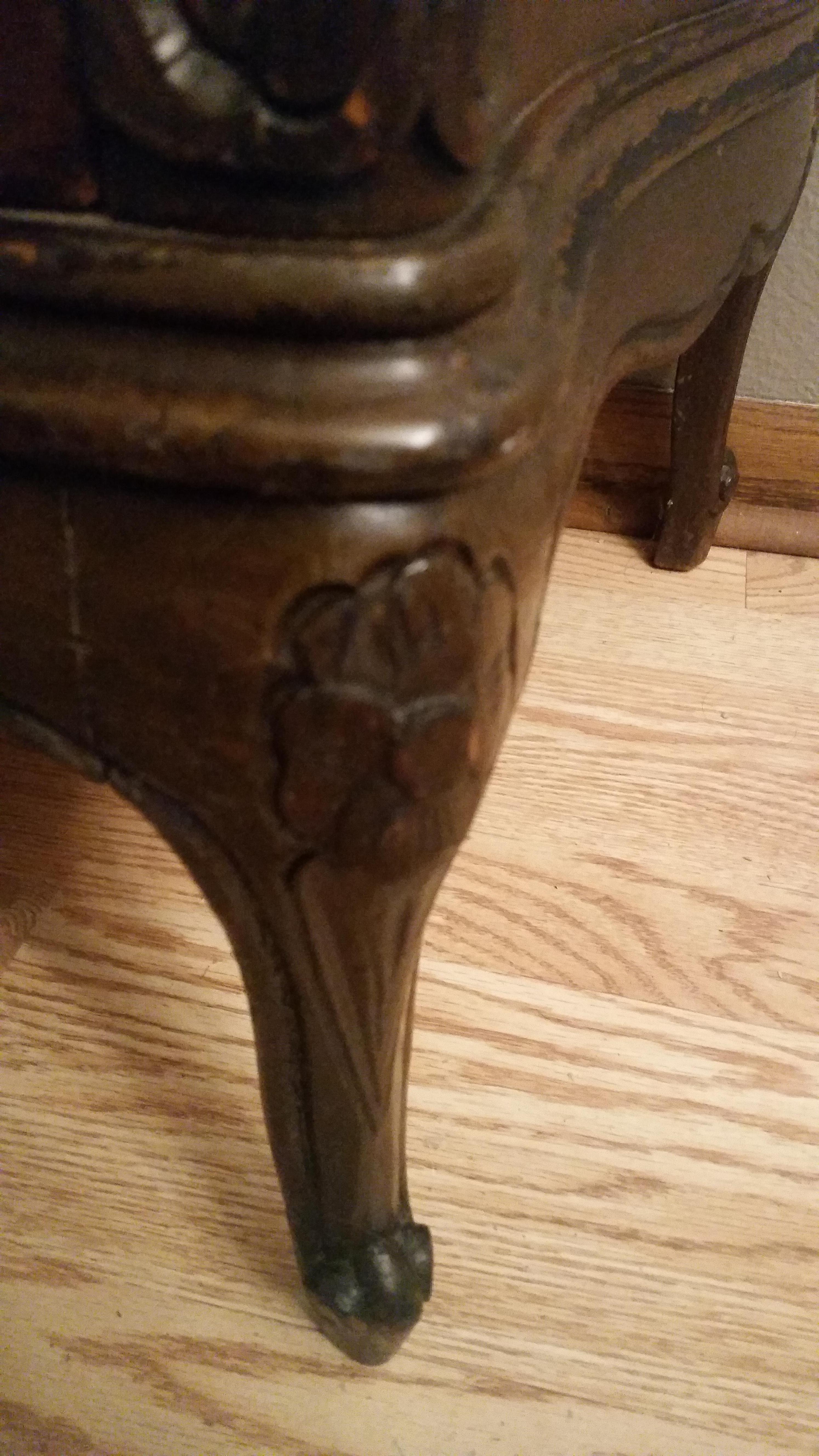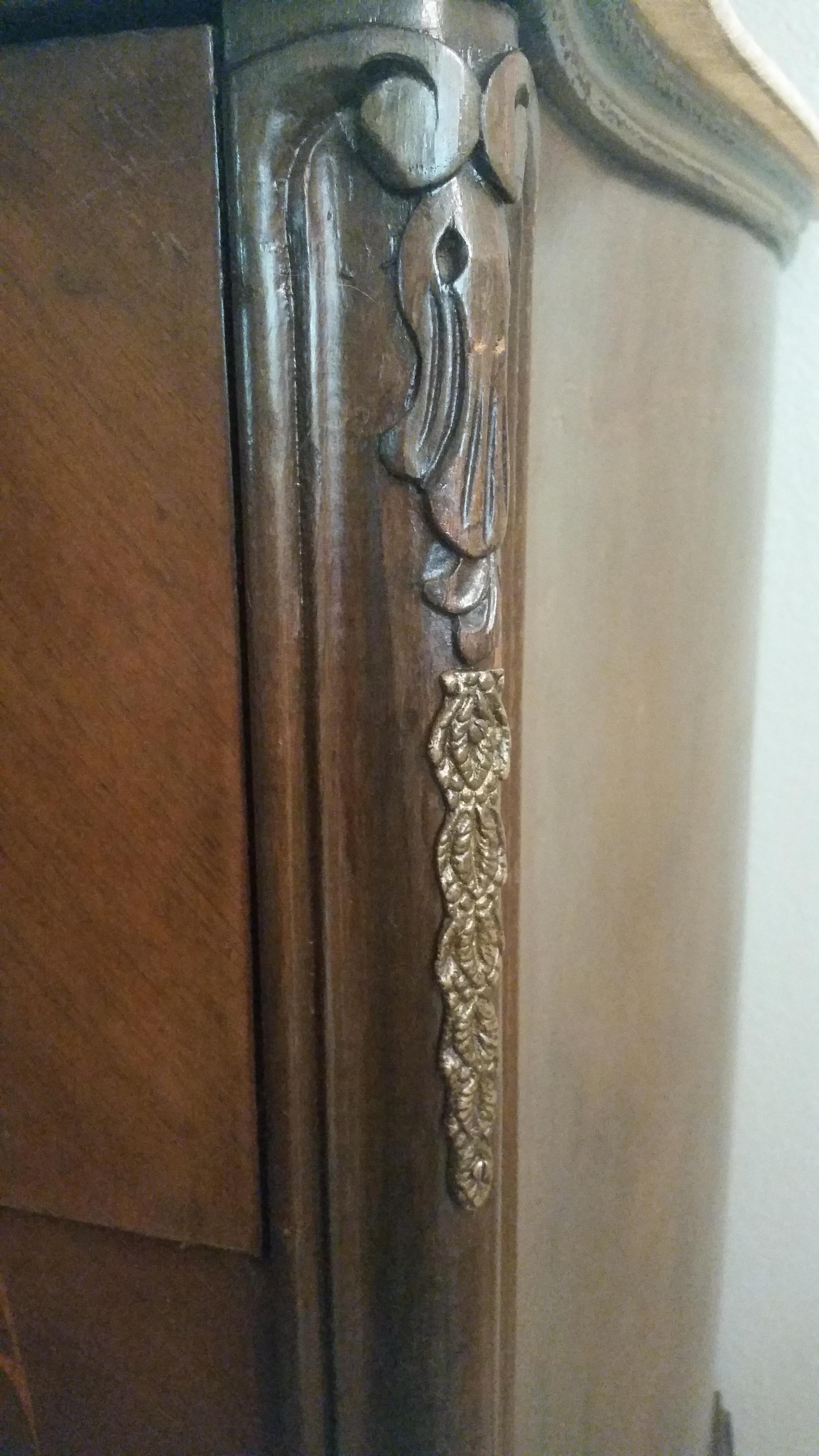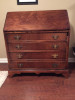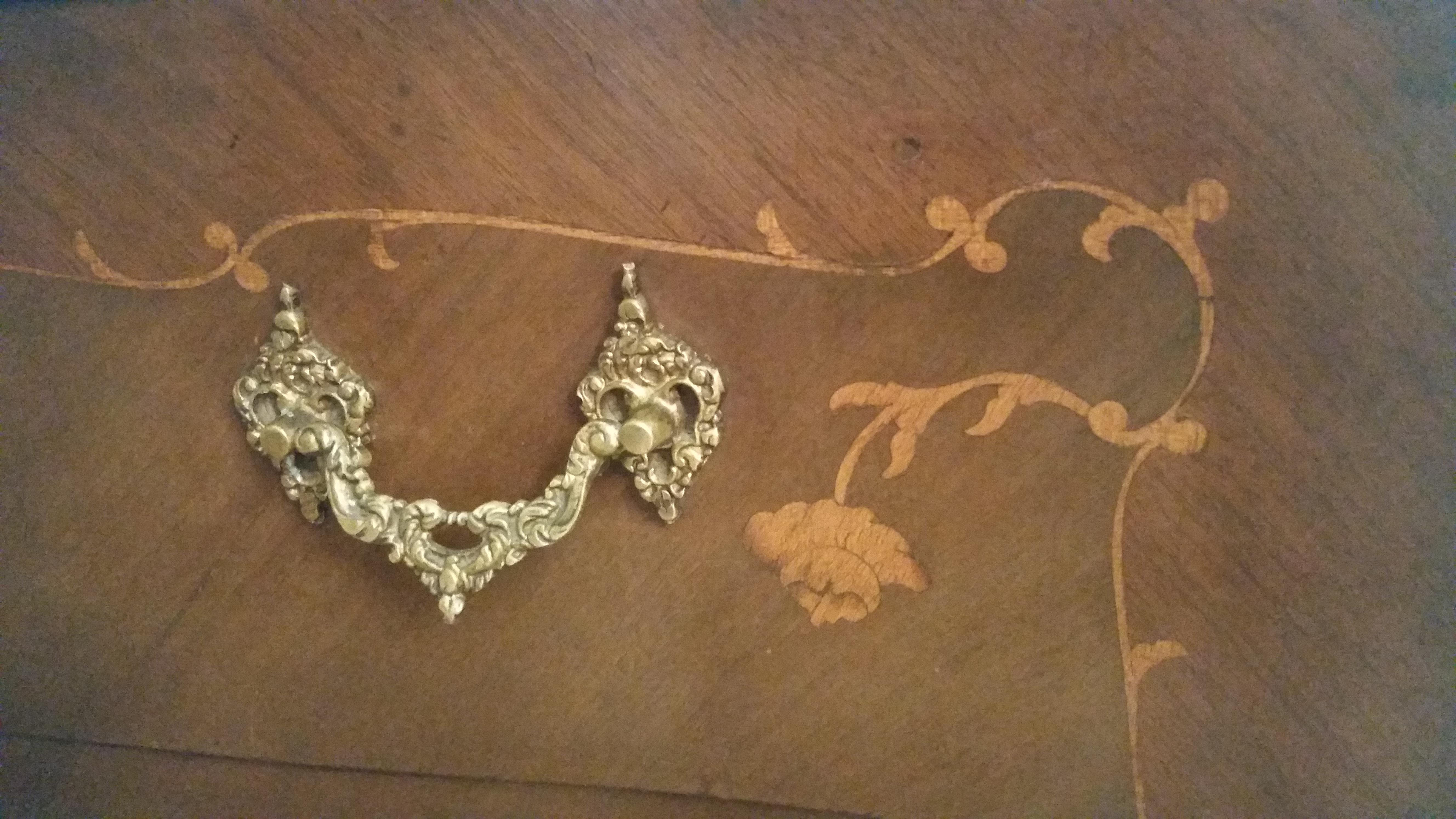 Got this dresser at a garage sale. It has a marble top, serpentine drawers and sides, inlaid artwork and (I think) brass hardware. The top drawer flips down revealing a desk, but the curve of the drawer would make it difficult to use as a desk. I don't think the insert is original.