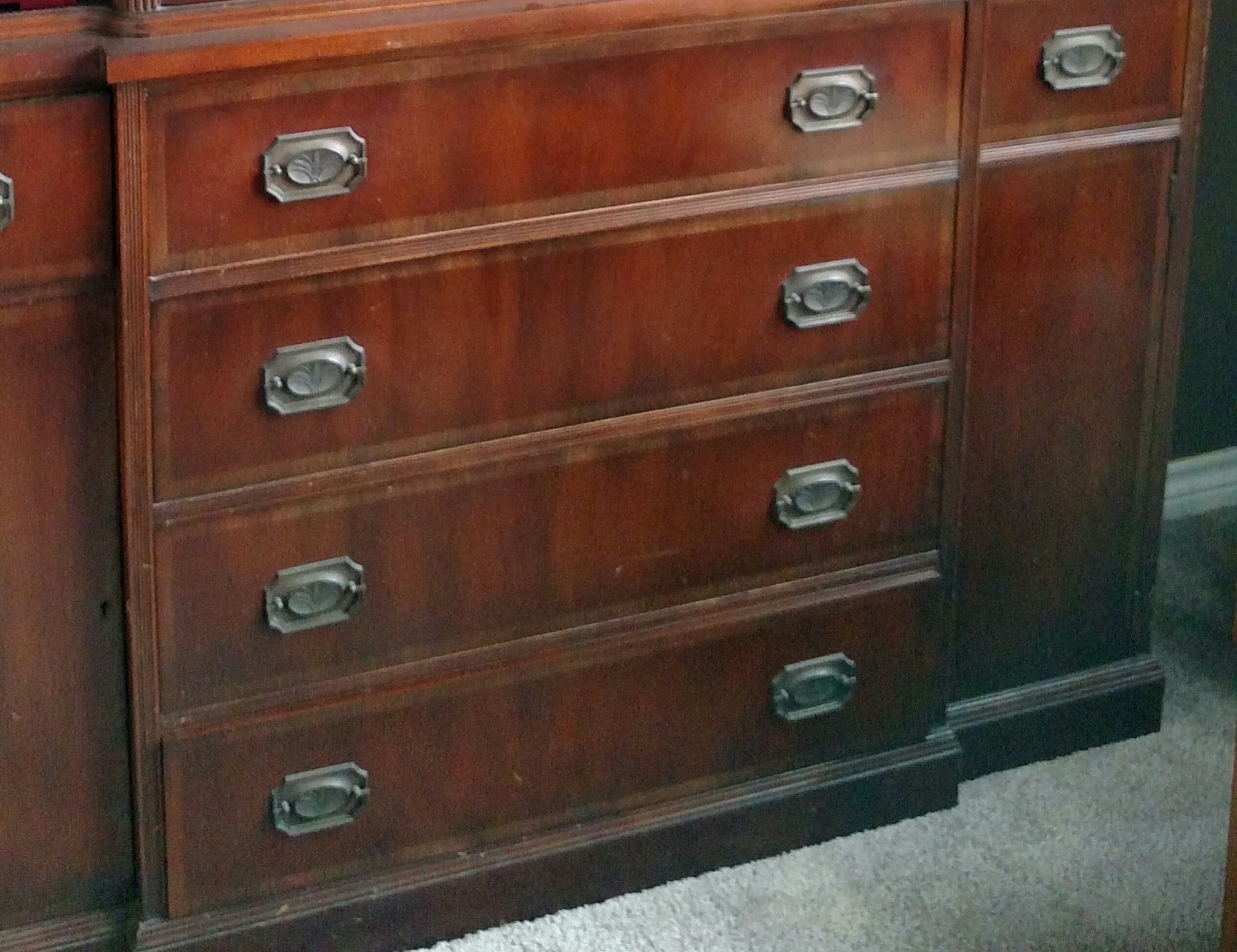 Upper attached China cabinet with locks. Upper crown molding. Lower four large drawers and two small side drawers, two side doors. Handles all have wheat leaf designs. I believe it is from early 1900's but not positive.