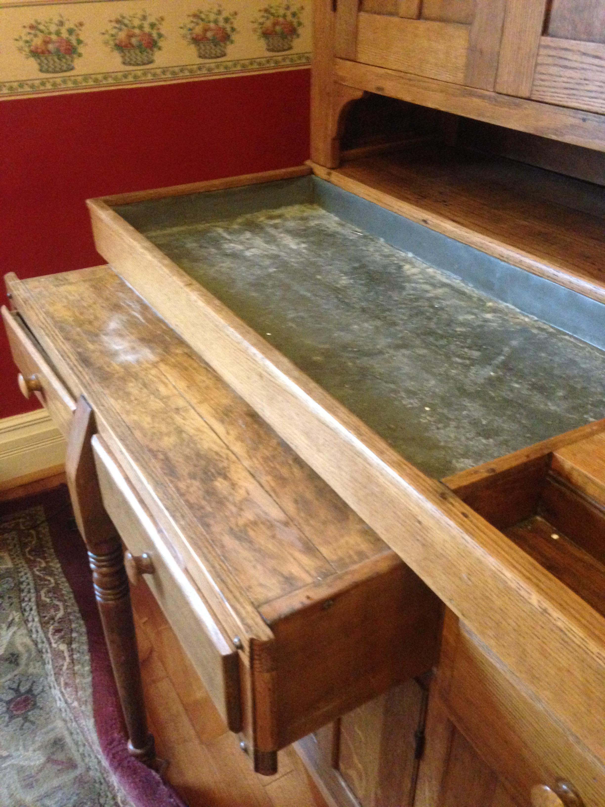 The whole piece of furniture is on wheels, all functional. The dry sink contains 7 functional drawers of various sizes, 6 cabinet doors, and a pull-out table top. It is in great condition! The only flaw is one of the main cabinet doors is currently stuck, but I believe it could be easily fixed. I would like to know as much about it as possible as I am in college now and could use the money. My father thinks it is worth around $3,000. Any information is useful!