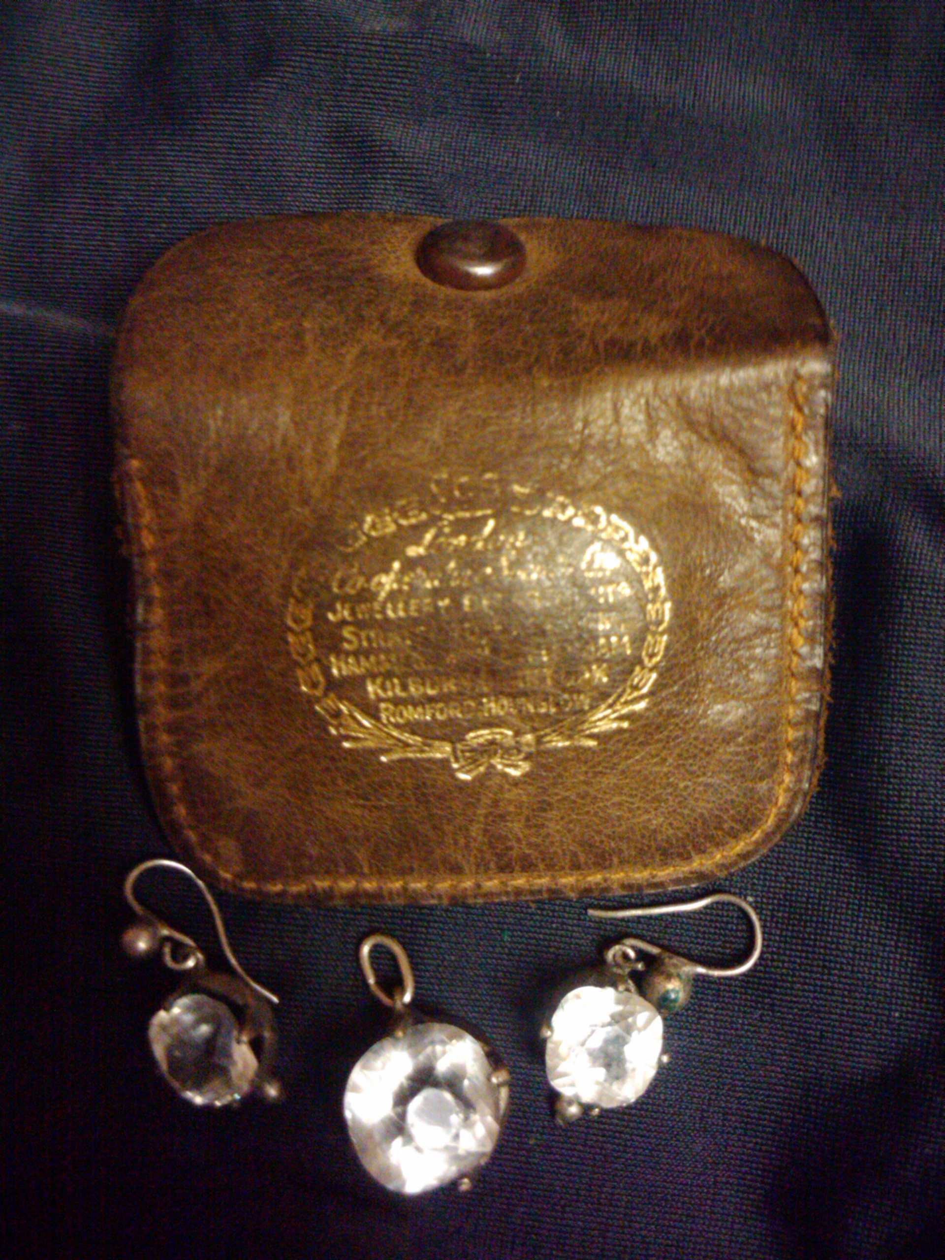 they are stored in a brown leather pouch that has lettering with gold tooling but most of the lettering is worn off. See pictures..I was able to make out Jewelry, Romford and Hounslow which are in London but are unable to identify the exact jeweler