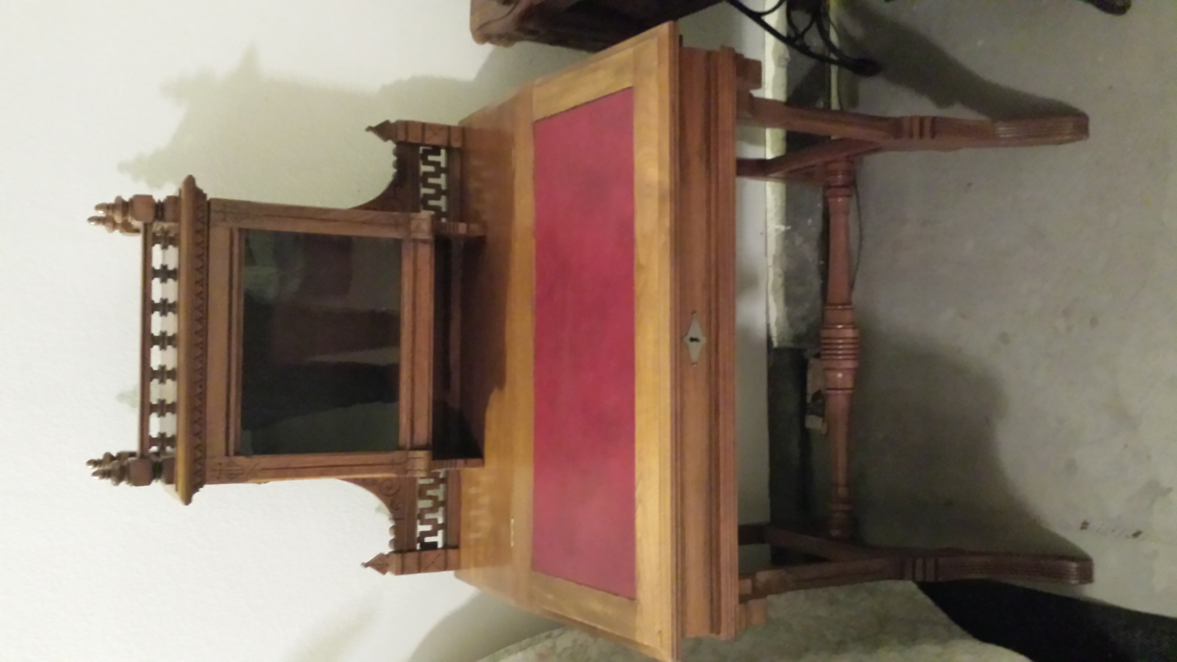 This beautiful petite secretary's desk is of carved wood with a newer leather-inset desktop, and original glass door for the display case. There is an open display area on top of the desk as well. The desktop lifts to reveal the storage space underneath. I have never owned the key.