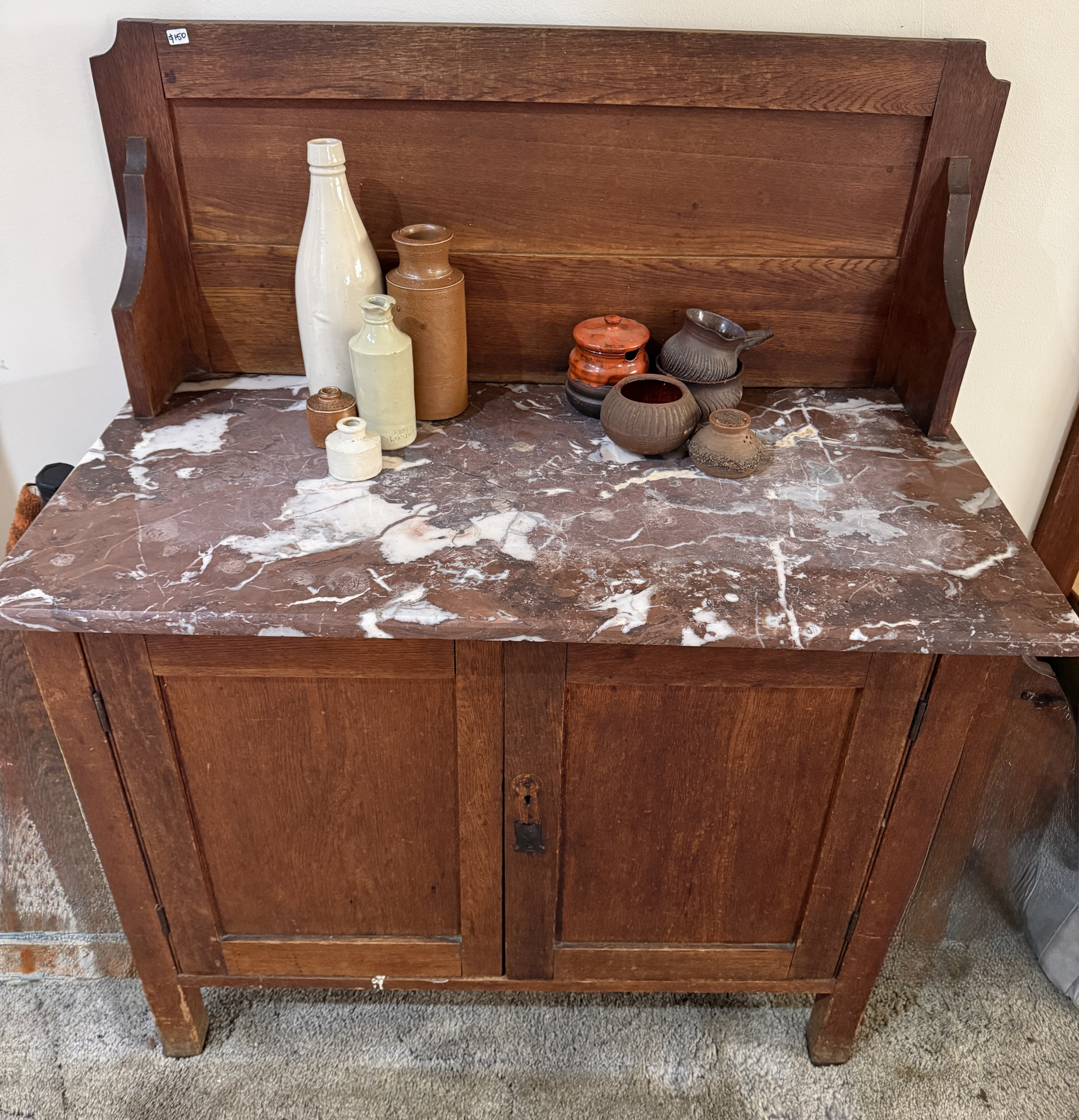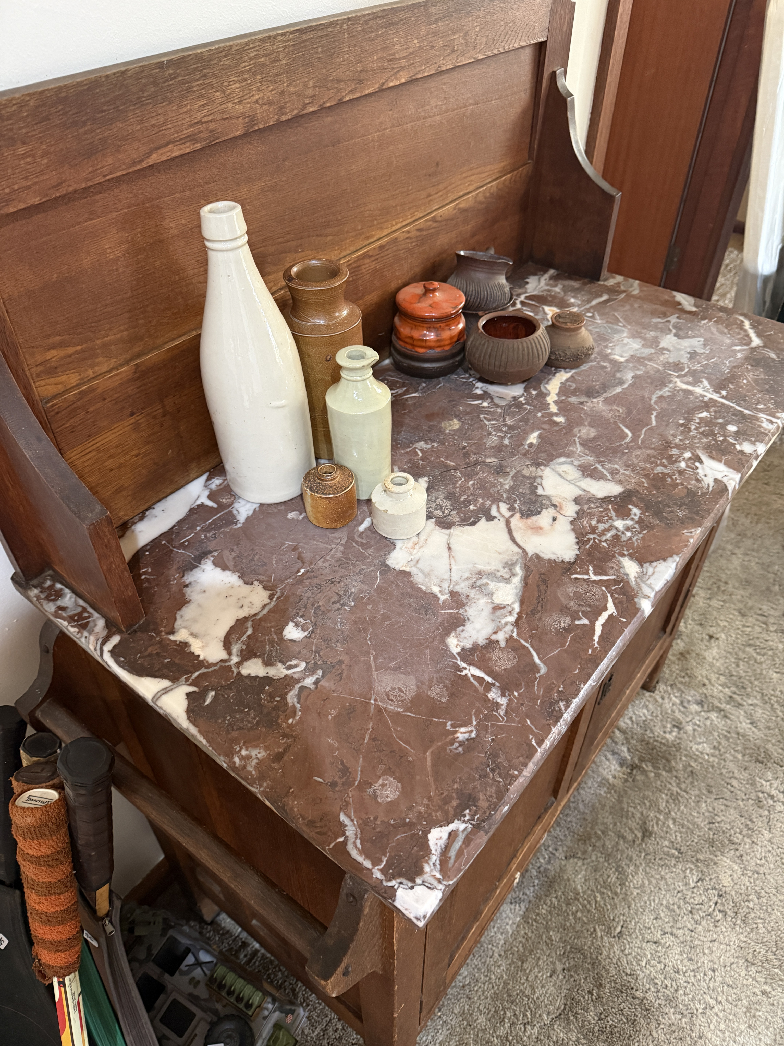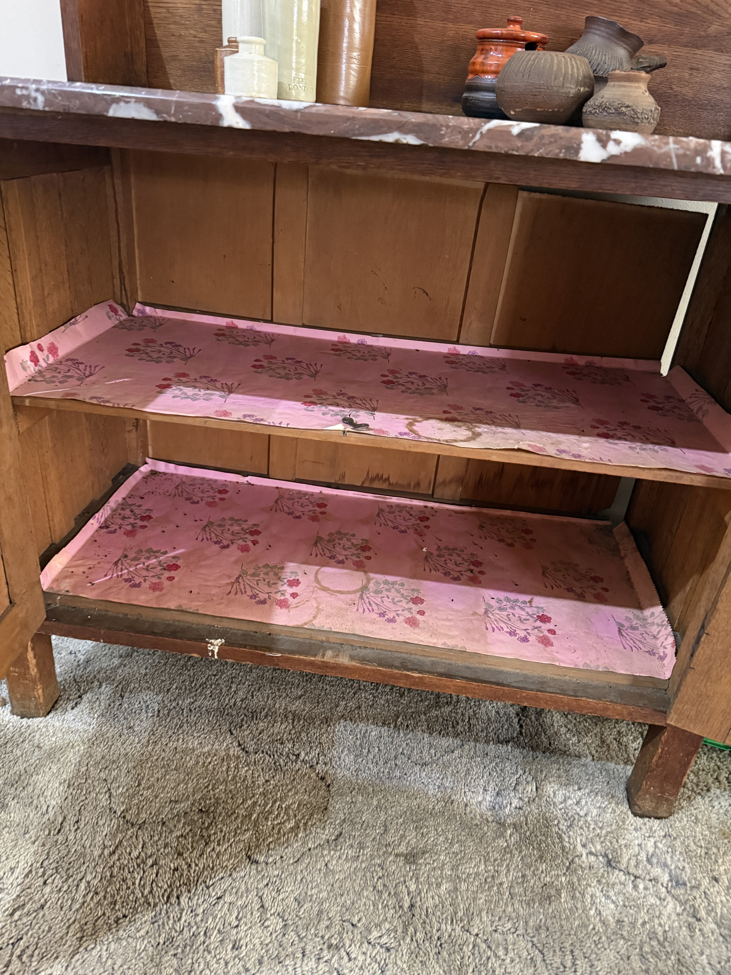 Description Beautiful wooden antique sideboard with rare red marble slab top.