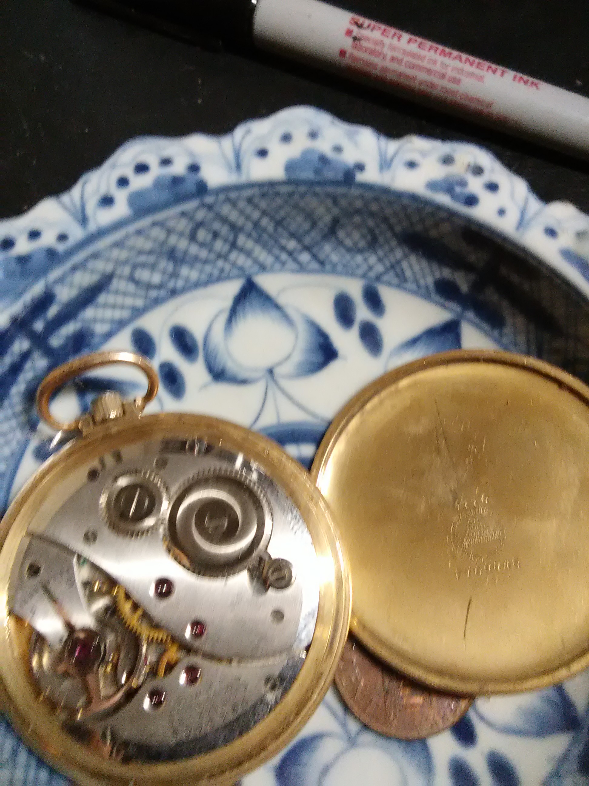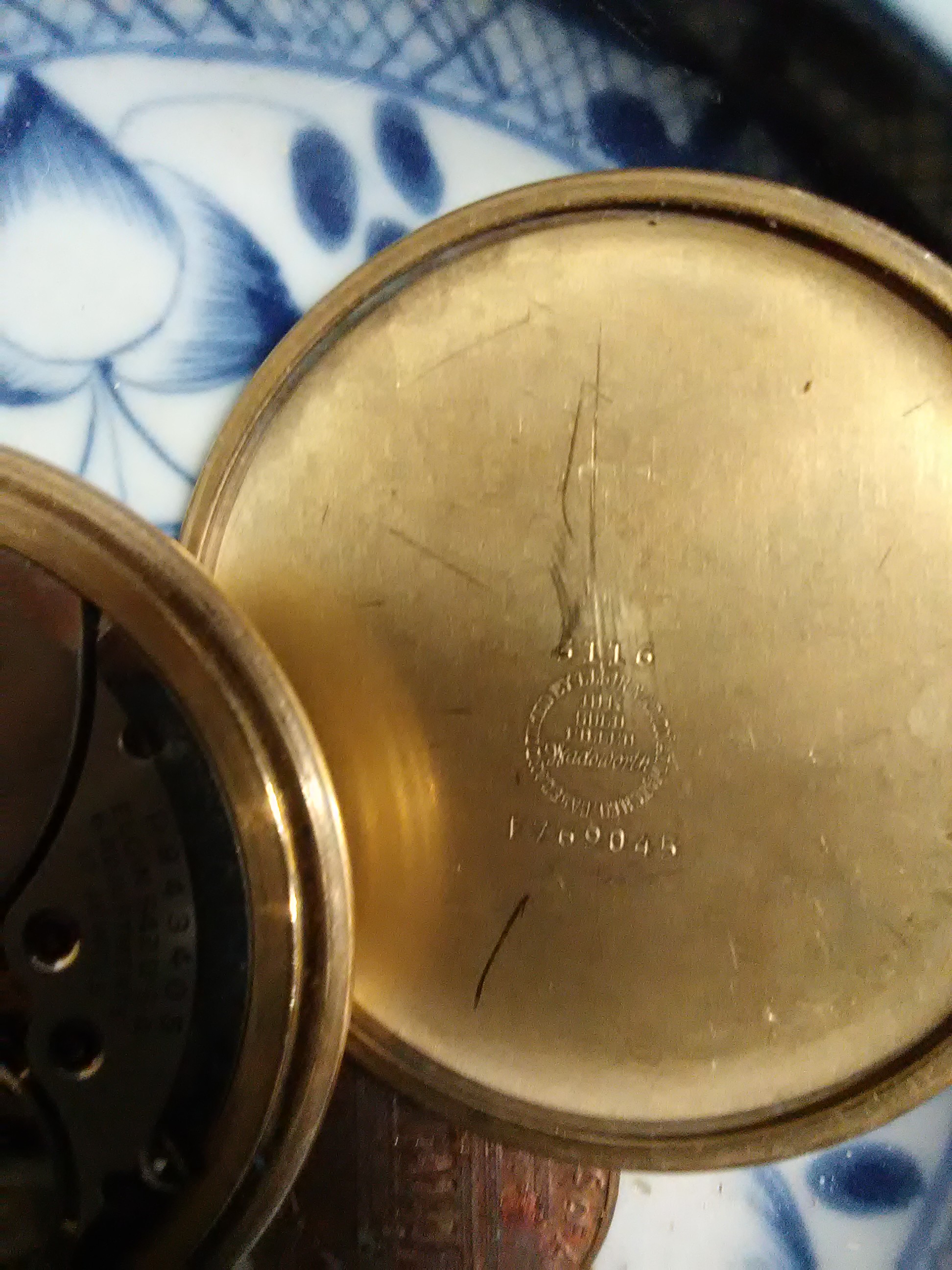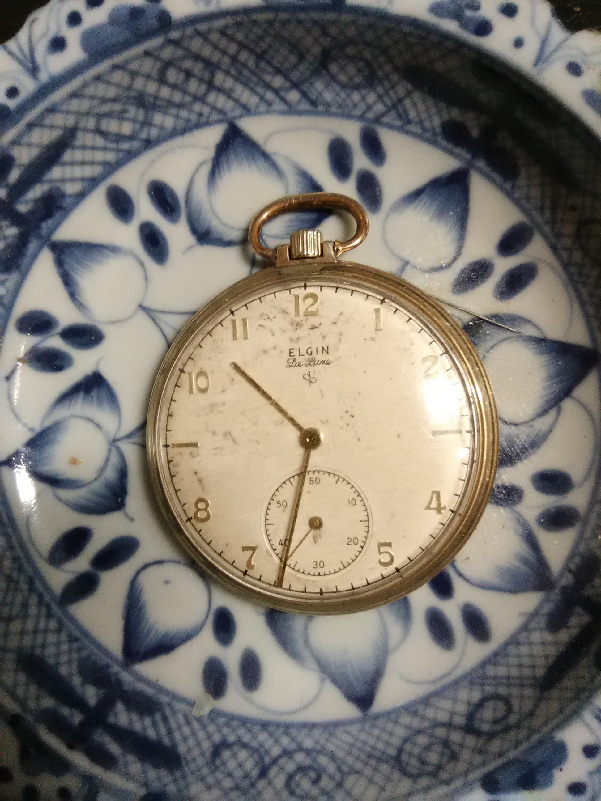 Elgin deluxe pocket watch. 17 jewel, inside says p943405 Elgin 542 USA. Back cover says 3116 10 k gold filled. Wadoworth . Not signed but has a date inscribed below the words 3-1-65