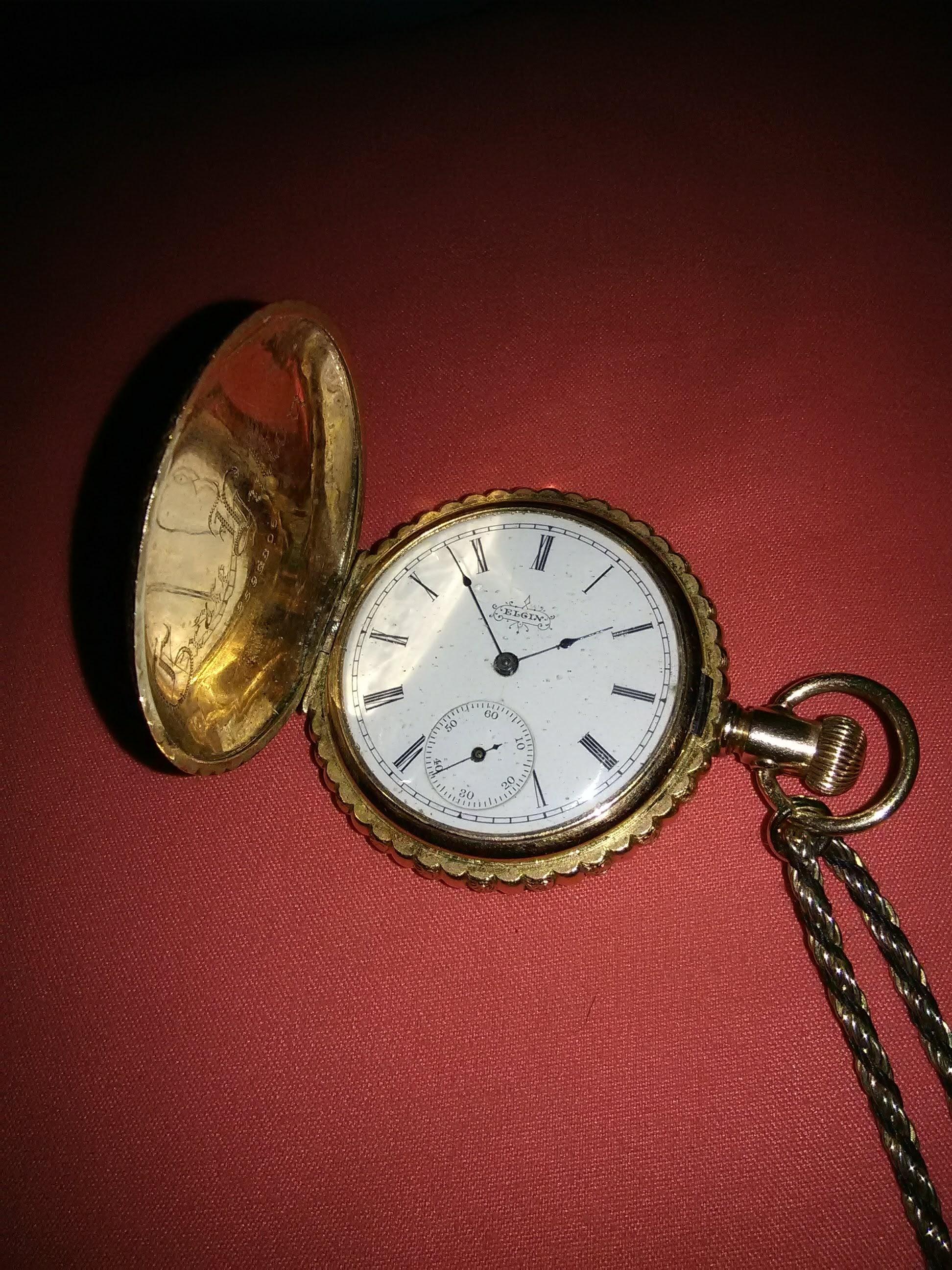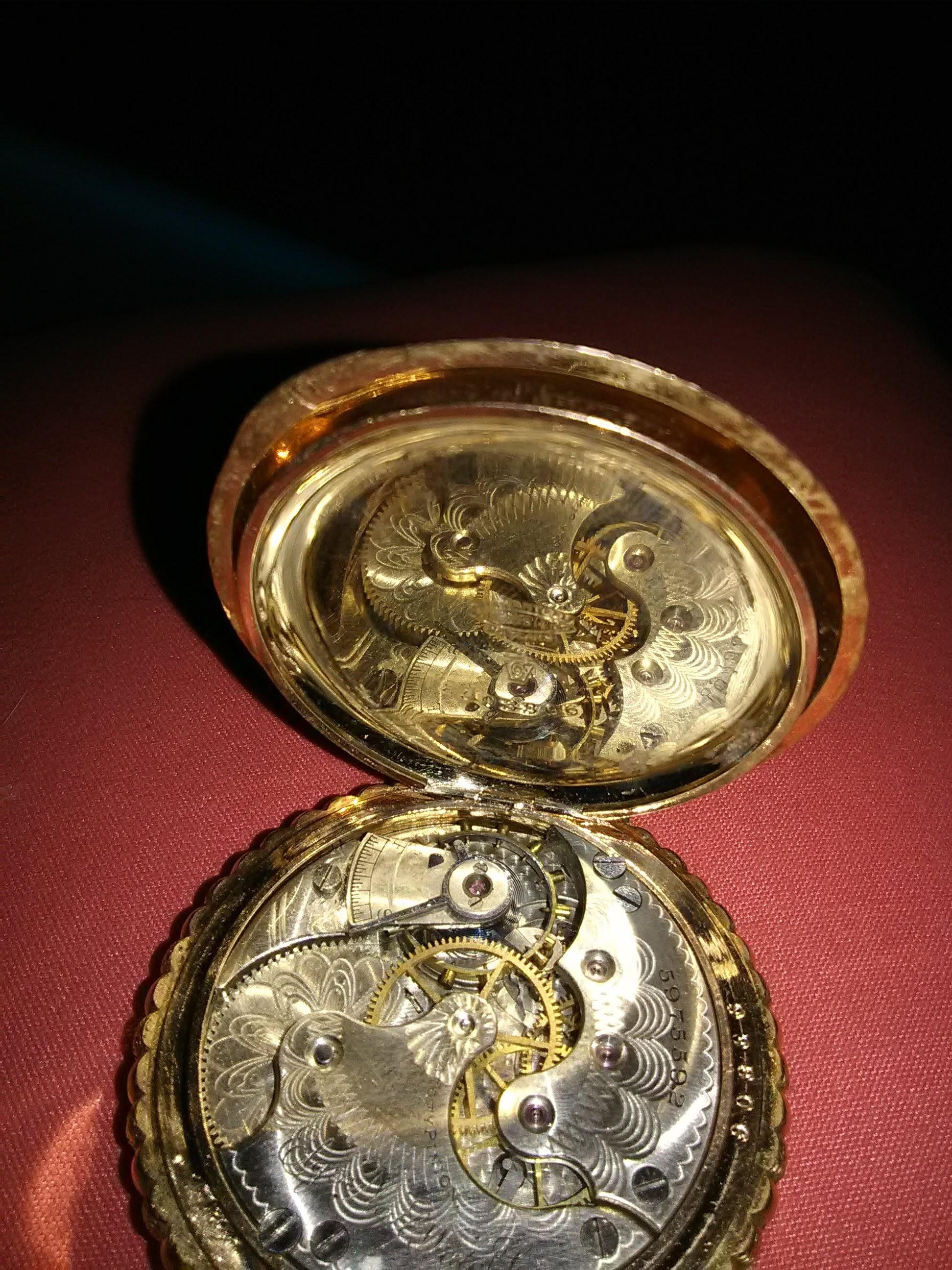 In great condition. Clock works. Hunters case, 14 k 6s 11j