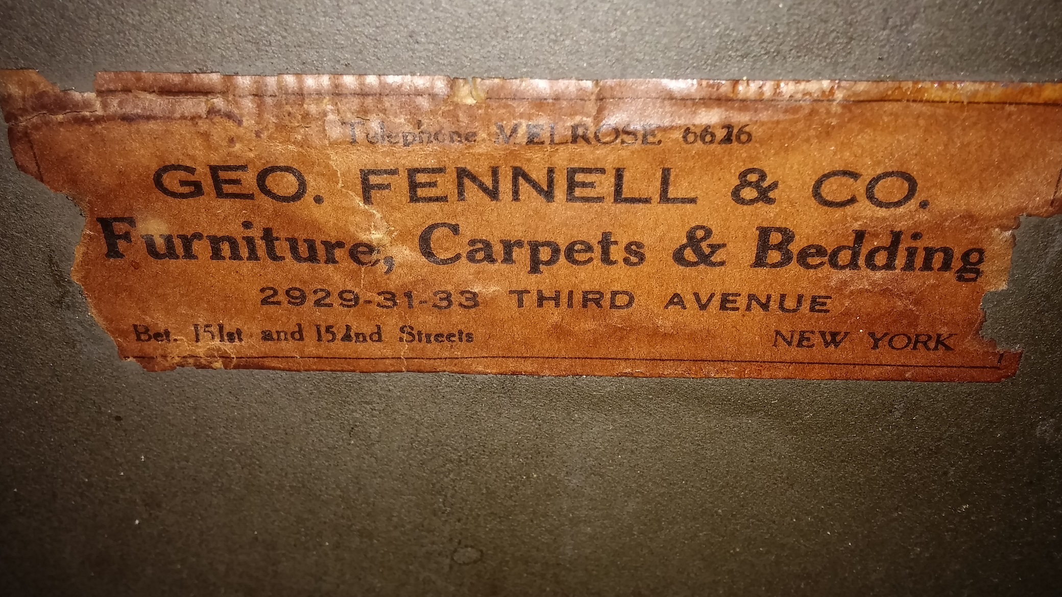 Picked this beauty up an estate sale recently and I am curious as to what is may be worth. It has a tag that reads 'geo. fennell & co furniture, carpets, and bedding New York '. I looked the company up and all I could find is some advertisements from 1917 in an old newspaper and a bench in a museum that is made by the same company. You can tell it is hand made because the corners on the top are not uniform. Anyone have any idea what it may be worth?