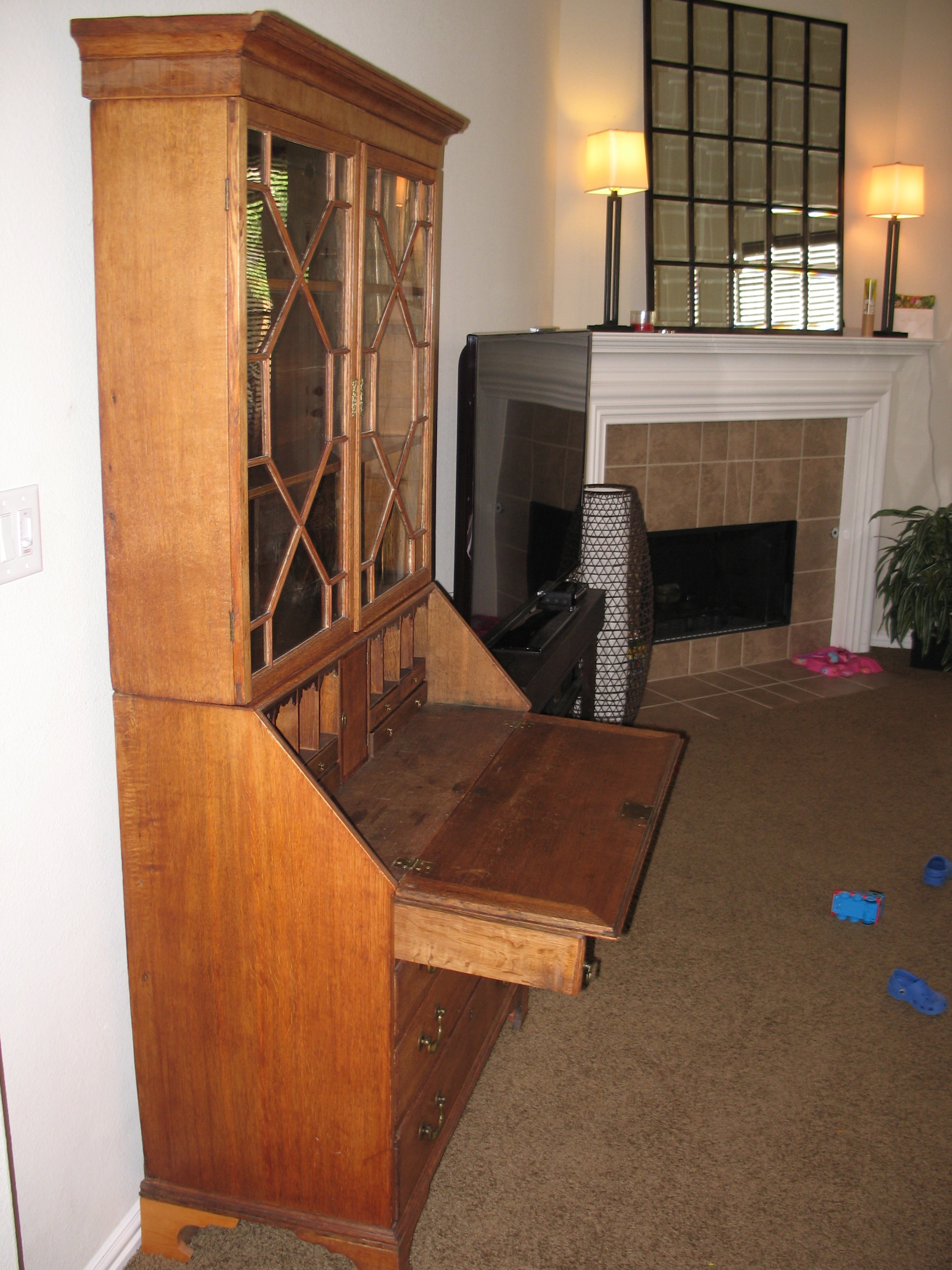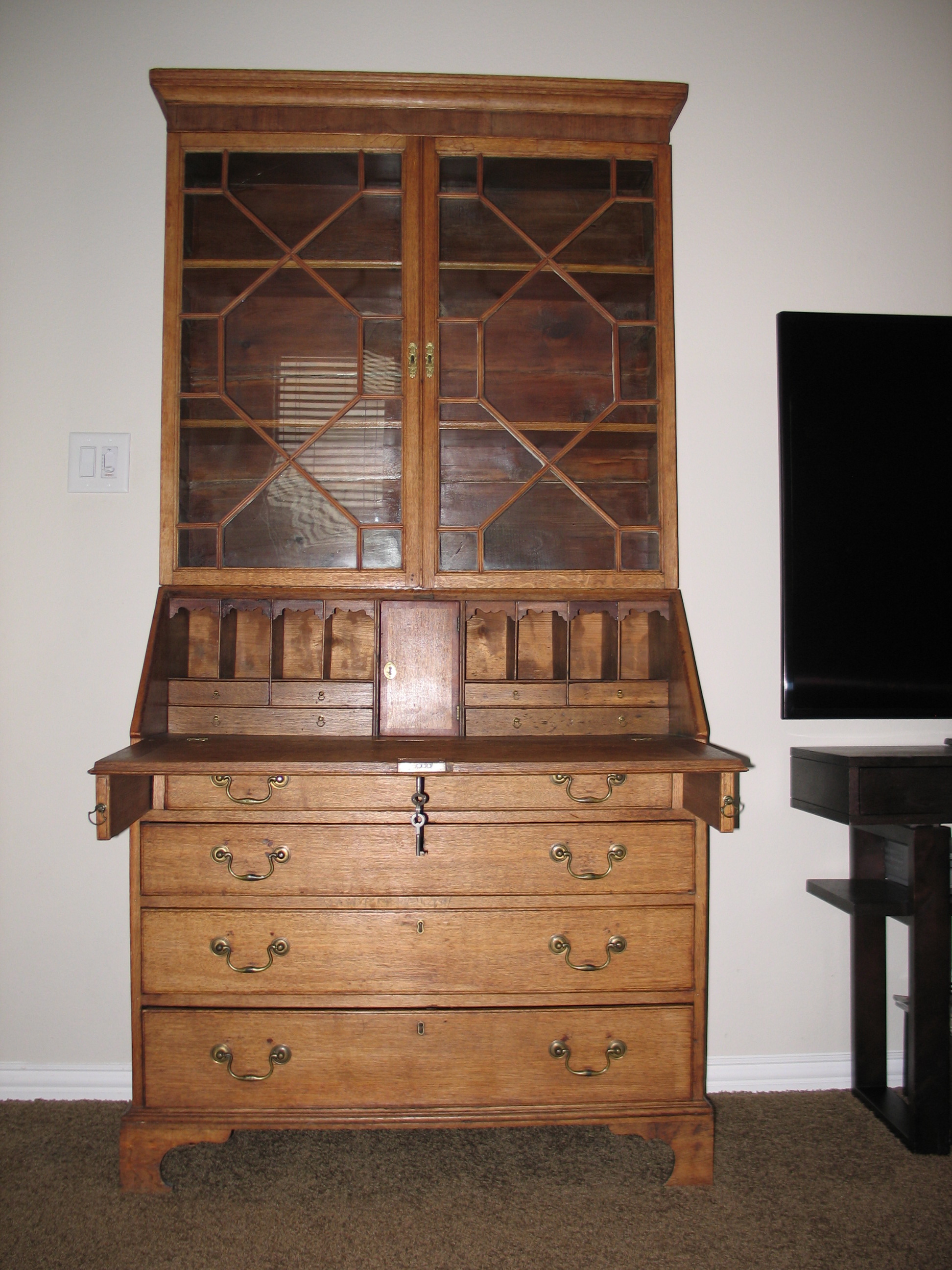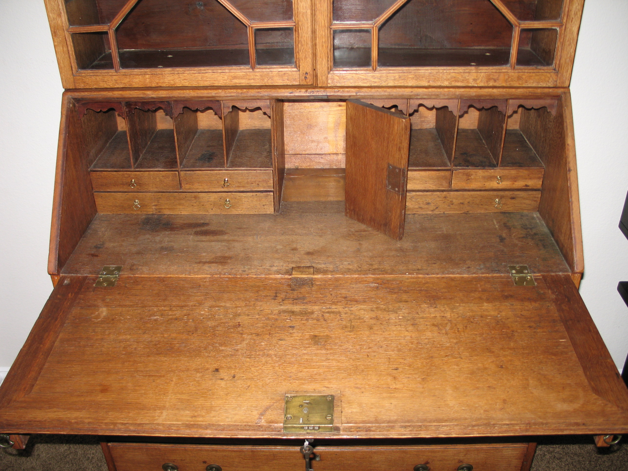 I don't know much about this piece. It was given to me by my father. He purchased it in Europe in the 1950's or 1960's. He said that it was English. It has 1 piece of cracked glass and one of the legs was broken and replaced. I have the keys and all of the locks work. It consists of 3 pieces. I would love to know more about the piece including it's value.