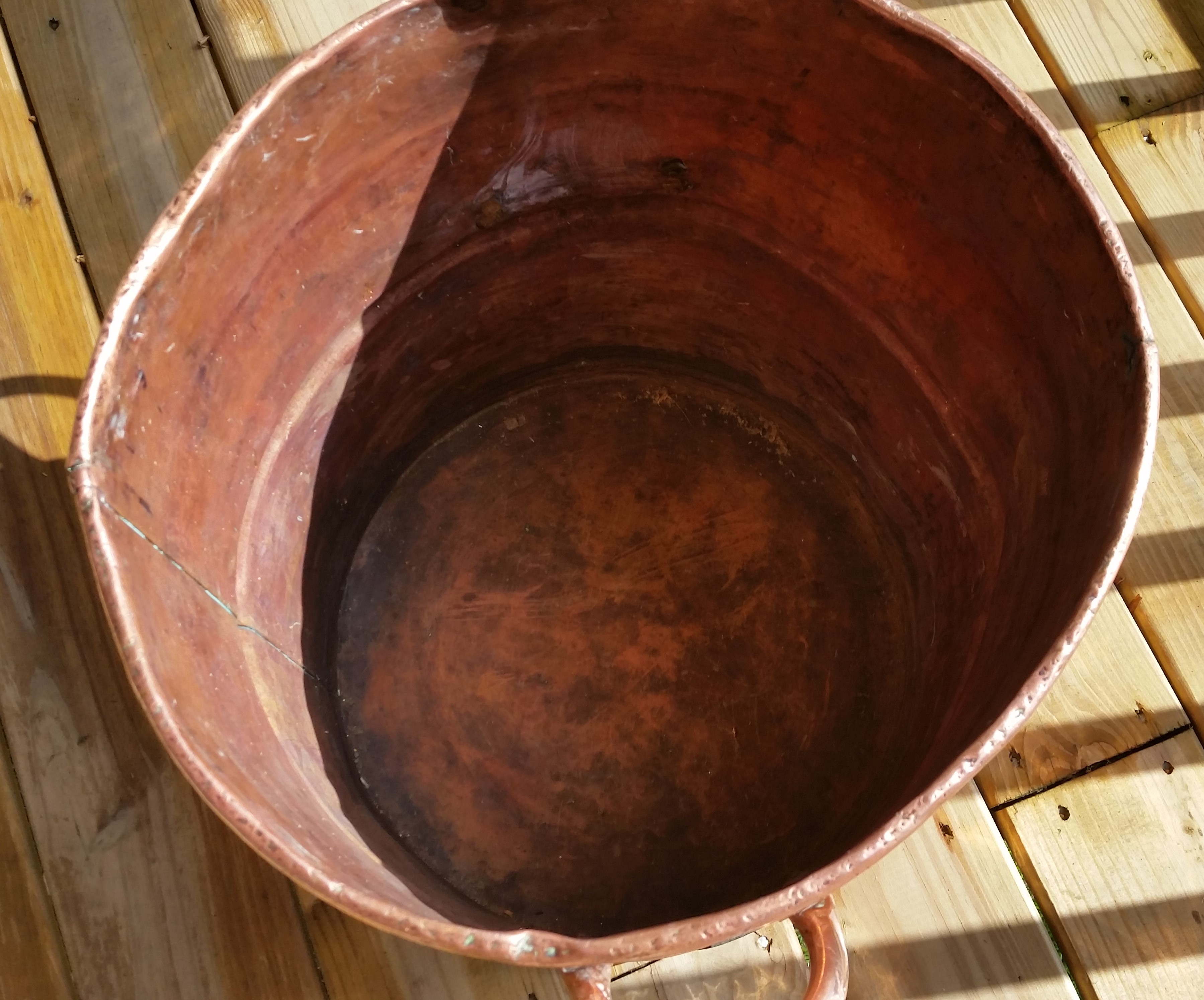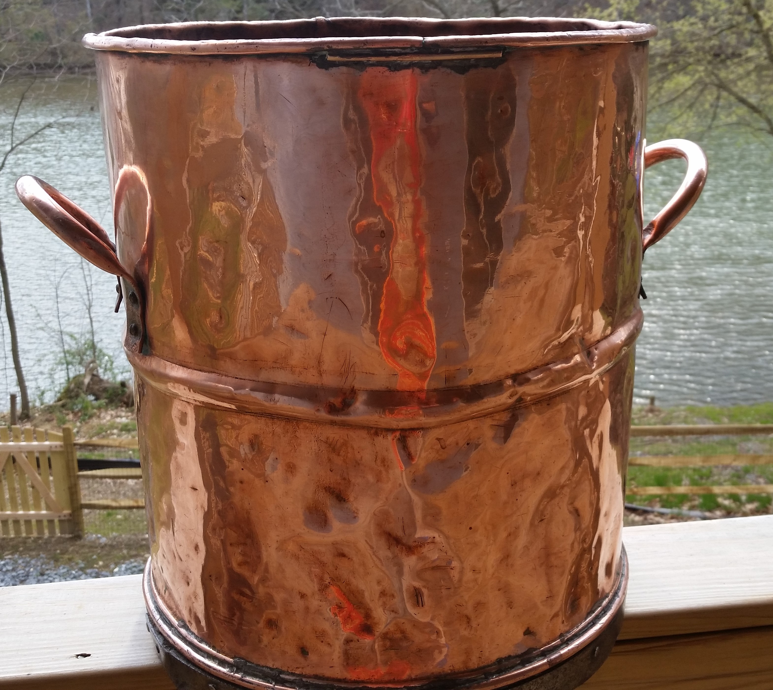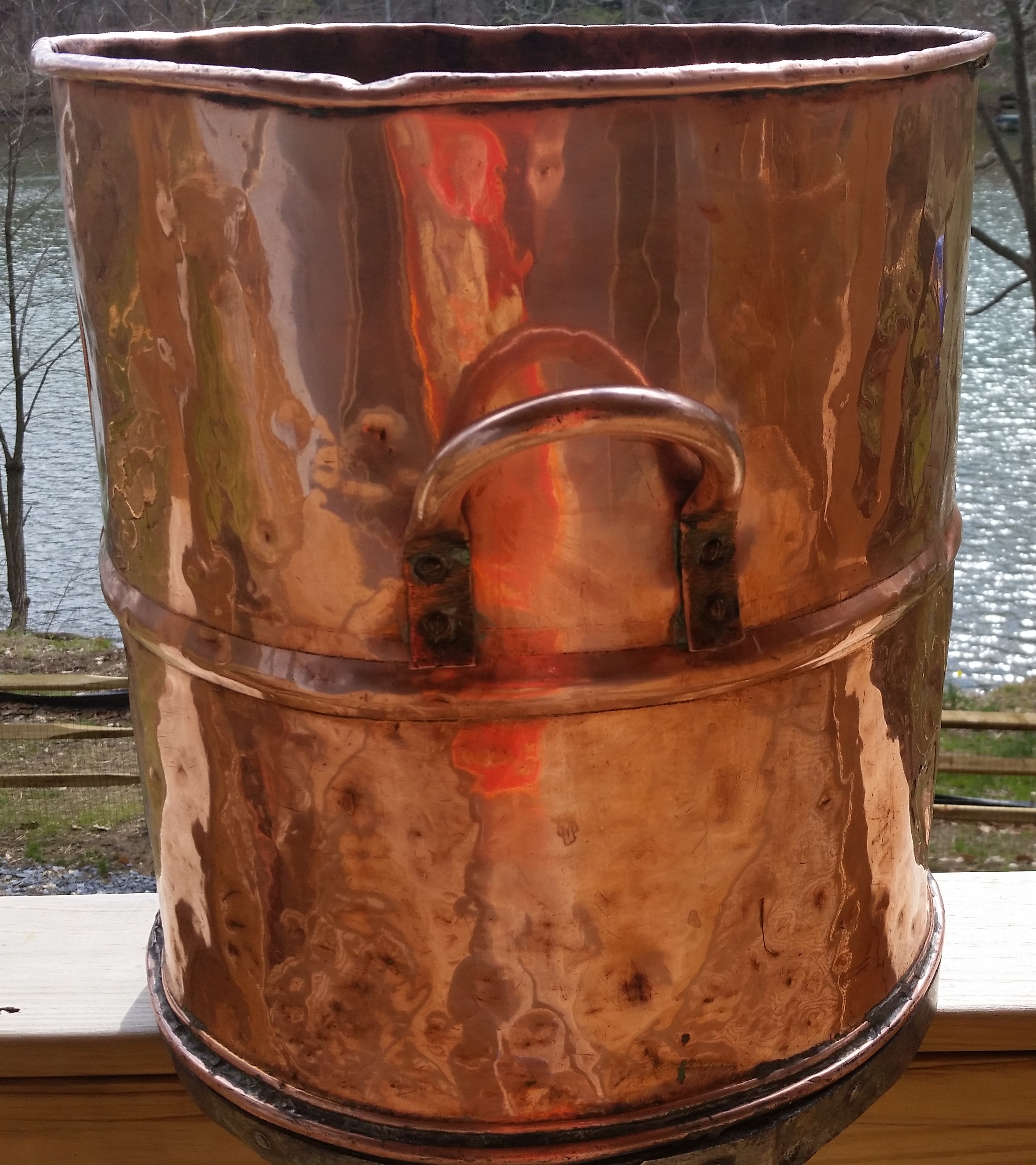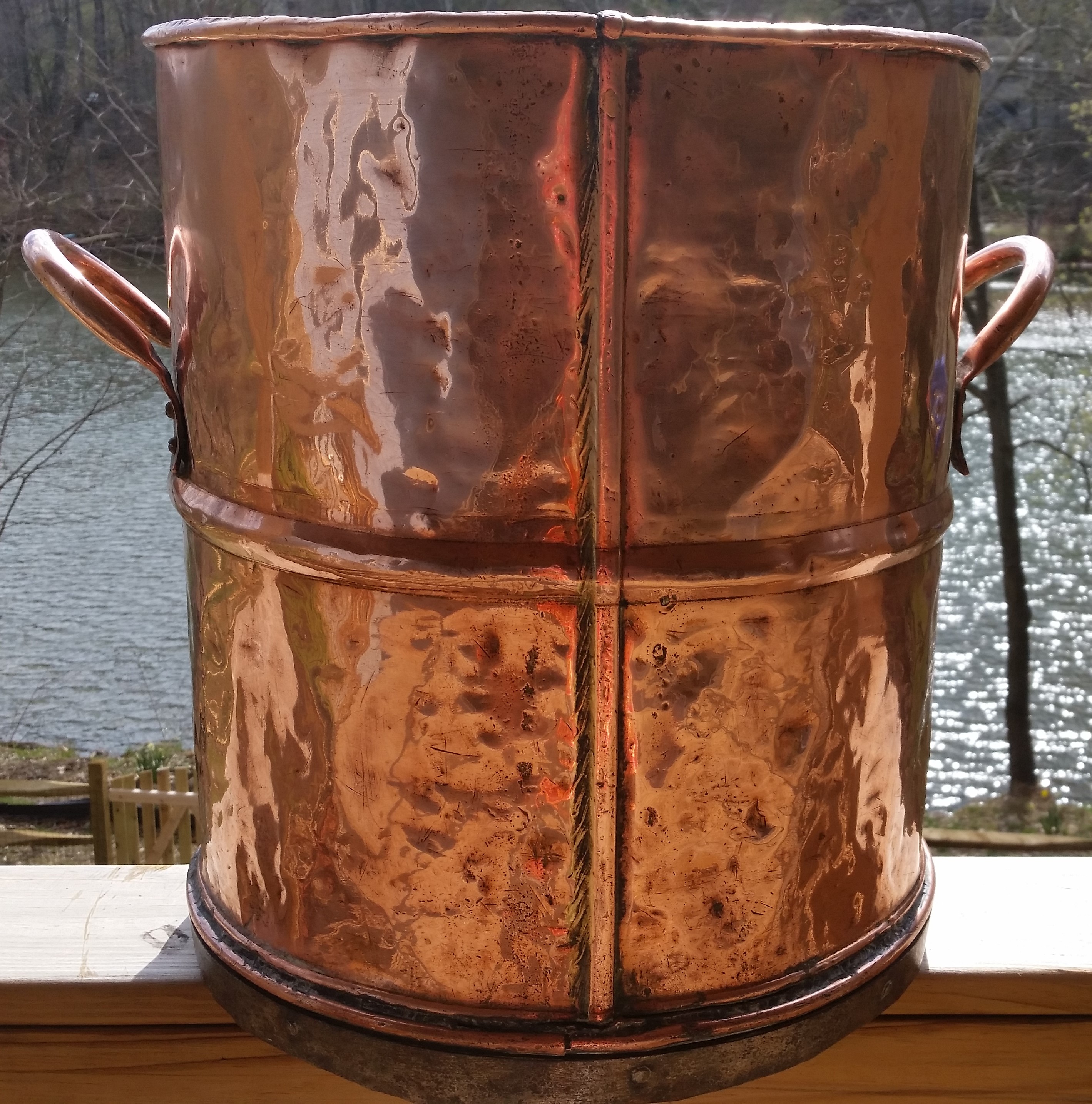 This 19th century English copper log bin (with steel bottom) was originally used on board an English ship. Brass handles were added later. It is 18 inches tall and 15 inches diameter. The bottom is made of steel and is welded and riveted onto the sides. The steel band has some corrosion but is structurally sound (see picture below).