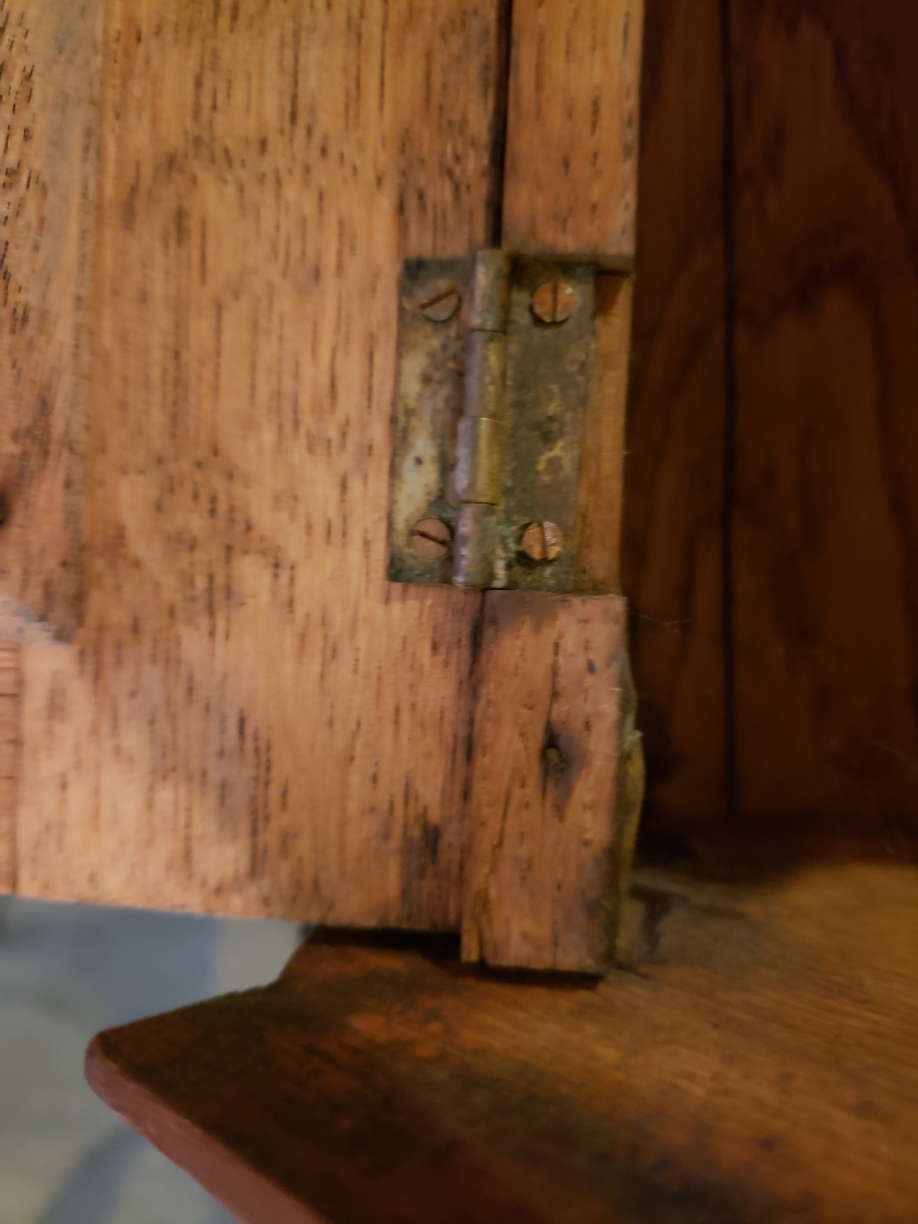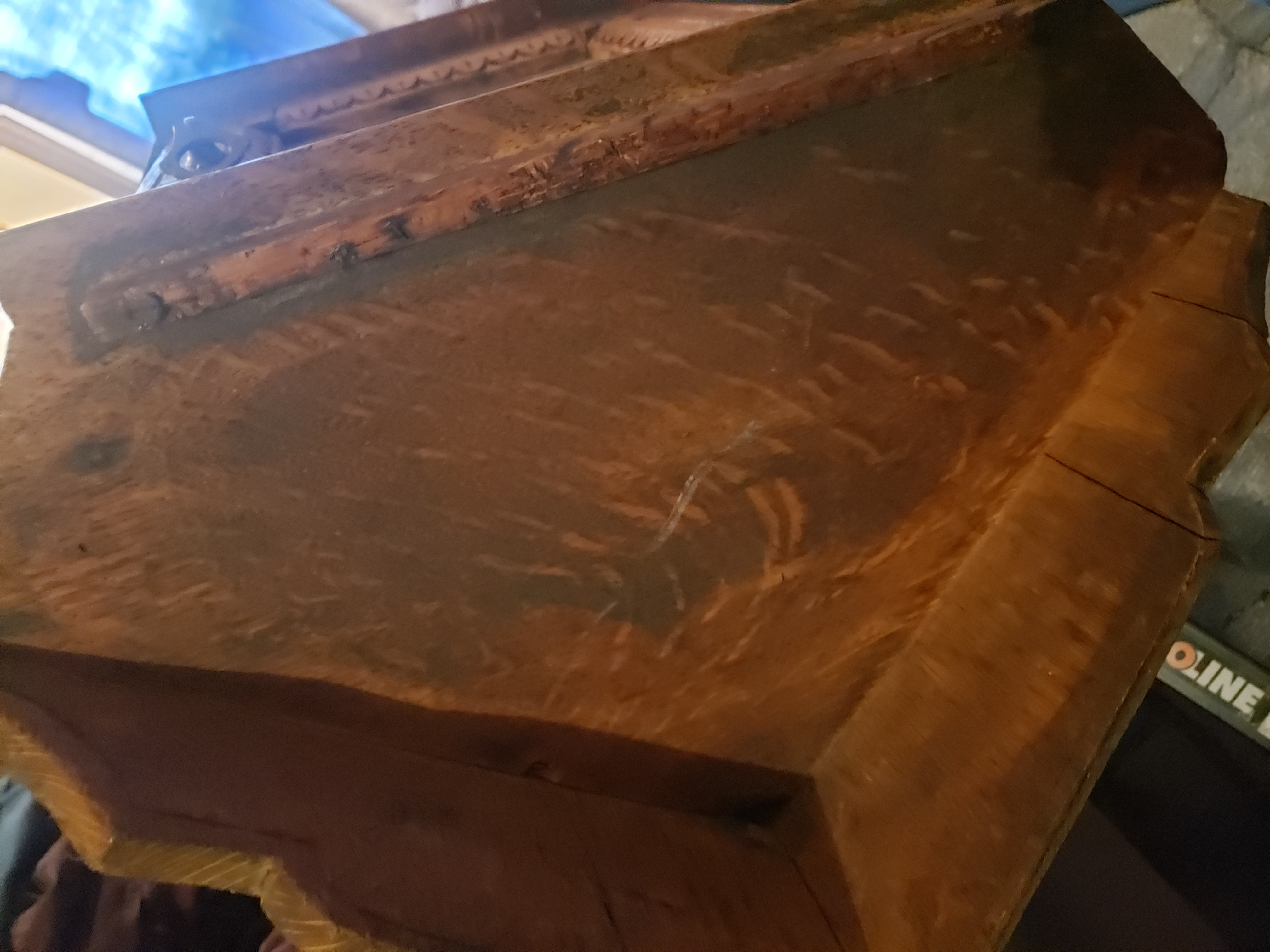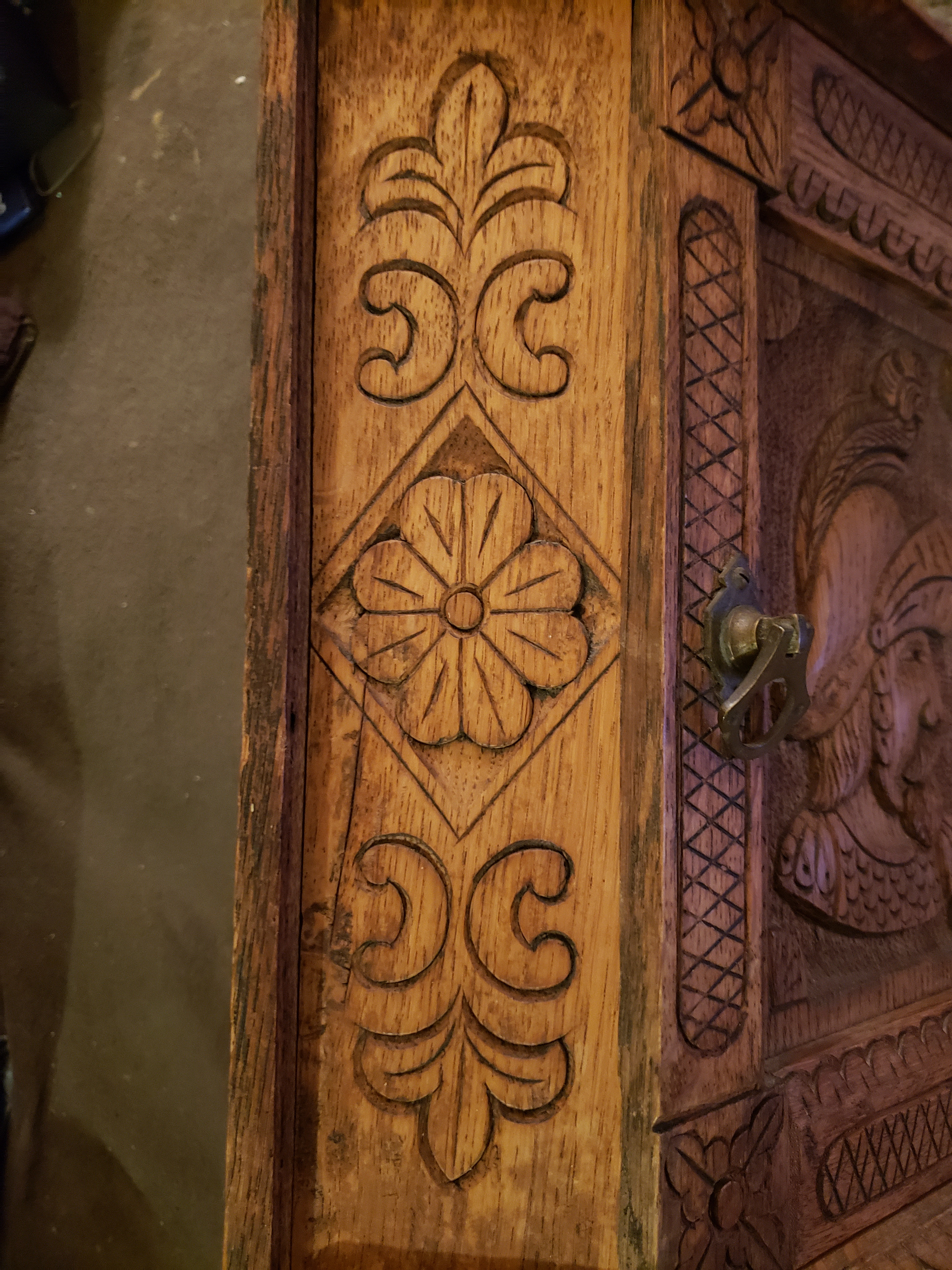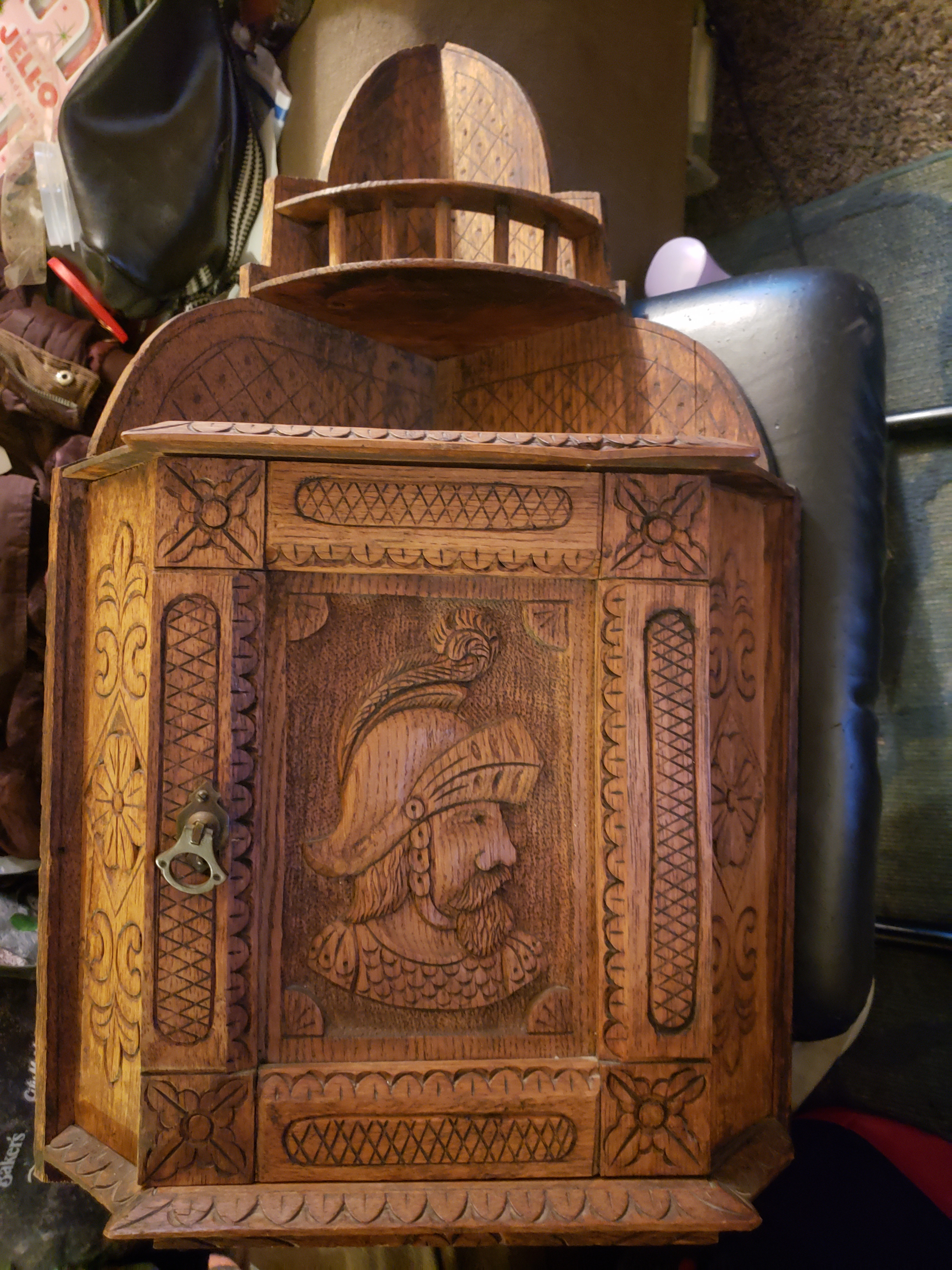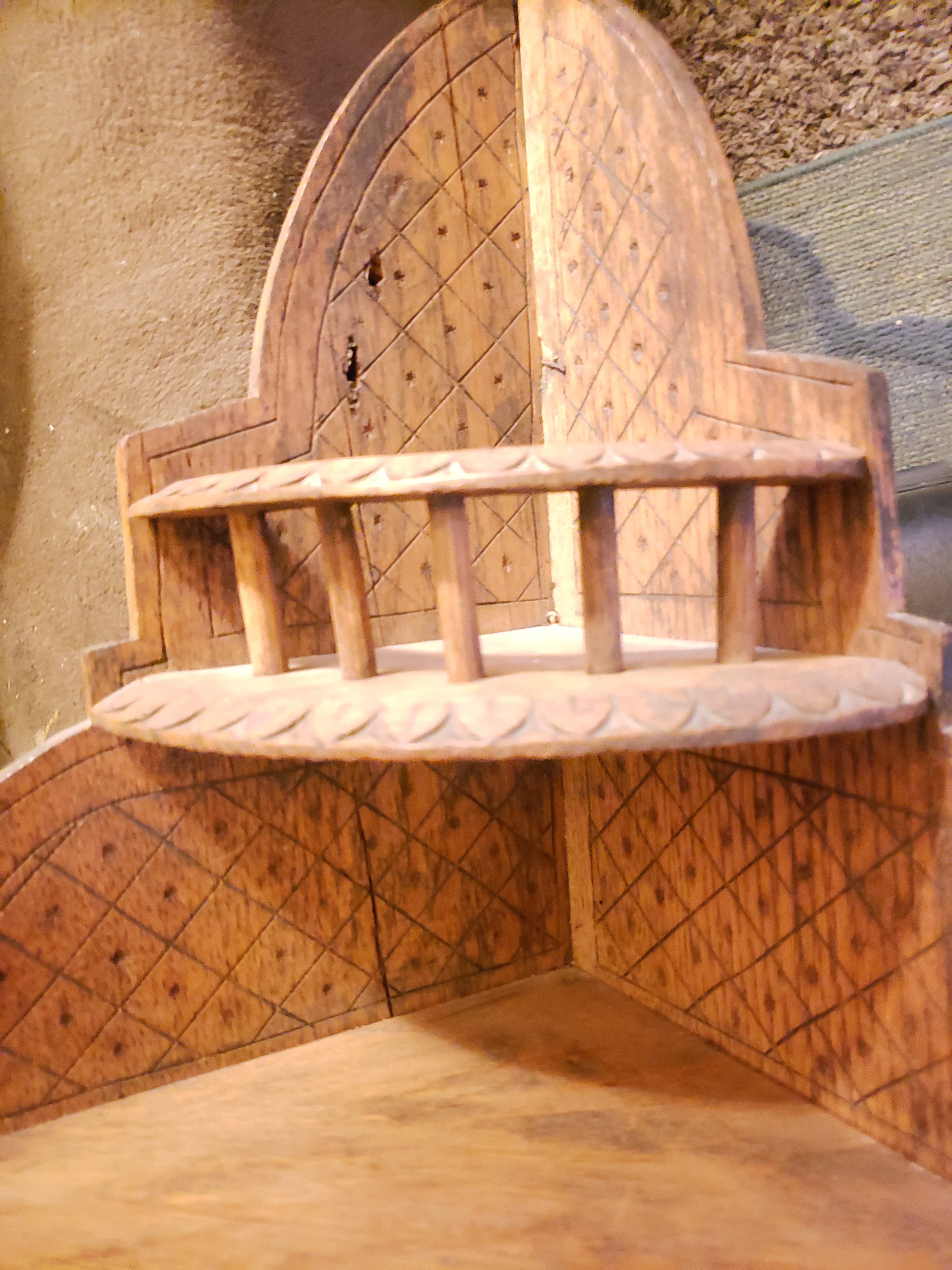 Hand-Carved wooden corner cupboard. Previous owner was my sister's grandfather inlaw who owned an antique shop on the Oregon Coast before he passed away. Height of entire piece is 29": Width is 16". Opening of cupboard is about 10". Max depth of cupboard opening is 8". If you have any further questions, please let me know. I'd like to know an approximate value. I intend to sell this piece.
