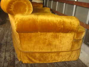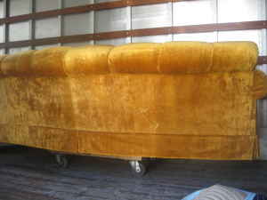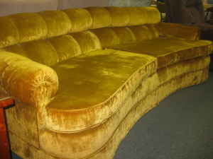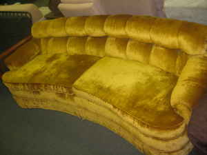 A very interesting combination.As you can see its a little bit of everything.Its got Bridgewater styling with English features and a curved or Serpentine seat.Its on wheels and was recovered in this velvet material in 1971.Theres a whole other sofa underneath this material and when i put my hand under it i feel all kinds of metal straps not springs.It was well taken care of and is in great shape but i don't know what to do with it its in the movers box truck now and i'm thinking about tearing this fabric off to find out if whats underneath it is valuable.The color is Gold as in the one side picture not off green as some look.If anyone knows what this is i'd appreciate it.