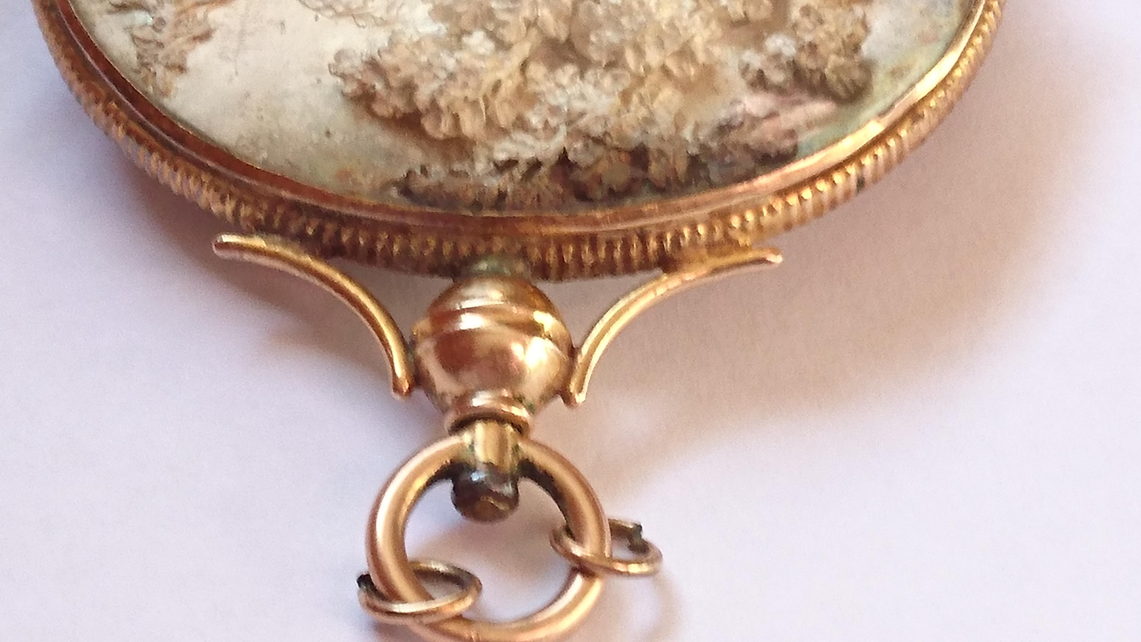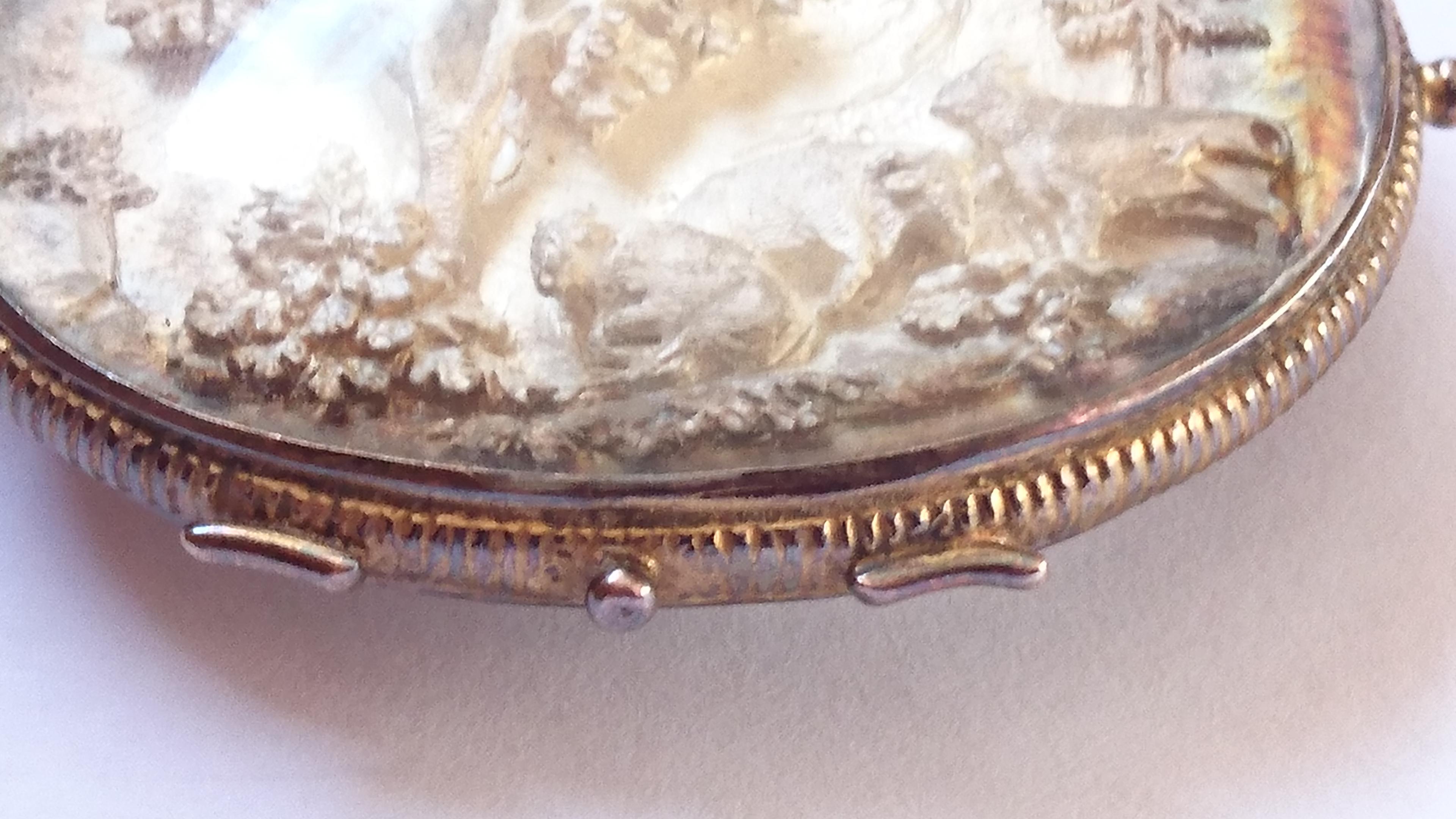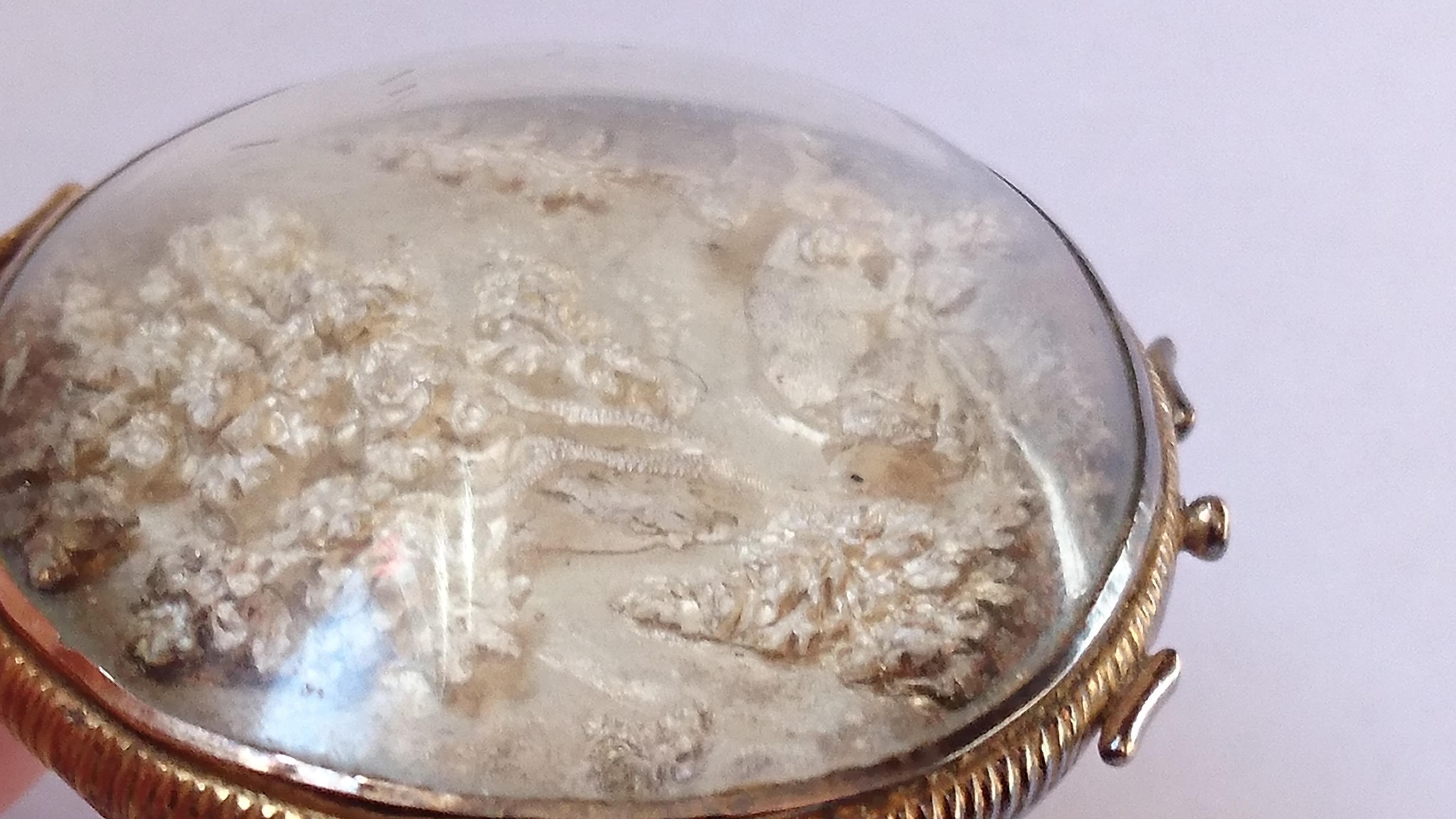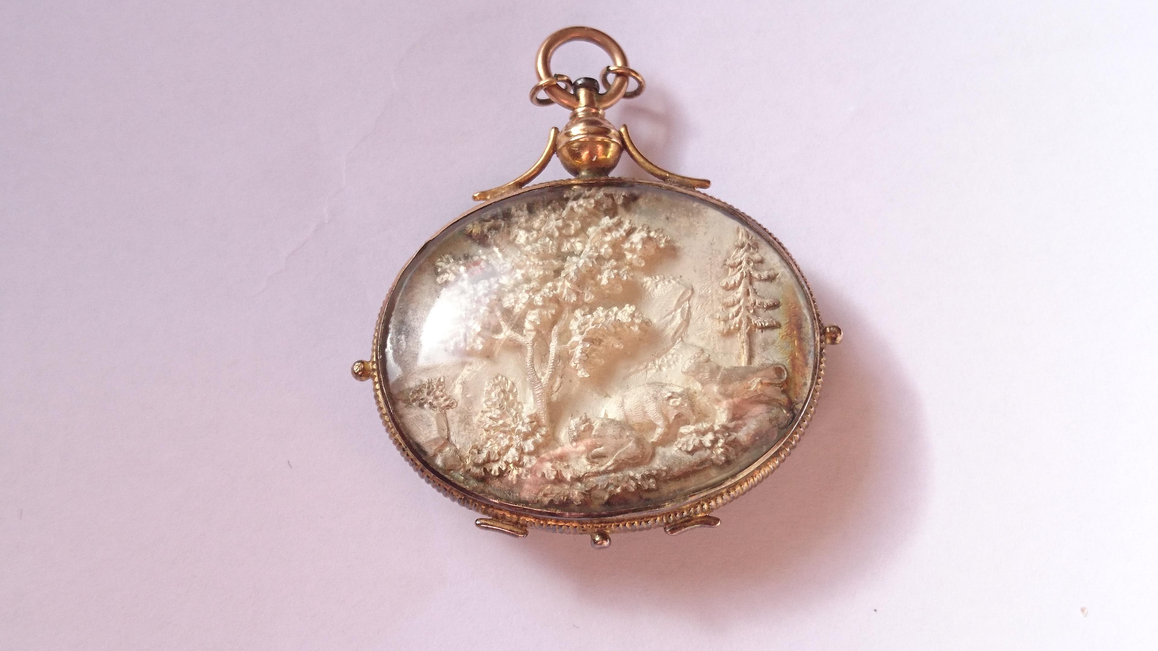 Sealed antique pendant type, with silver engraving, behind glass. 4.3cm x 3.5cm not including top and hooks. I am not sure what it is, or if it has a name. Would be great if anyone knows what it is and roughly how old it is.