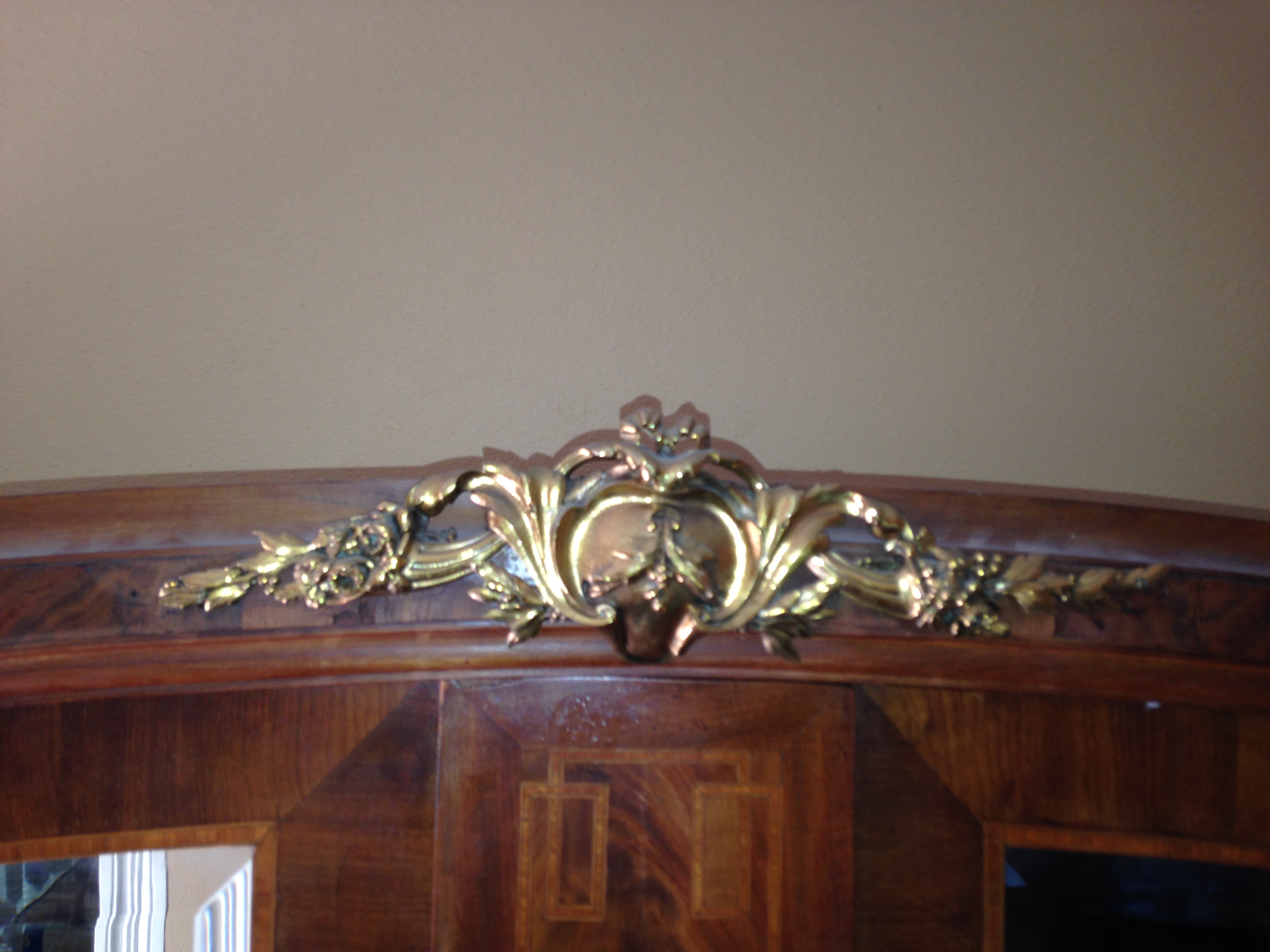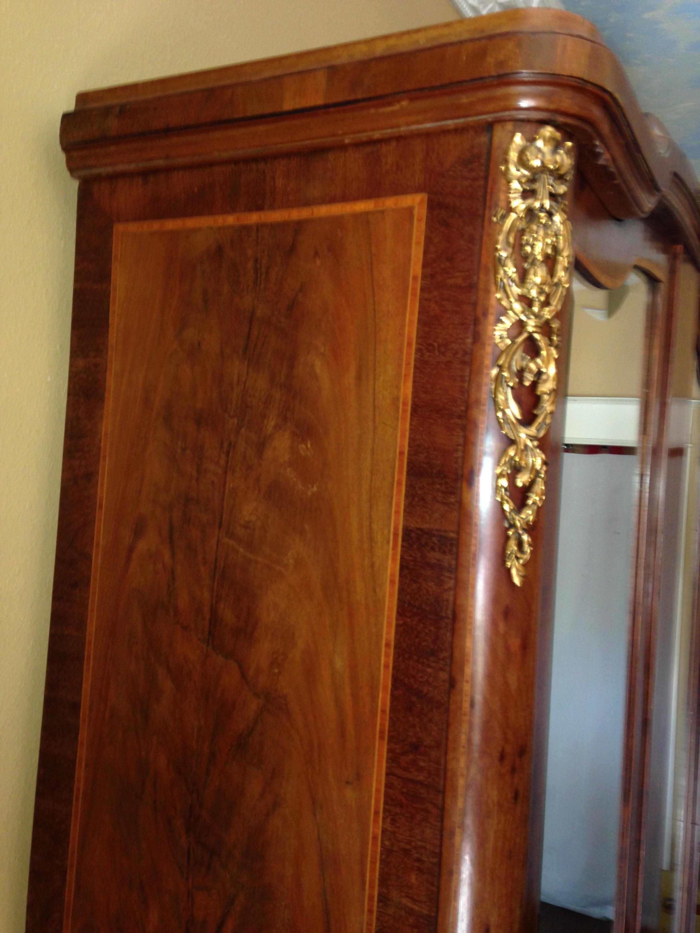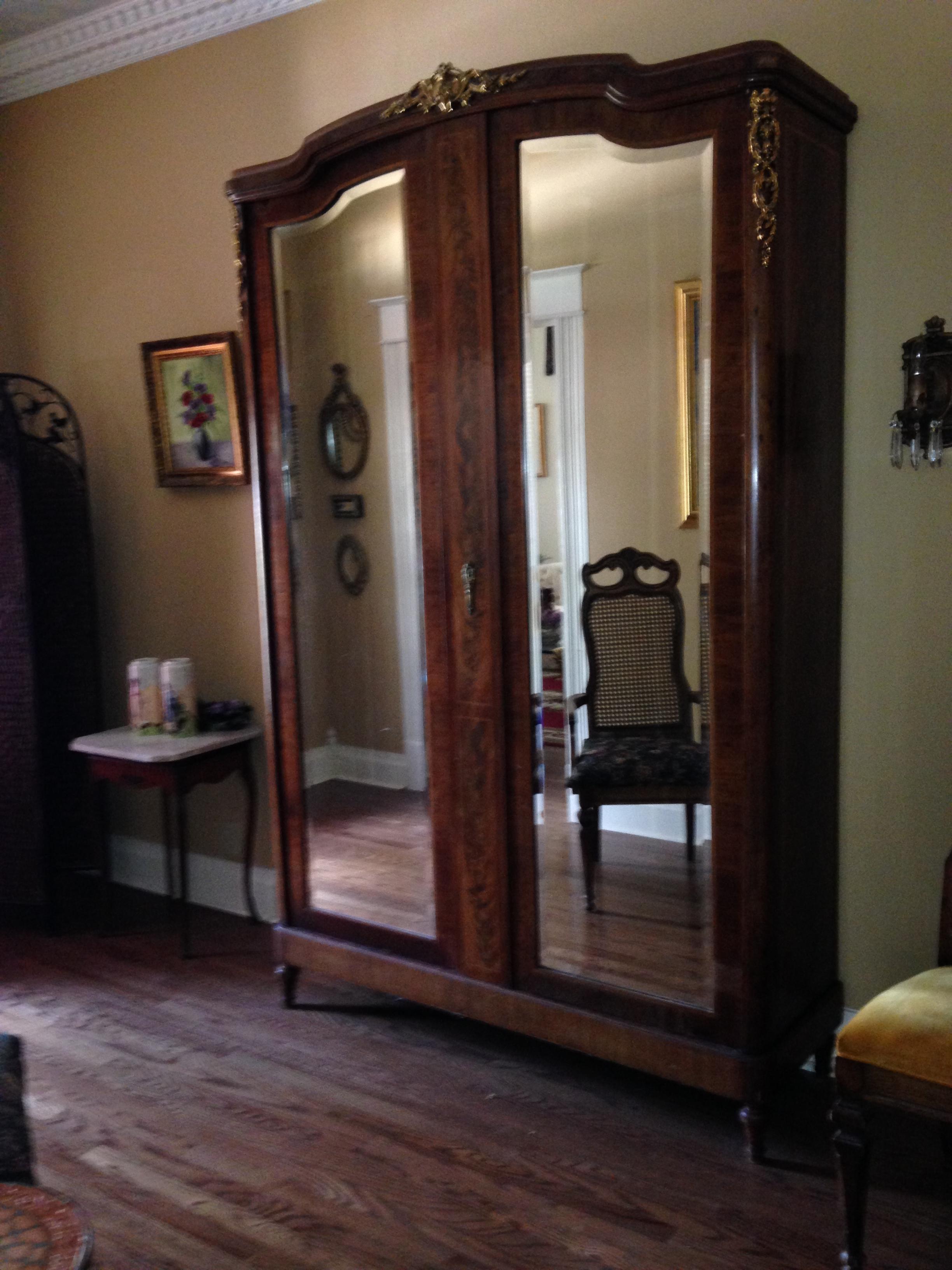 My mother-in-law bought this armoire from the second owner. It is a "knockdown" armoire with beveled mirrors, 3 adjustable shelves and two drawers. She had paperwork on it, but cannot find the paperwork now. She was told it was mid-19th century and was brought to West Texas by wagon by the original owners. It is very heavy. There are a couple of hairline cracks in the wood. There is a 3" x 4" hole in the back from a fall when moving it. There also seems to be a piece of the top center brass (unsure of material) broken off of the left hand side.