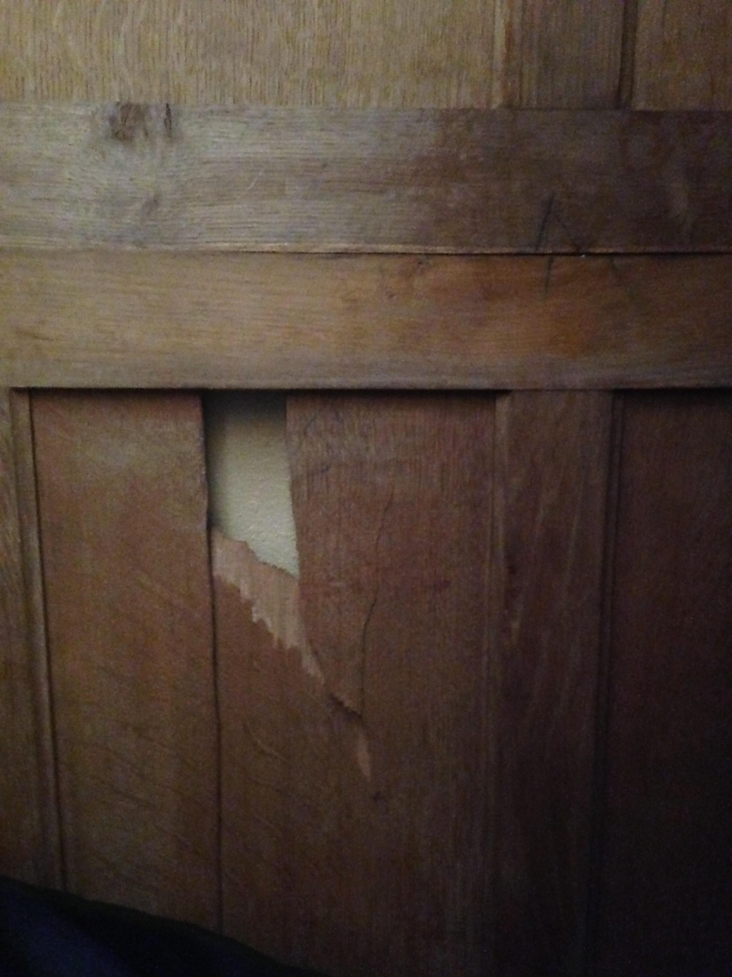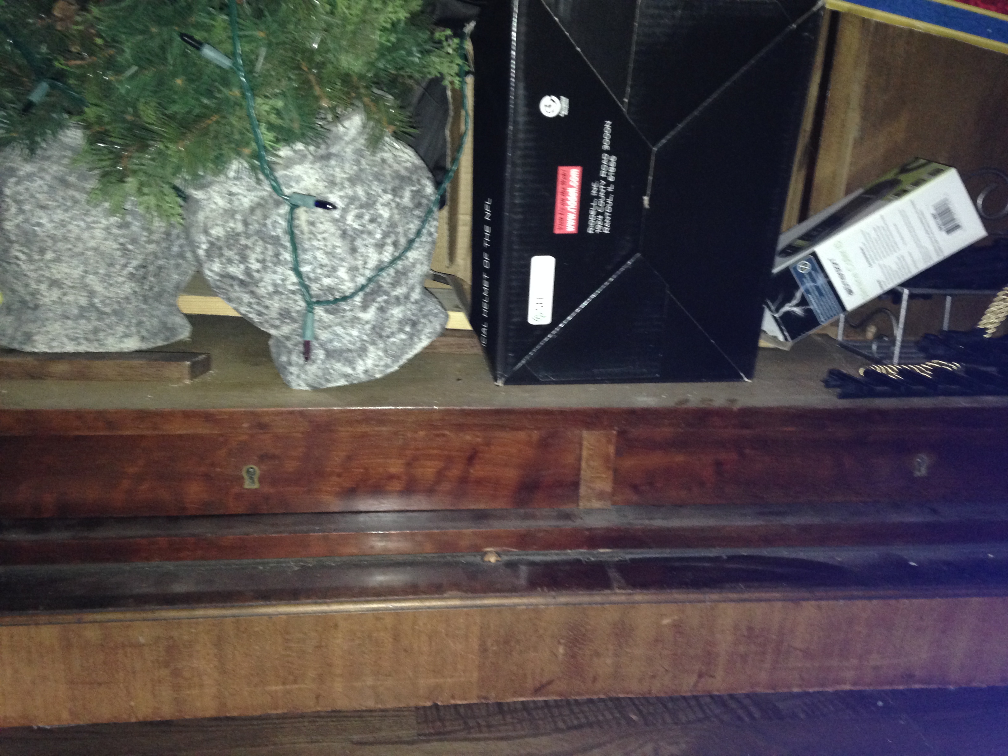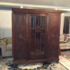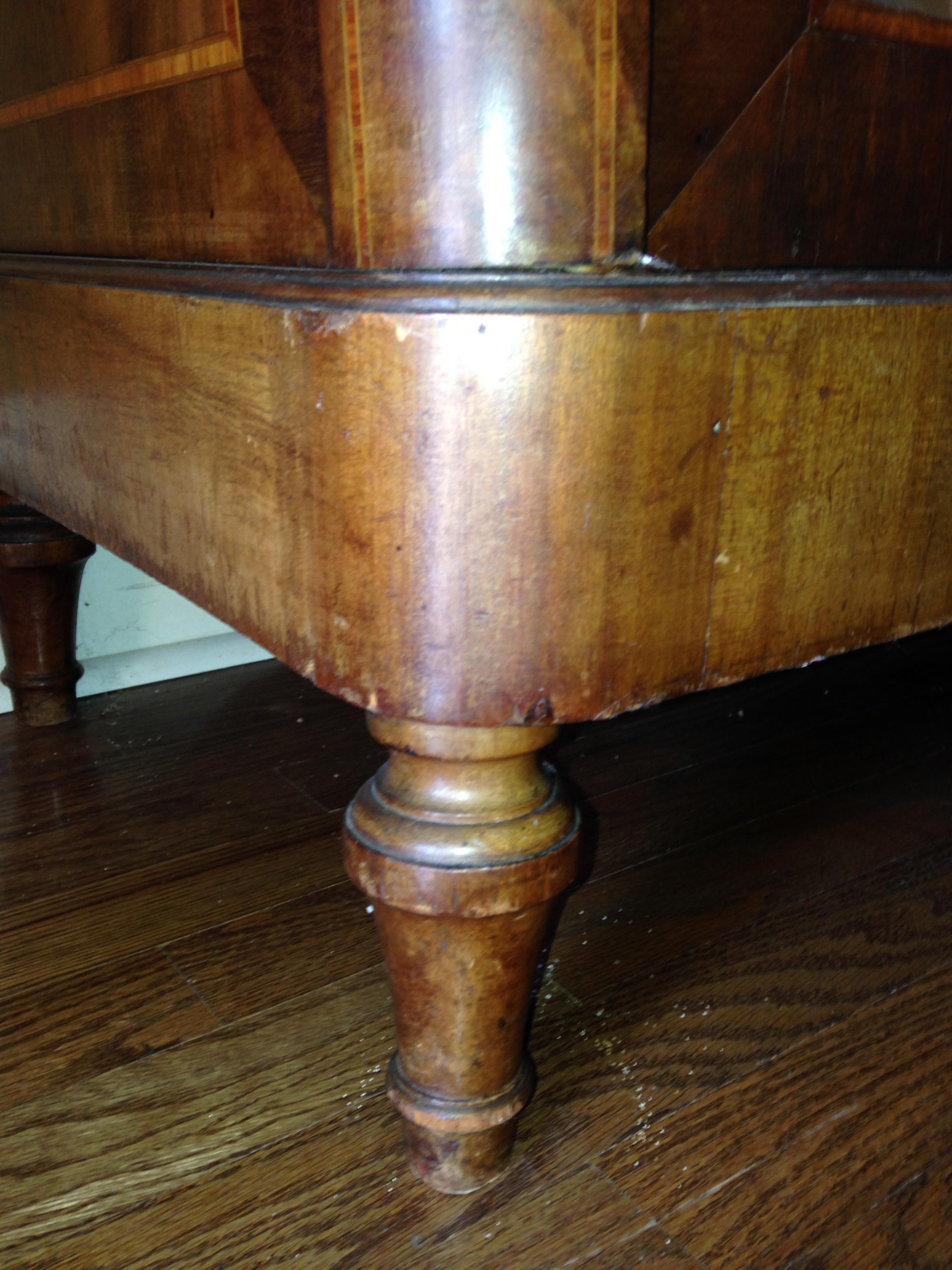 My mother-in-law bought this armoire from the second owner. It is a "knockdown" armoire with beveled mirrors, 3 adjustable shelves and two drawers. She had paperwork on it, but cannot find the paperwork now. She was told it was mid-19th century and was brought to West Texas by wagon by the original owners. It is very heavy. There are a couple of hairline cracks in the wood. There is a 3" x 4" hole in the back from a fall when moving it. There also seems to be a piece of the top center brass (unsure of material) broken off of the left hand side.