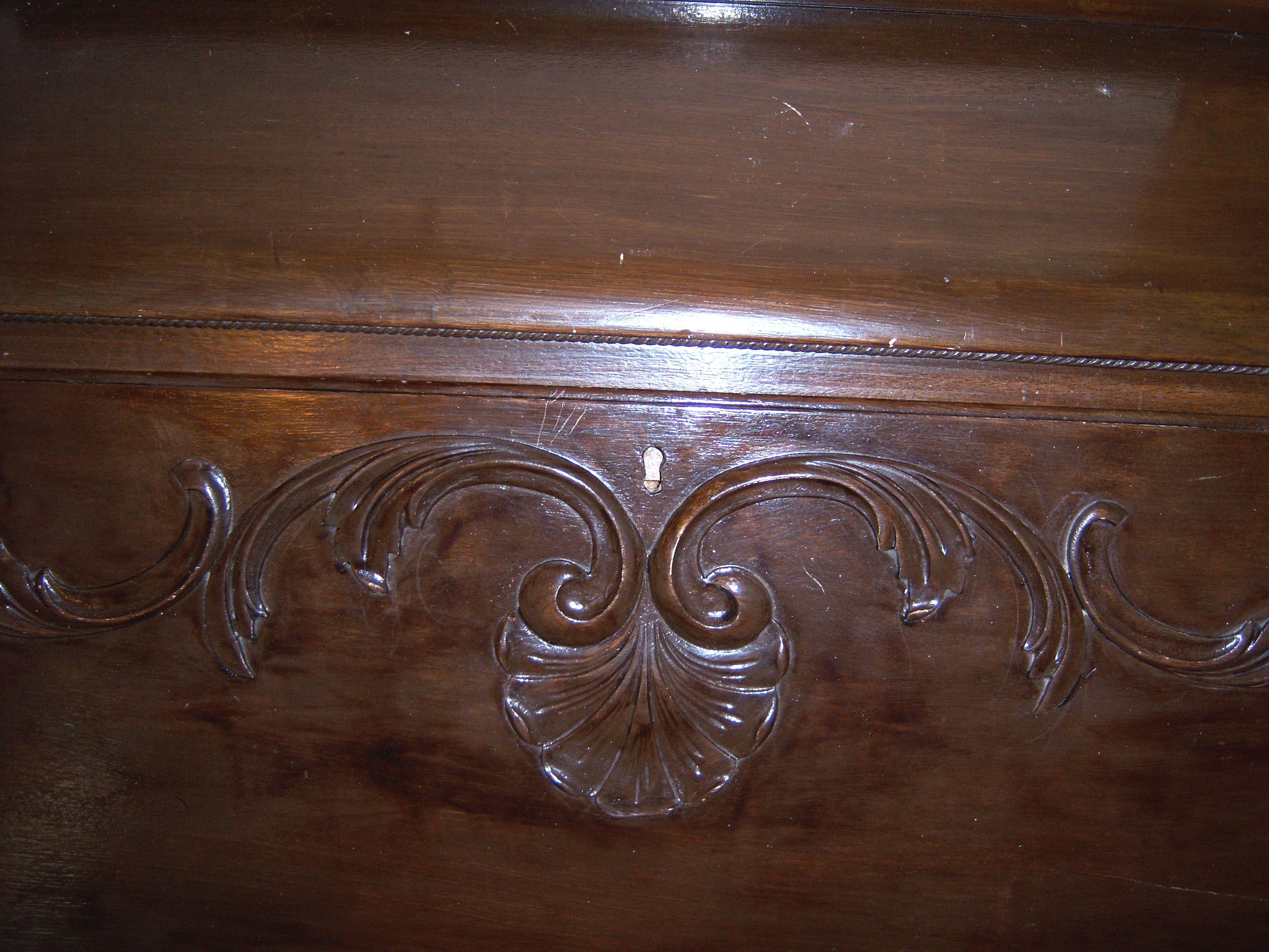 What makes this piece special is the carving. The panel has a swirling fleur-de-lis pattern with a fan in the center, all intricately carved.