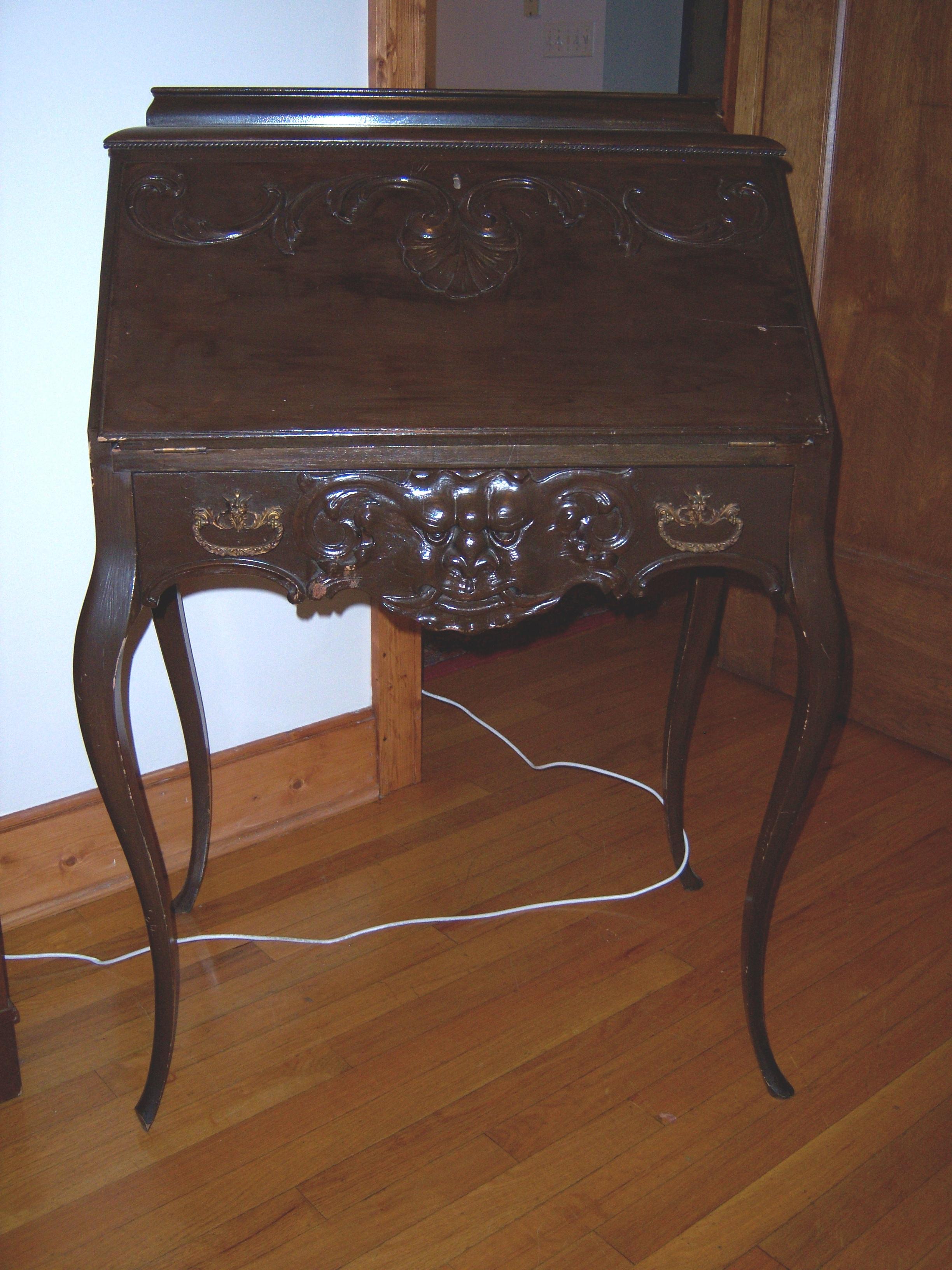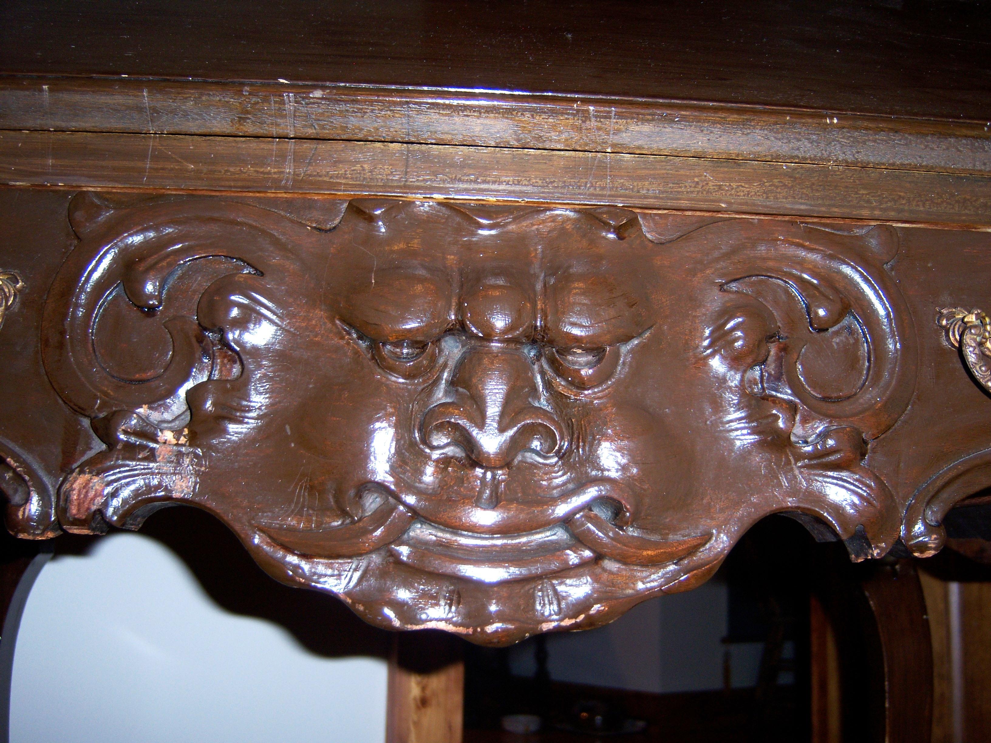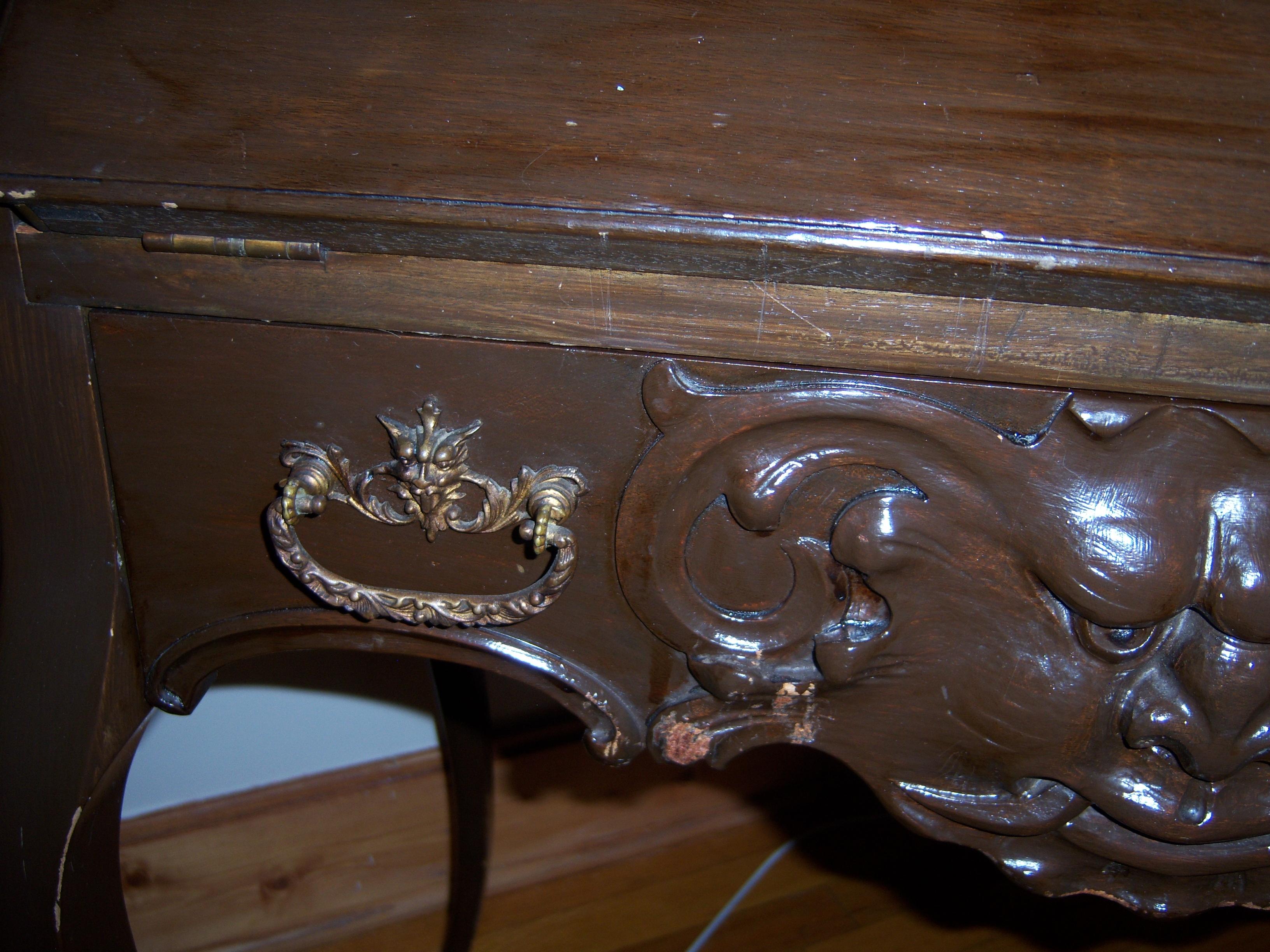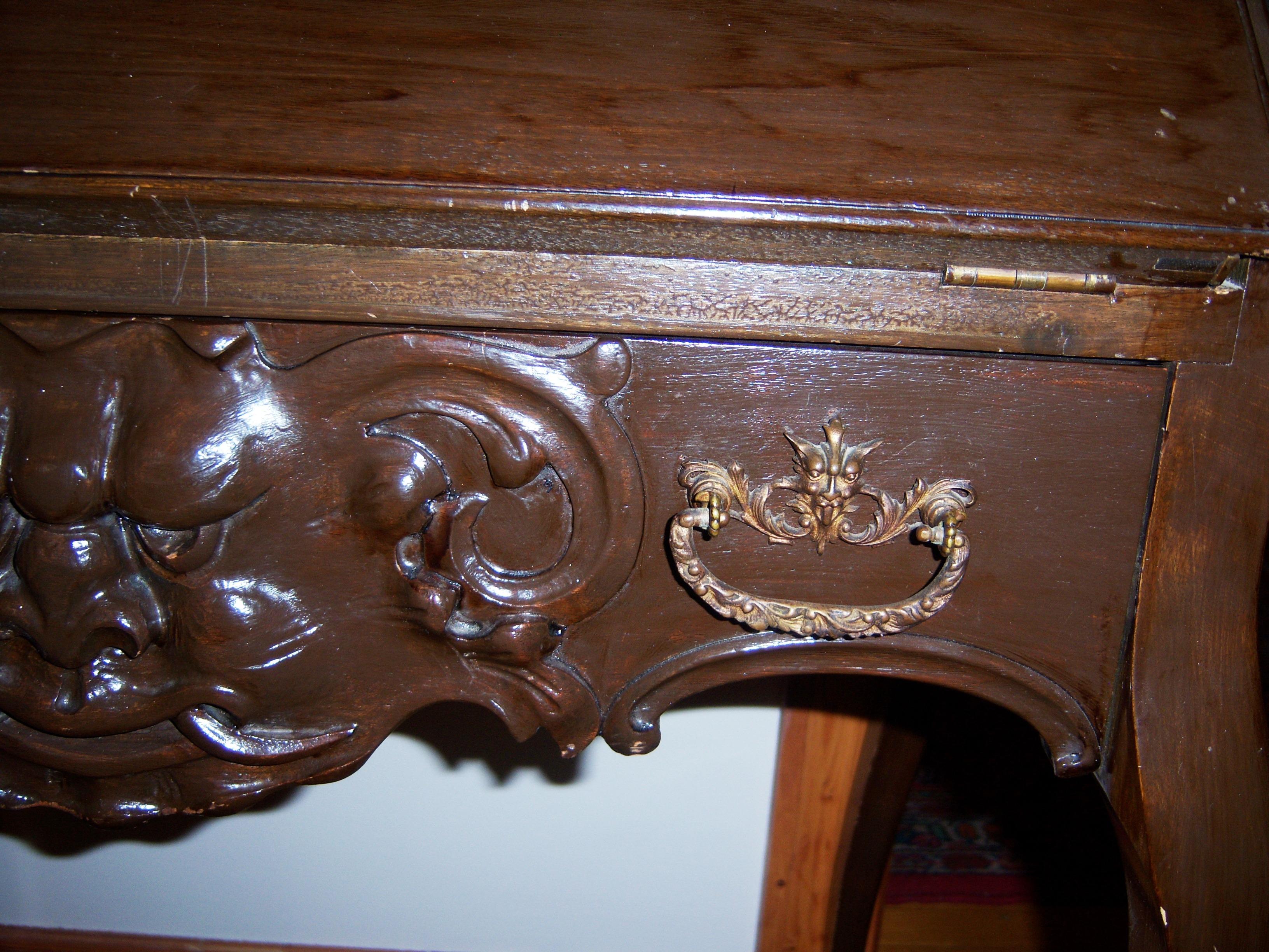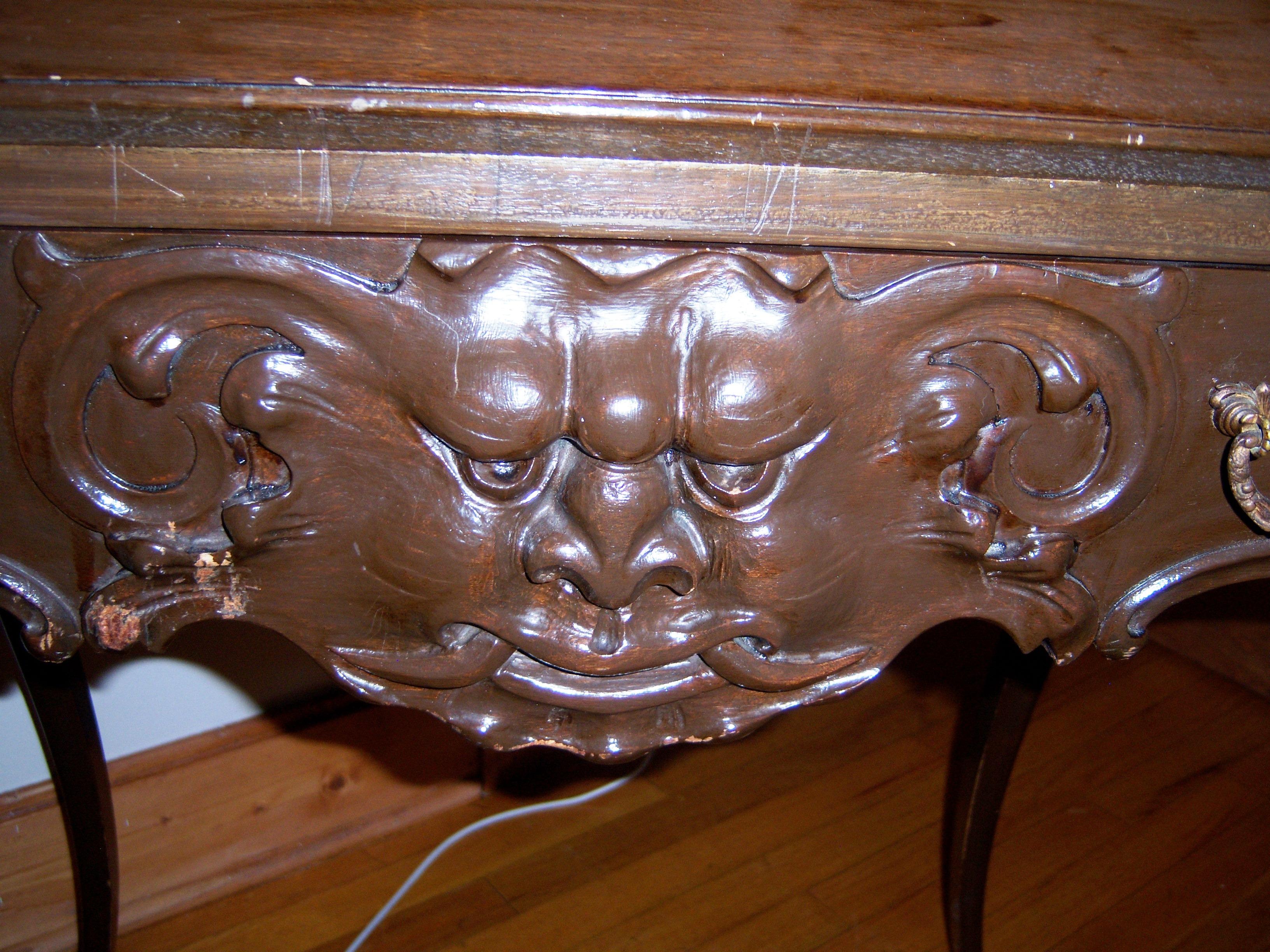 There is slight damage at the left side (as you face it) of the carved face on the drawer. There is also a panel missing from the back, though that doesn't show at all from the front. Otherwise this desk is in excellent condition.