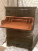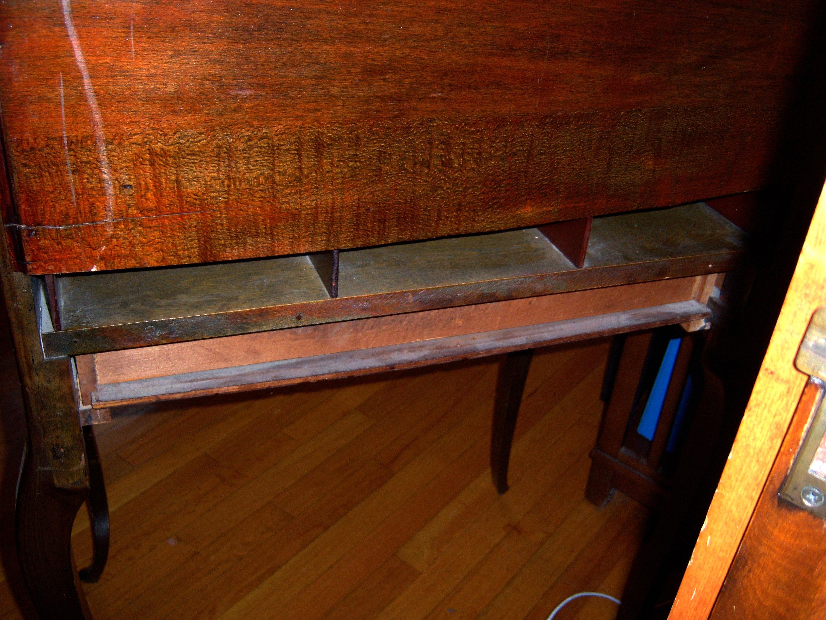 The desk is 38" tall, 27" wide, and 18" deep. It stands on gracefully bowed slender legs. The front panel is slanted and swings down to create a flat writing surface and to reveal letter/envelope slots and a small (8" x 3") drawer. The hinges are intact, the writing surface flat and solid.