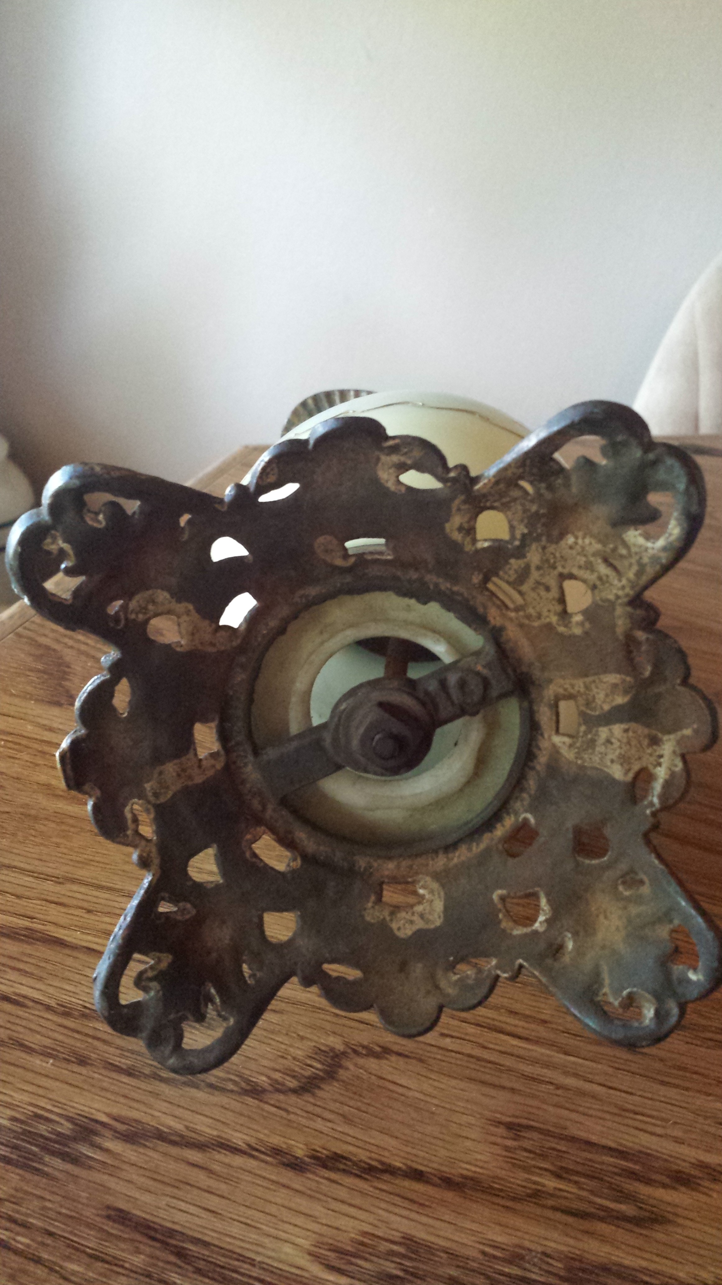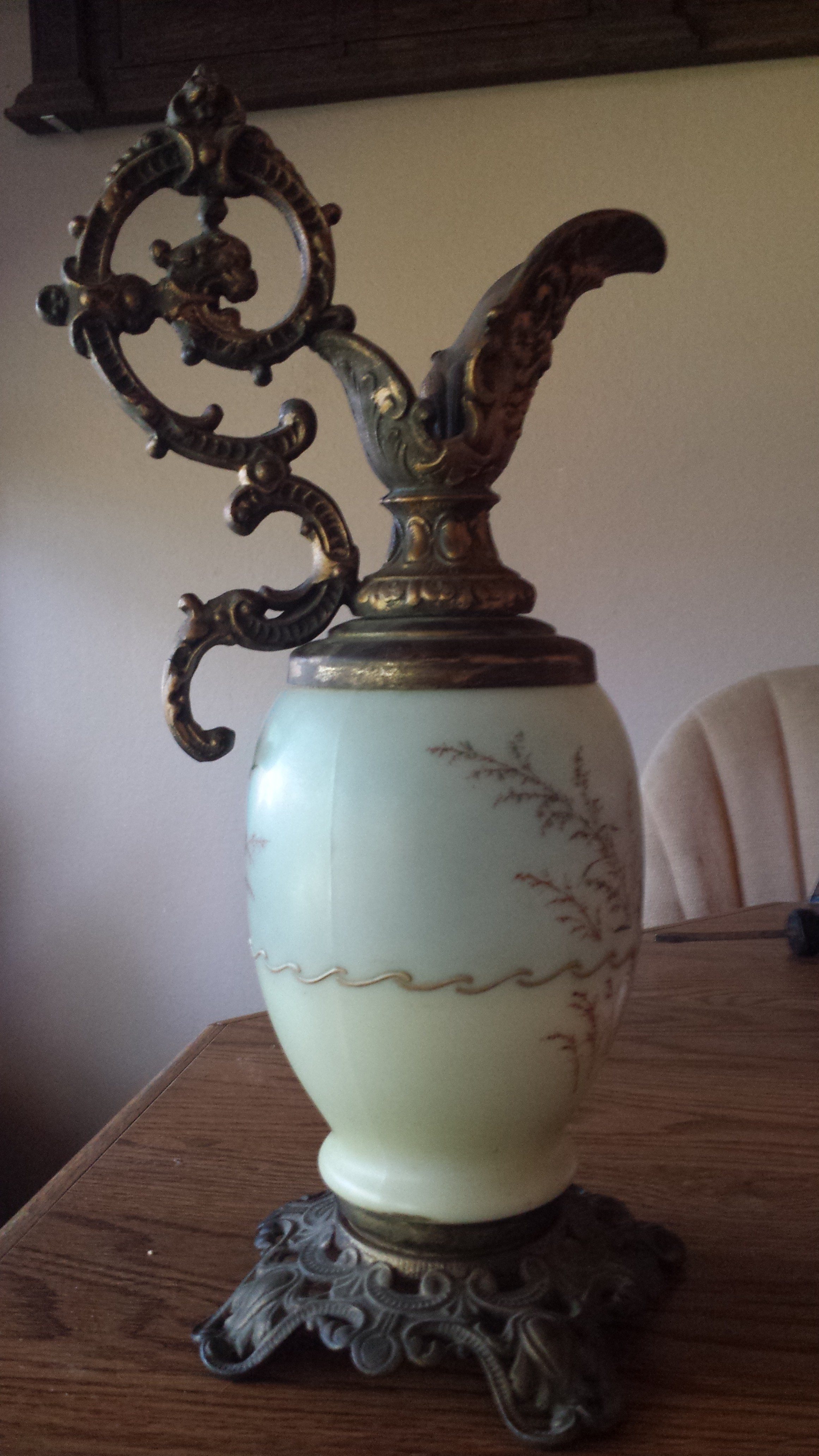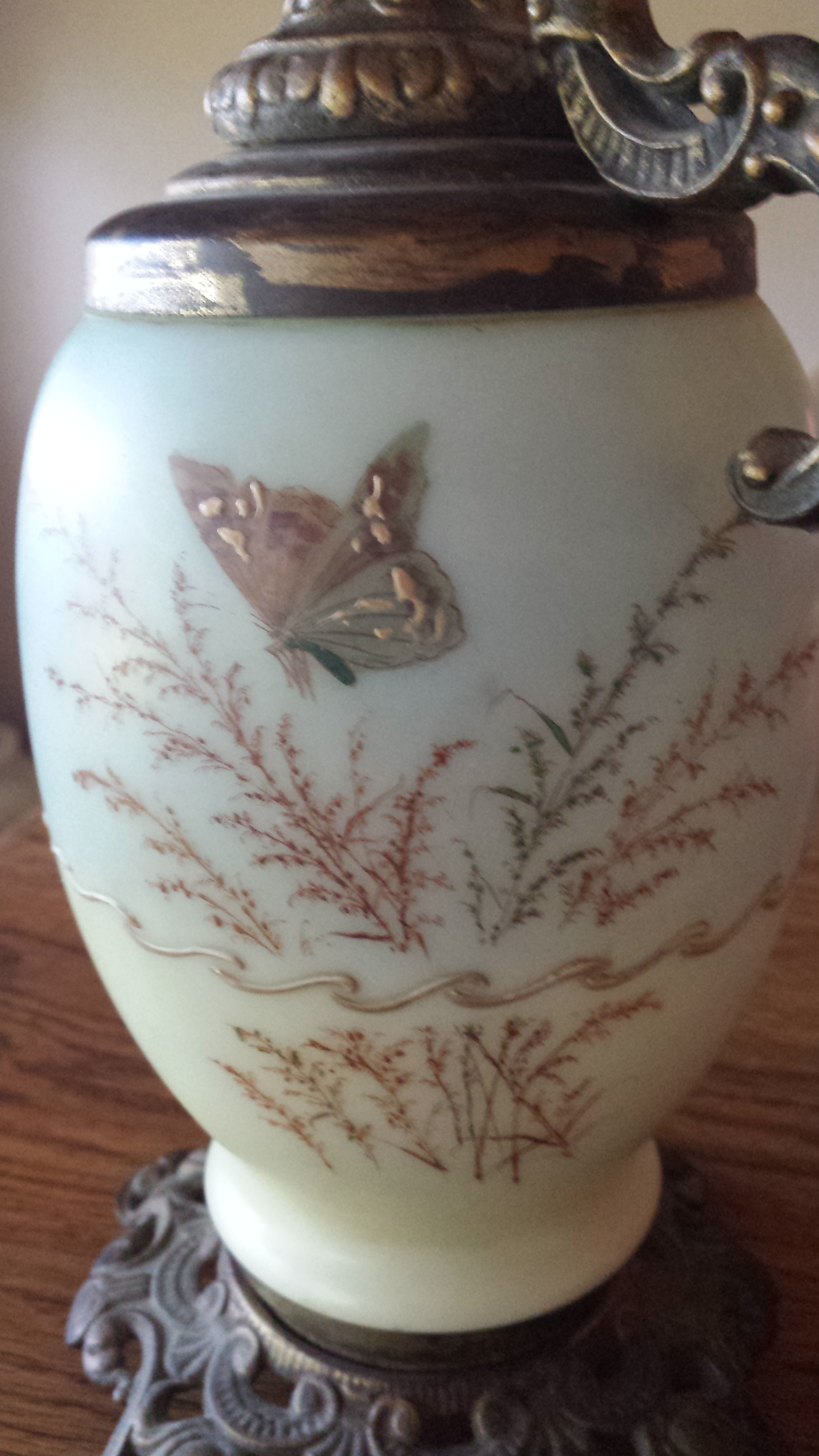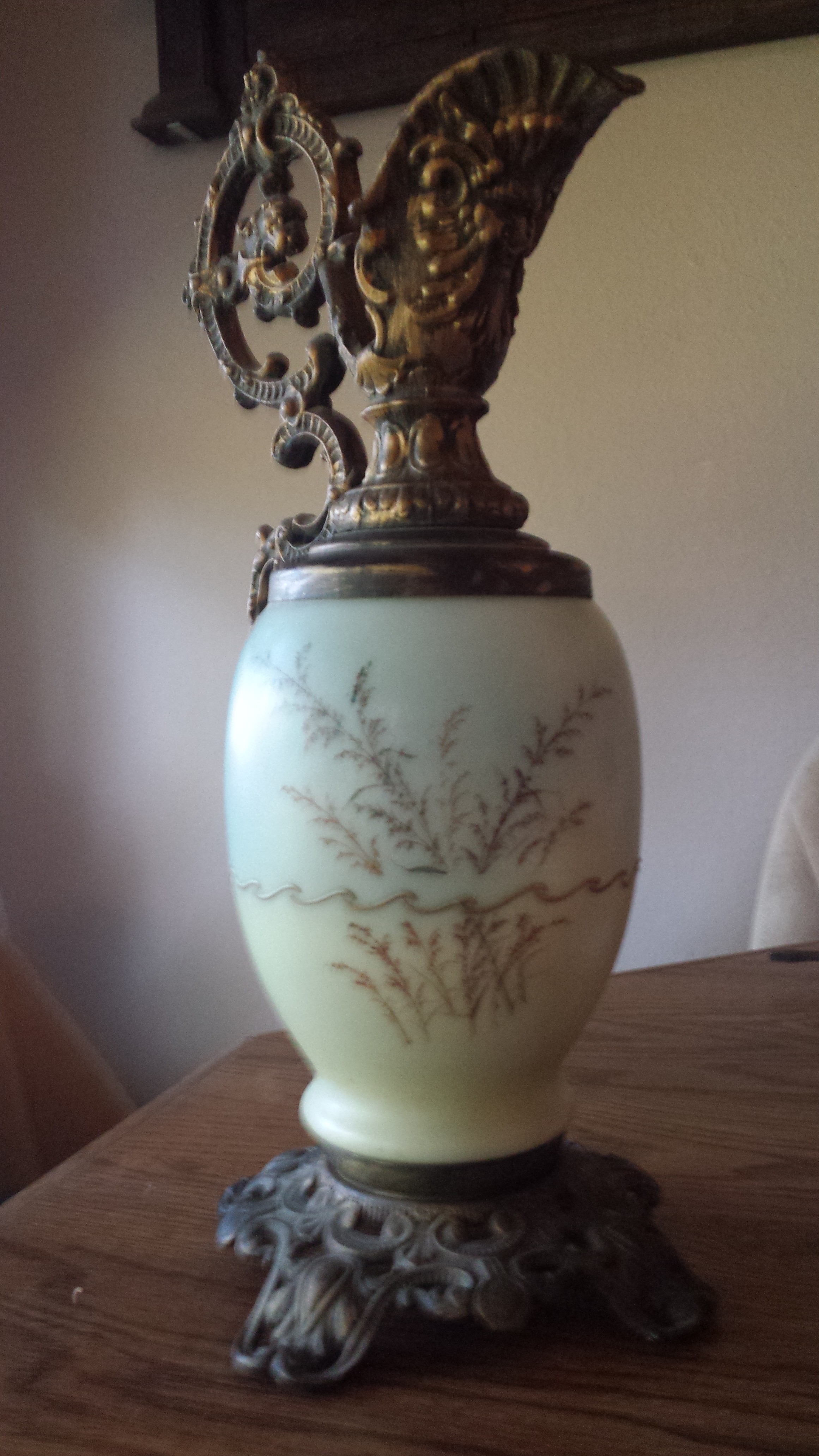 This decorative ewer has a metal base and metal spout. This is not a functional ewer, it is hollow inside, has an open bottom with a metal rod through it. The spout is closed off and does not hold liquid. The middle section is made of a cream colored thick, smokey glass. The handpainted design is in gold and browns. One side has a painted butterfly with plant stems, the other side has just the plant stems. There is a wavy gold band painted around the center. The glass is all one piece, however the top half of the glass is a slightly darker color than the bottom half. The only marking on the item is 101 stamped into the metal on the bottom.