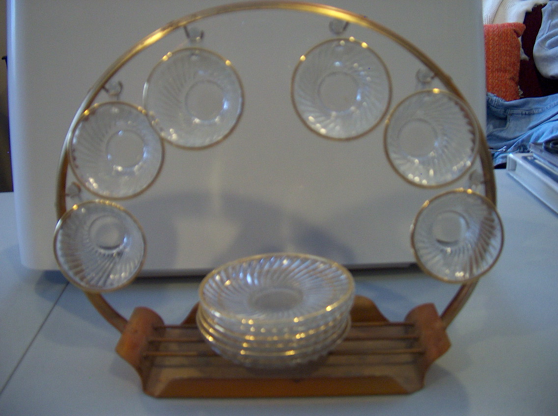 without seeing thm close up, they look like a type of Hocking Glass in a pattern known as Spiral. It was made in 1928-1930. It was made in clear and green. I don't know if the clear was ever produced with a gold rim. I might suggest searching sold listings for Spiral pattern , Hocking Glass on ebay. I have tried to sell a pitcher in the spiral pattern in clear glass and had no interest at all. Not sure if any of this helps, but at least you know people are looking ...good luck!