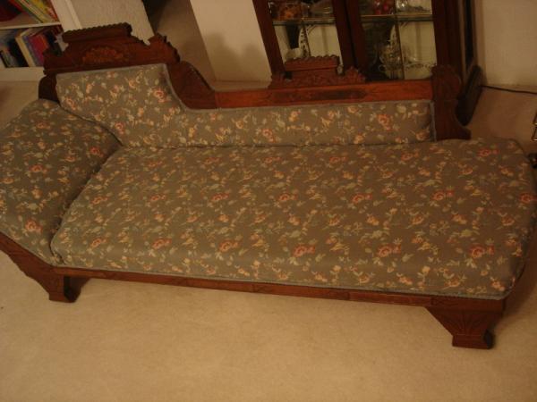 The upholstery is a federal blue color, the ornate pieces on the back are removable. I heard it was hand crafted in the Mid-west, but I cannot confirm this. It has small porcelain casters, they look to be original. This is in near excellent condition, with no damage to it.