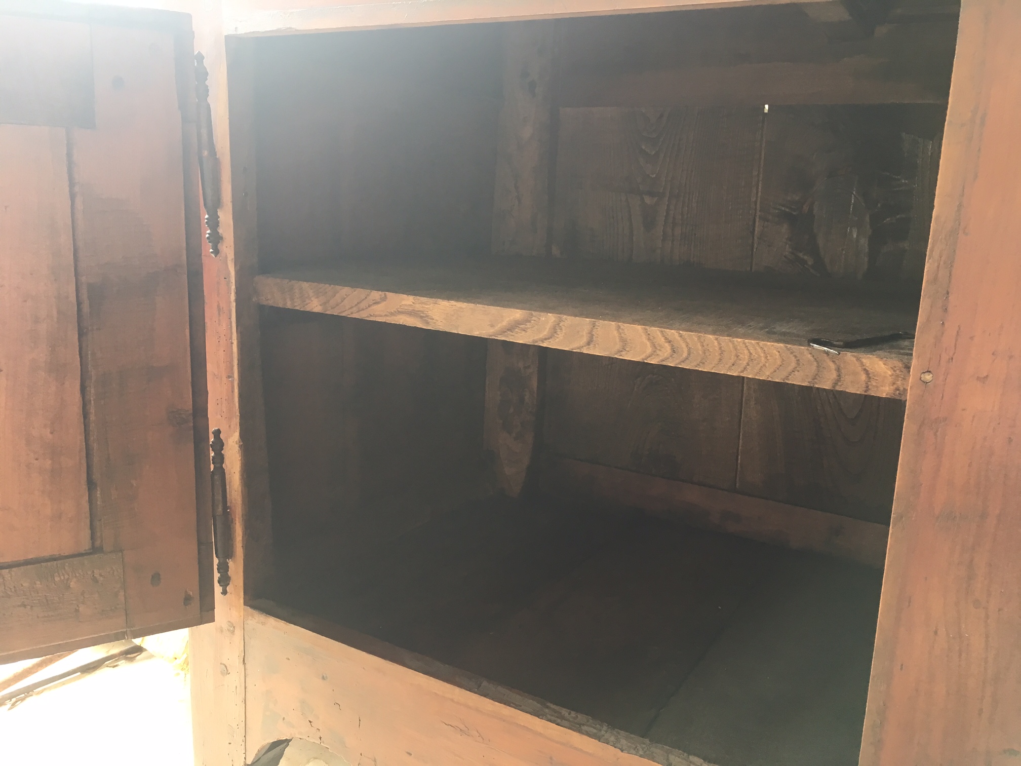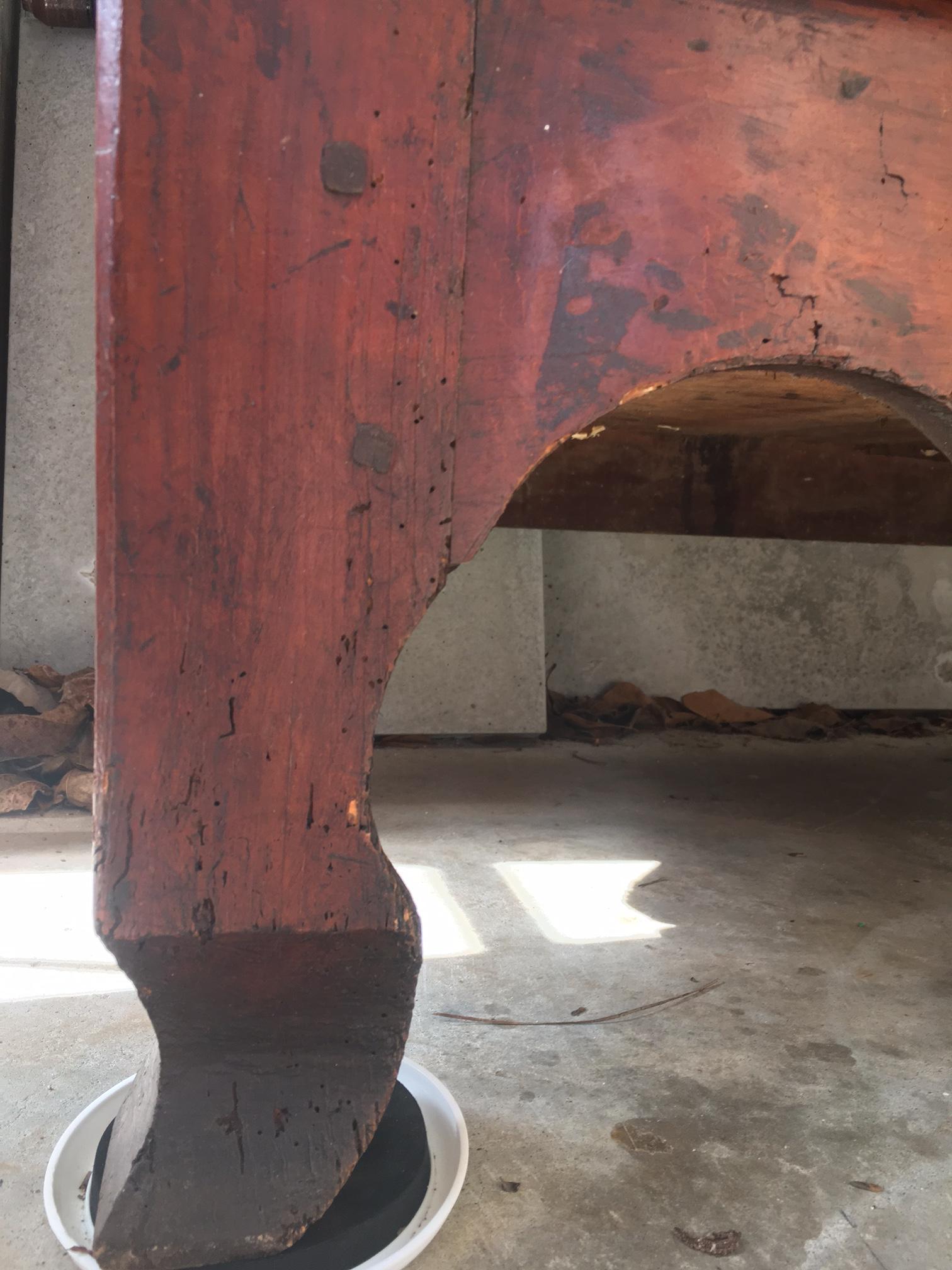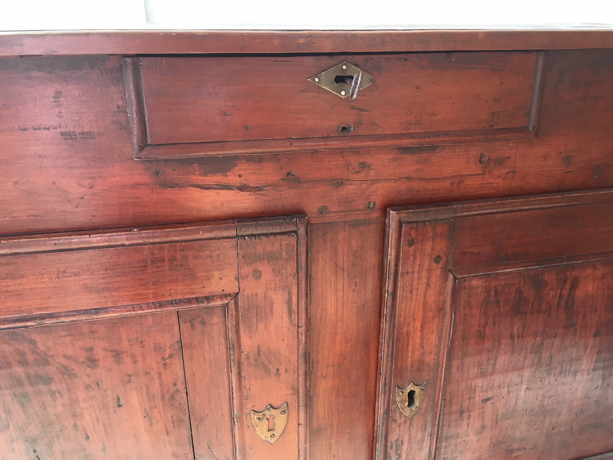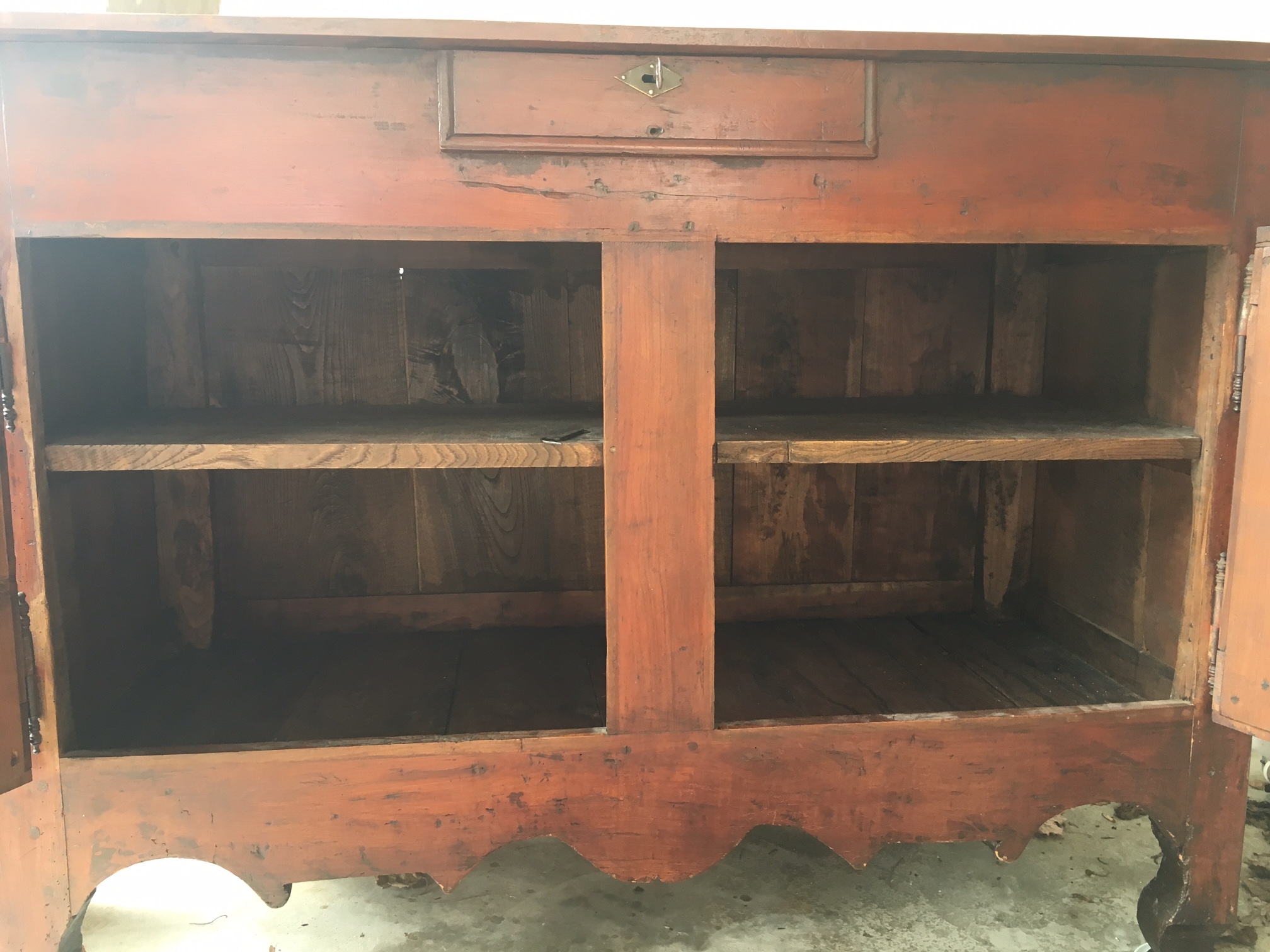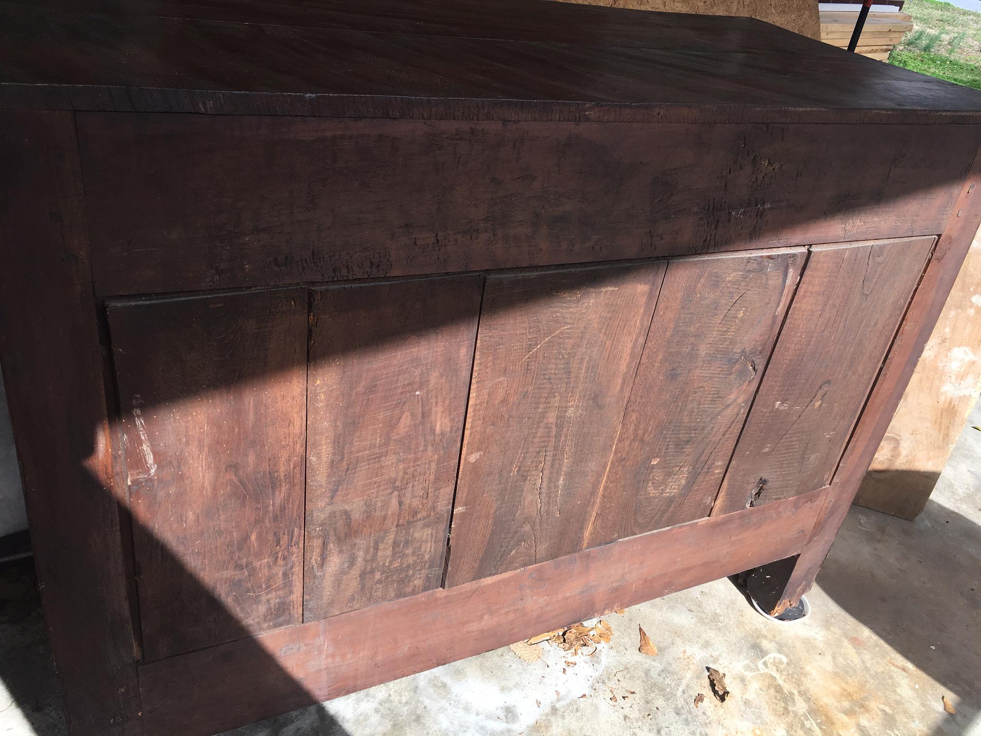 Antique buffet/serving table with beautiful design, unique hardware and ample storage. It has some imperfections, primarily on the back lower legs, but overall is in great condition. All drawers and locks are functional. We aren't sure when it was made and also can't tell the type of wood that was used. Any information would be very helpful!