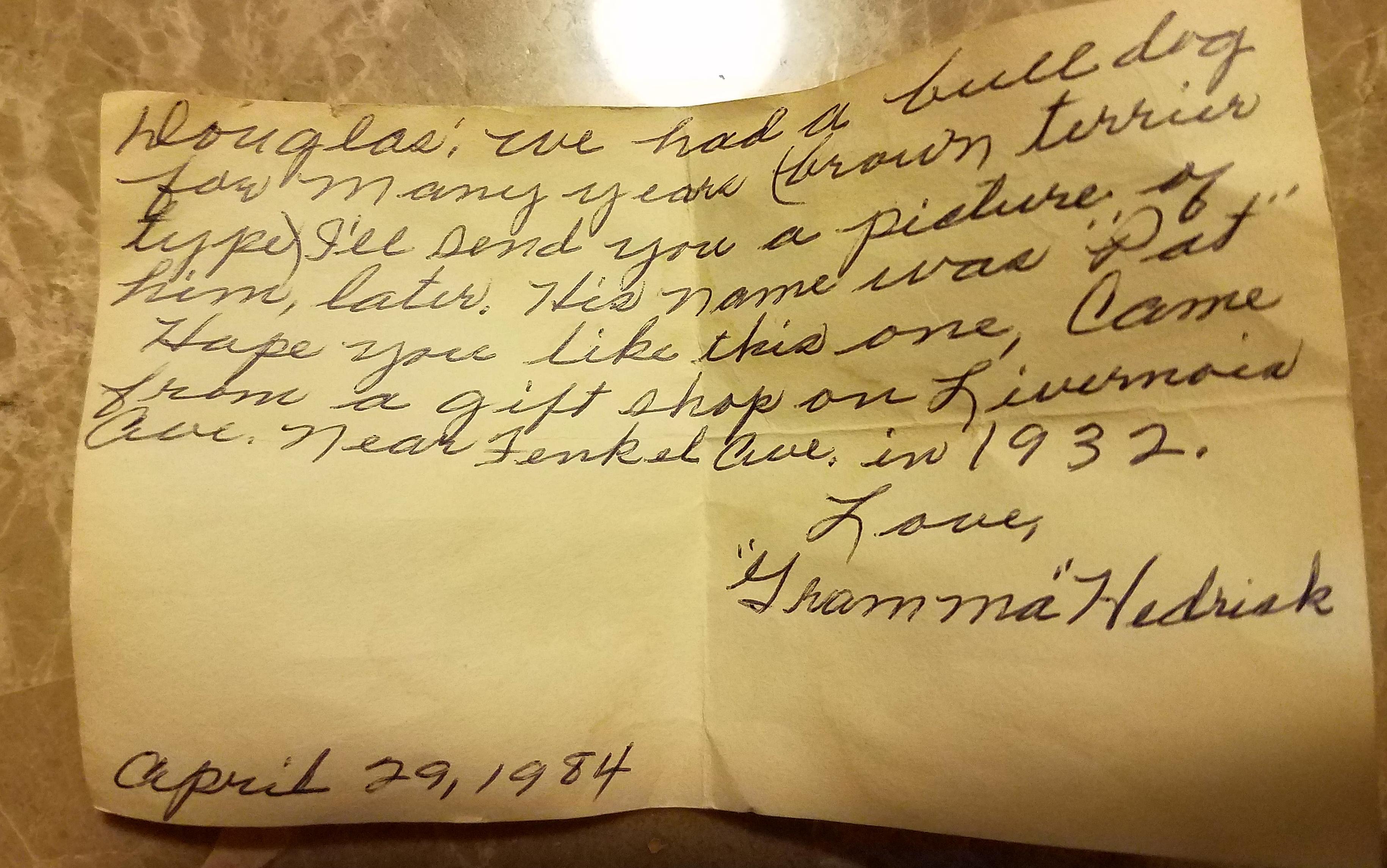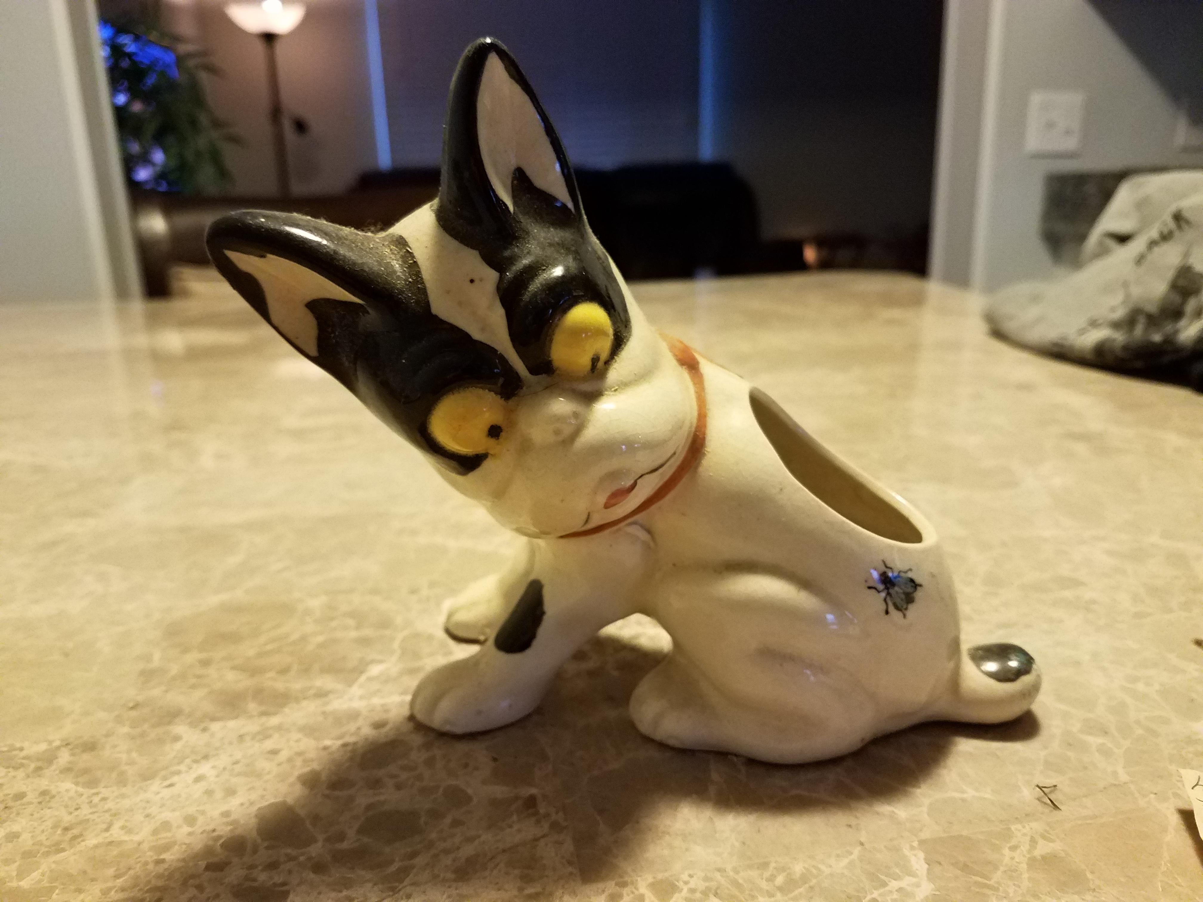 This is a French Bulldog porcelain figurine where the dog is looking at a fly on its back. My grandmother gave this to me in 1984 with a note telling me she bought it in Detroit at a store on Livernois near fenkell. She purchased it in 1932.
