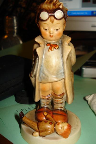 M.J. Hammond stamped on the base of figurine, Boy with goggles on his forhead, Lab jacket with scissors and knife in the pocket. boy doll lying at his feet. Markings on the bottom. Please see pictures.