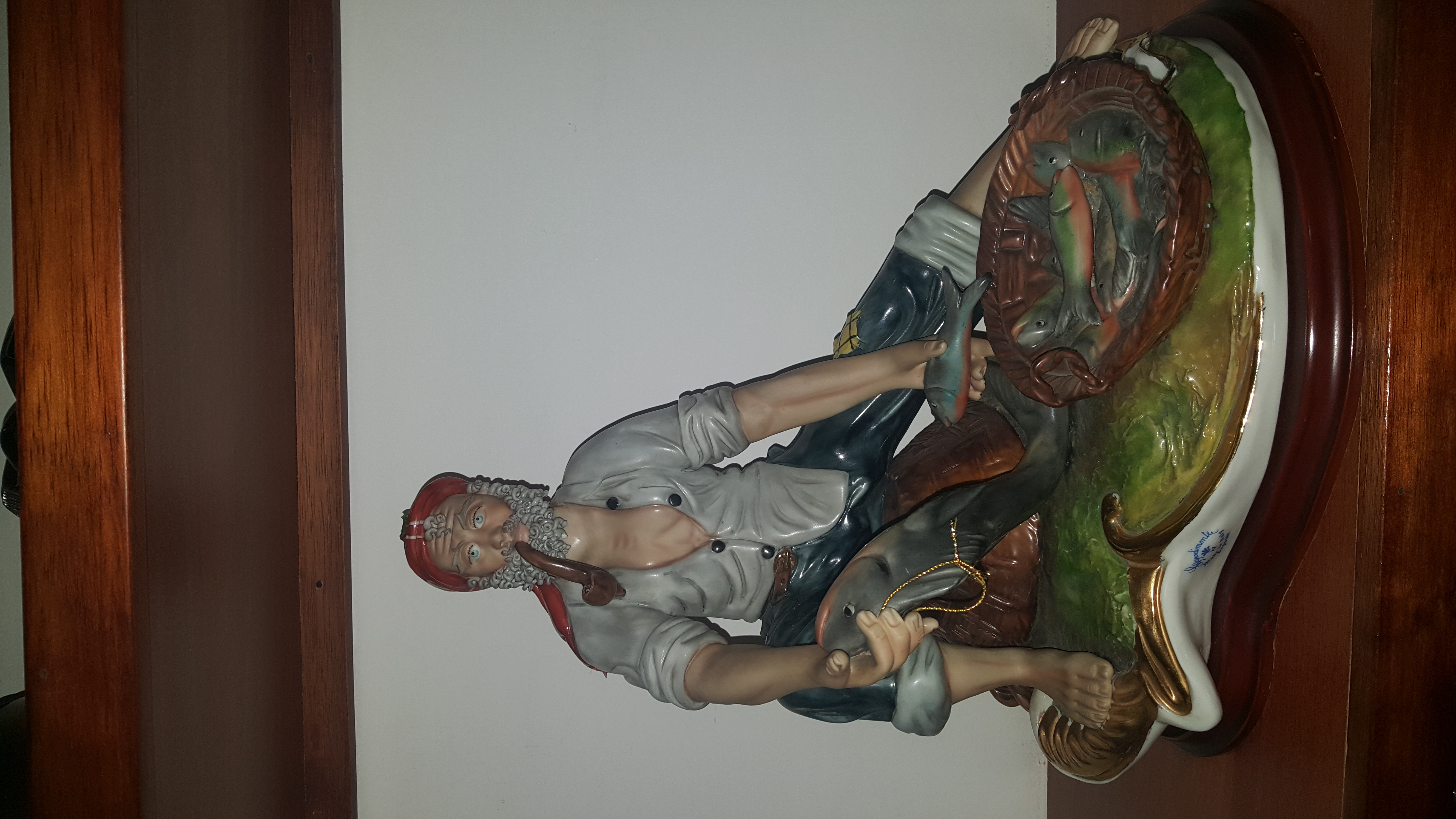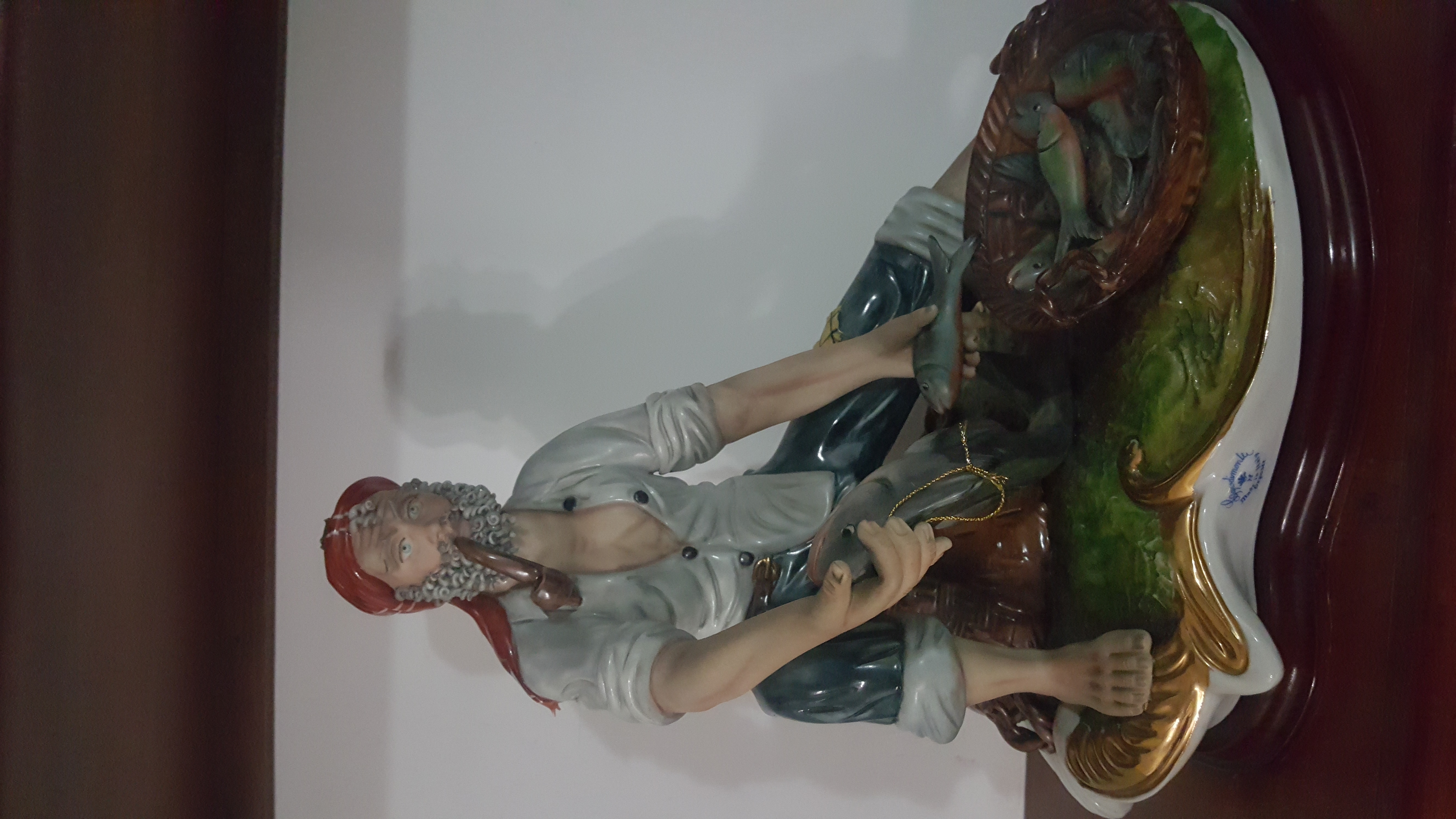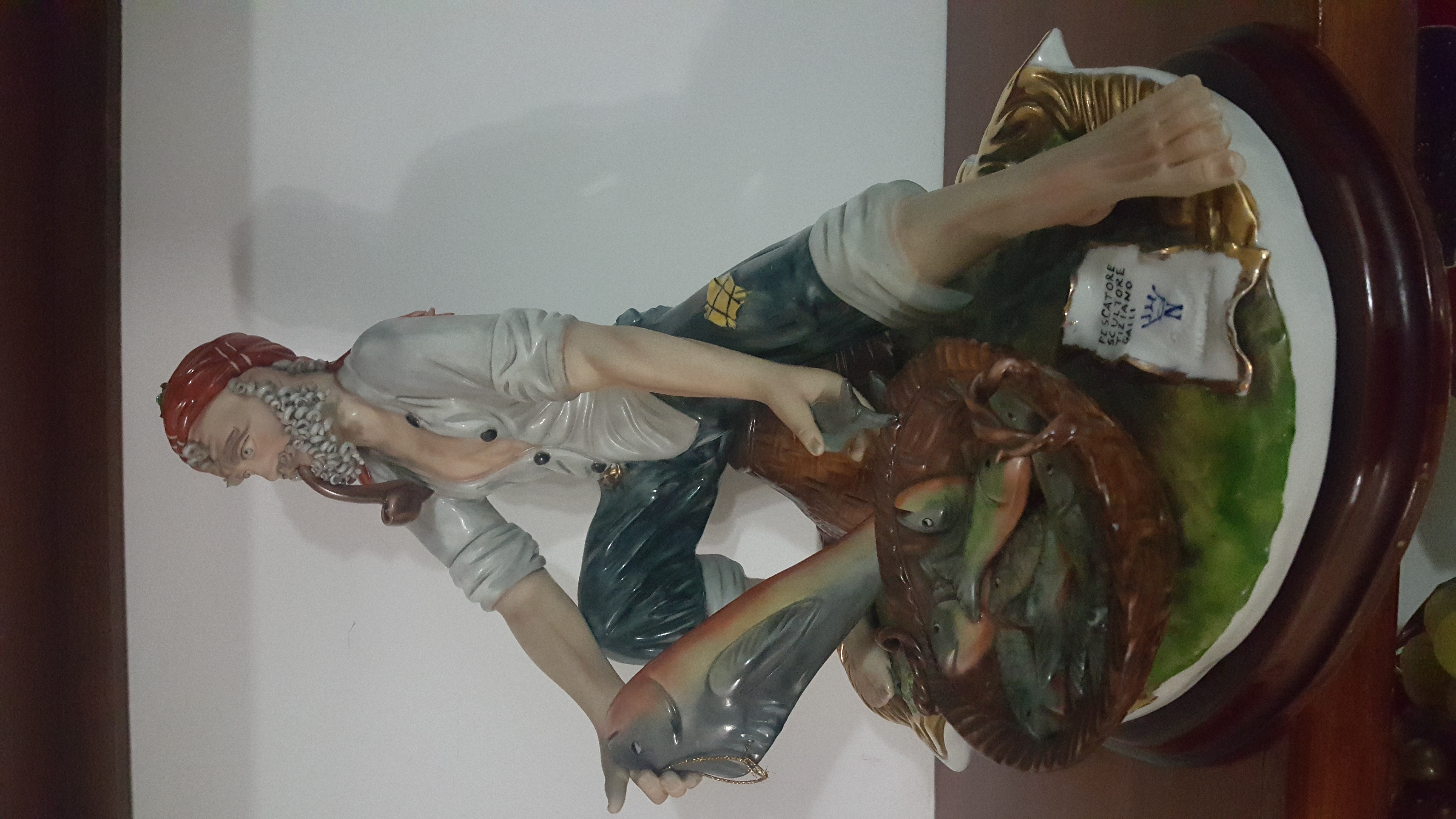 Capodimonte made in Italy fisherman holding fish. Pescatore scultore Tiziano Galli, Far West Scultore