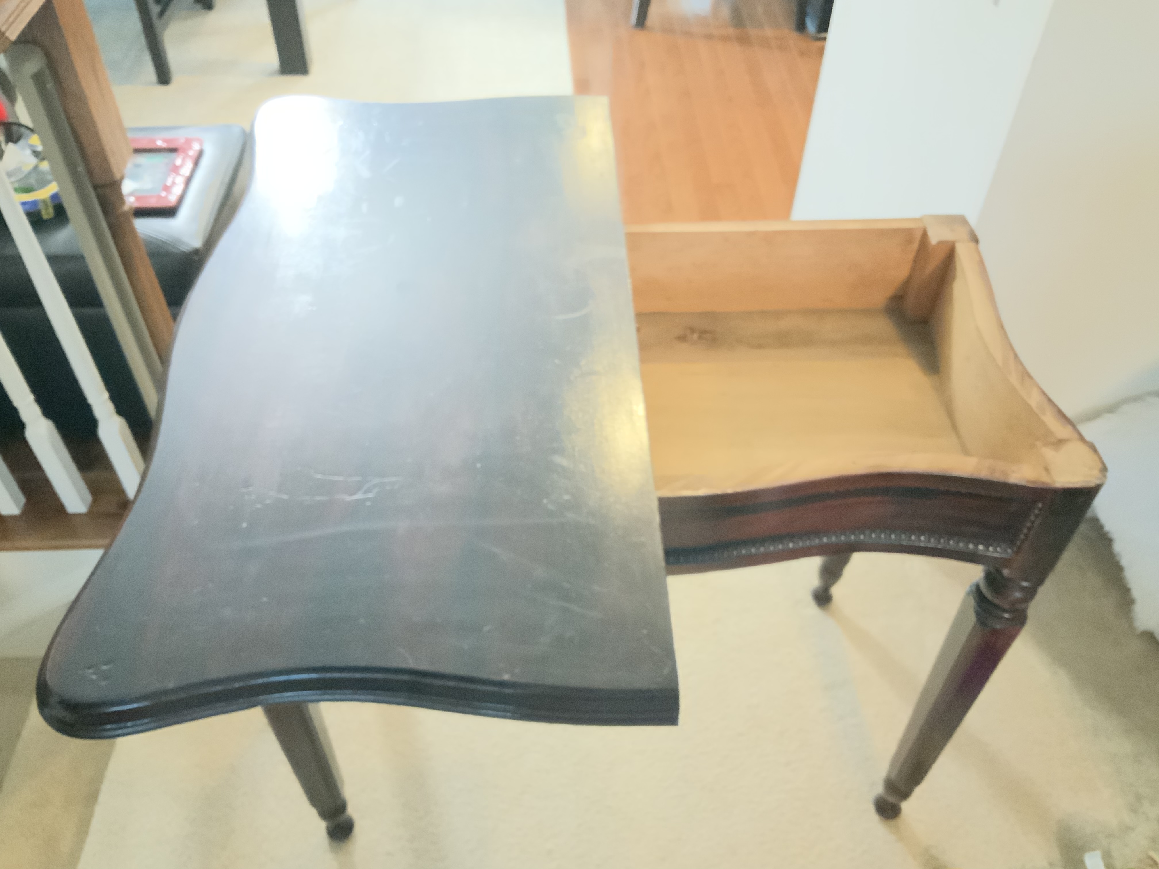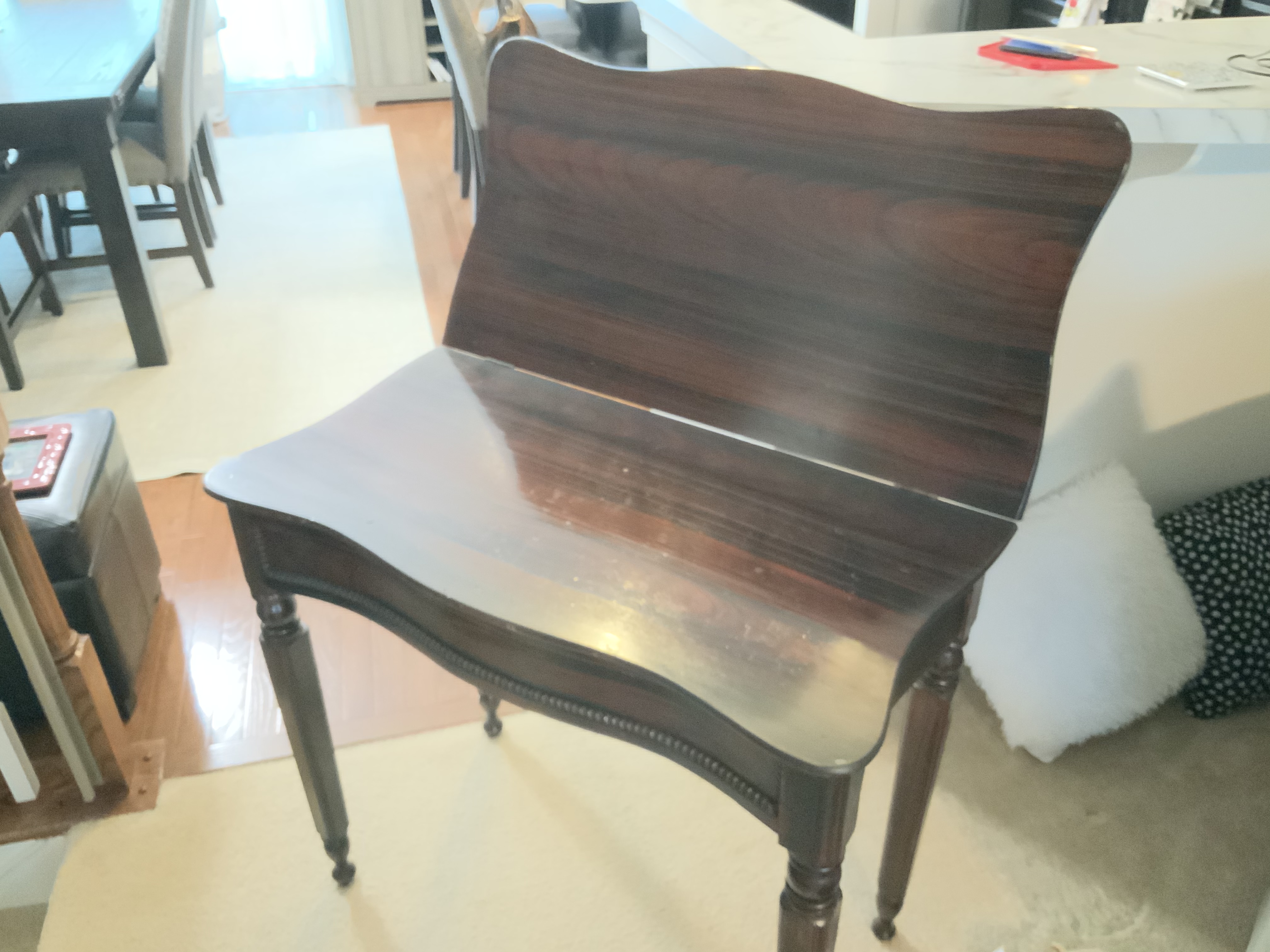 I believe this is a late 18th century table. The top flips up. With the top folded down you swivel the table to access the hidden compartment. With the swivel top there is no need for extra legs or to pull out an additional leg.