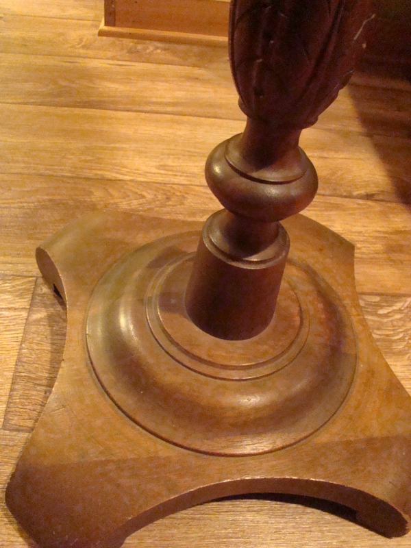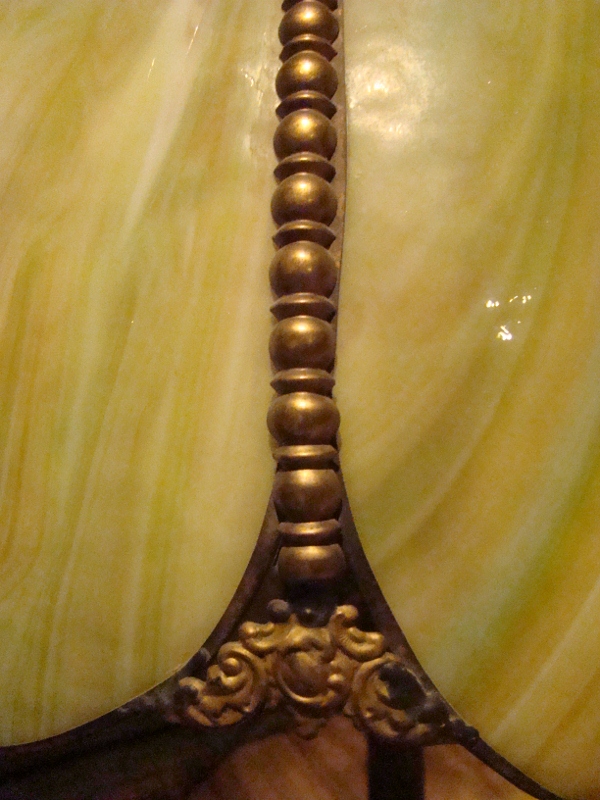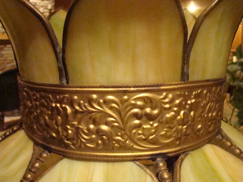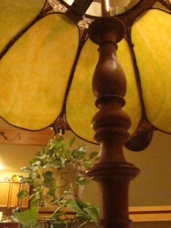 The shade of this floor lamp is assembled with what I believe to be wrapped tin. Not for sure but it is not lead wrapped I know. All decorative beading on shade is of the same tin type material. It is a double bulb, pull type chain socket. What I can make out on the bulb socket is the manufacture name (what it appears to say) Ben7amin. The base is a carved walnut, one solid piece.