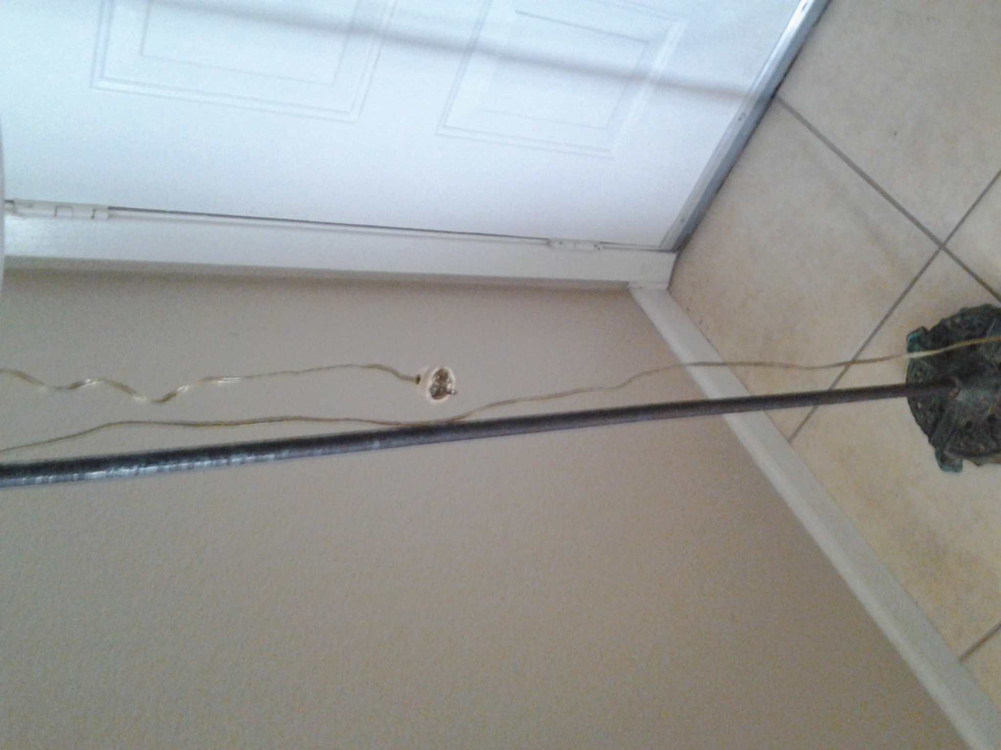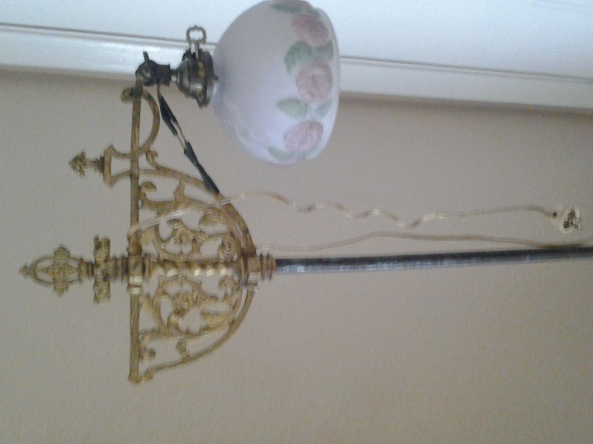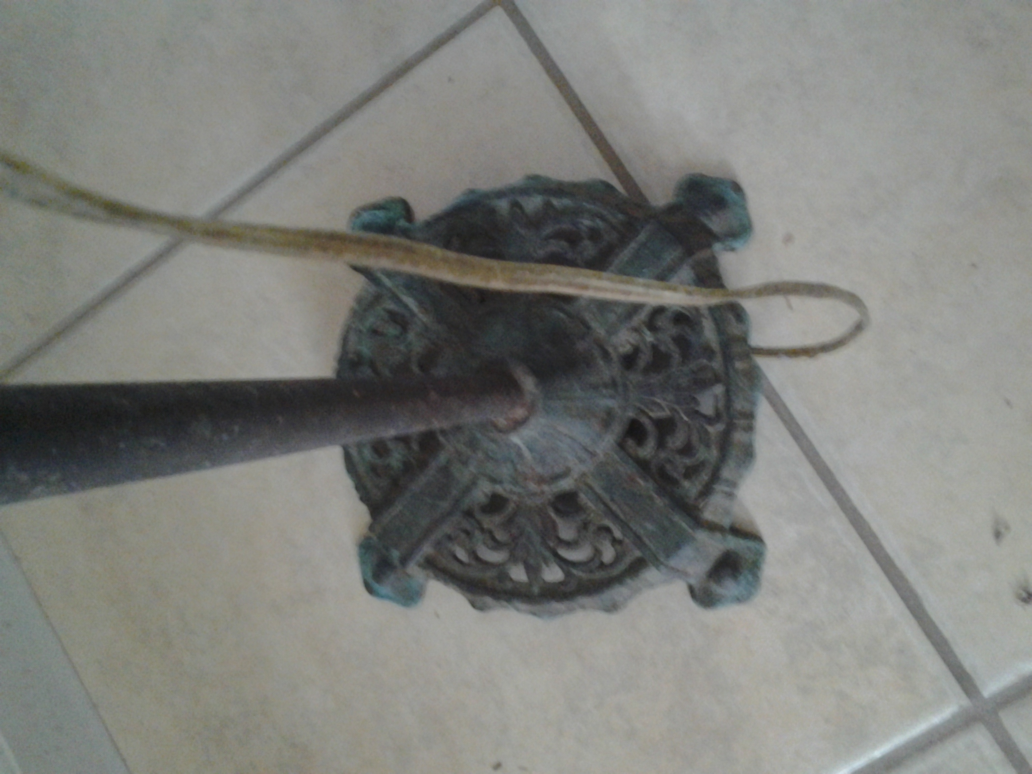 Appears to be a brass stand and top with black pole. Top is 9.5 x 15 in. 58 in. Tall.