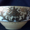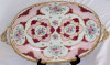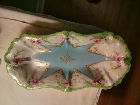 Long dish with no markings except for glazed green line on the bottom, floral pattern, has a 8 pointed blue star, raised gold dots/embellishments